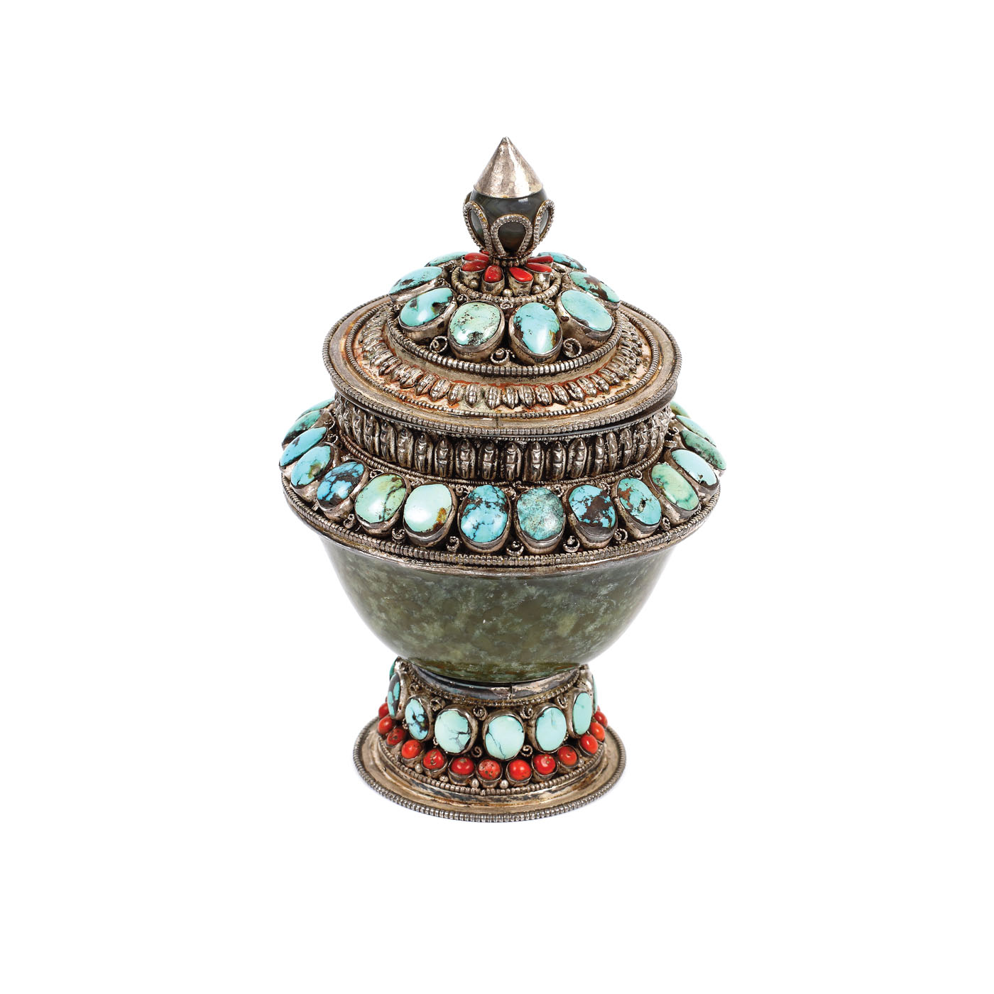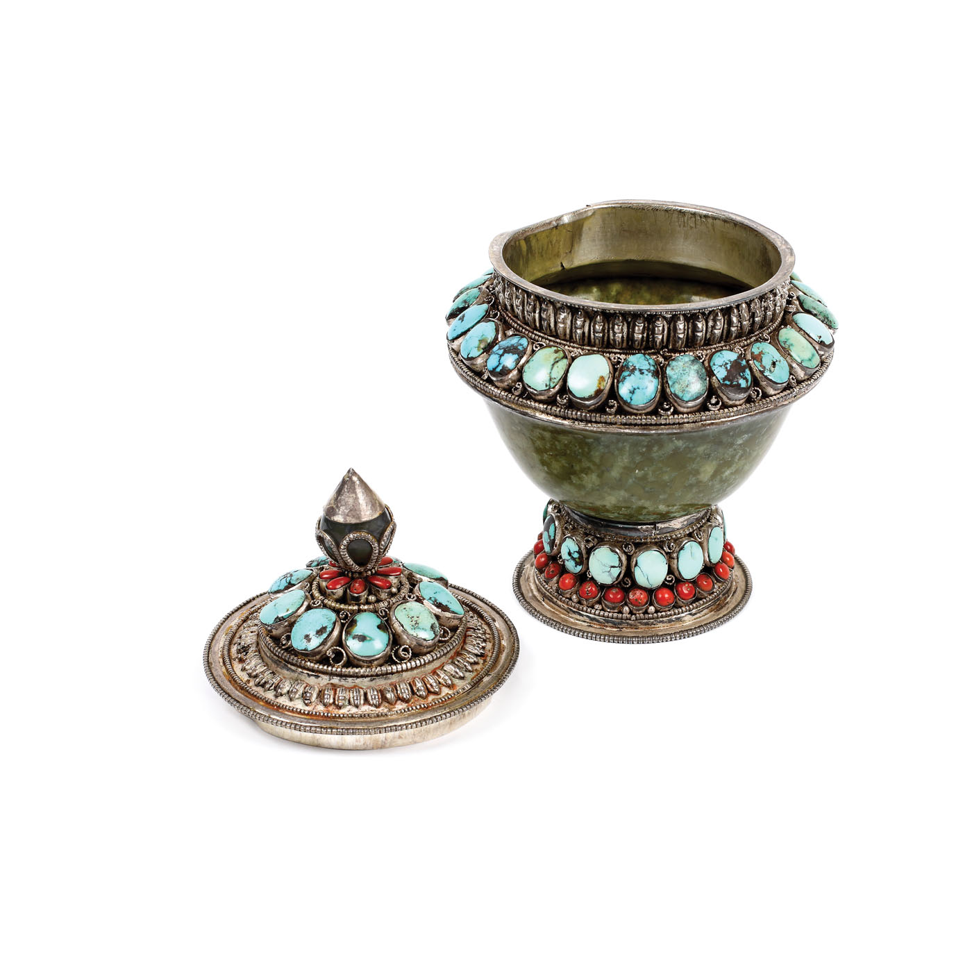 114. Set format din ceainic şi cutie pentru ceai, din argint și steatit, decorat cu motive tradiționale și pietre semiprețioase, Tibet, sec. XIX