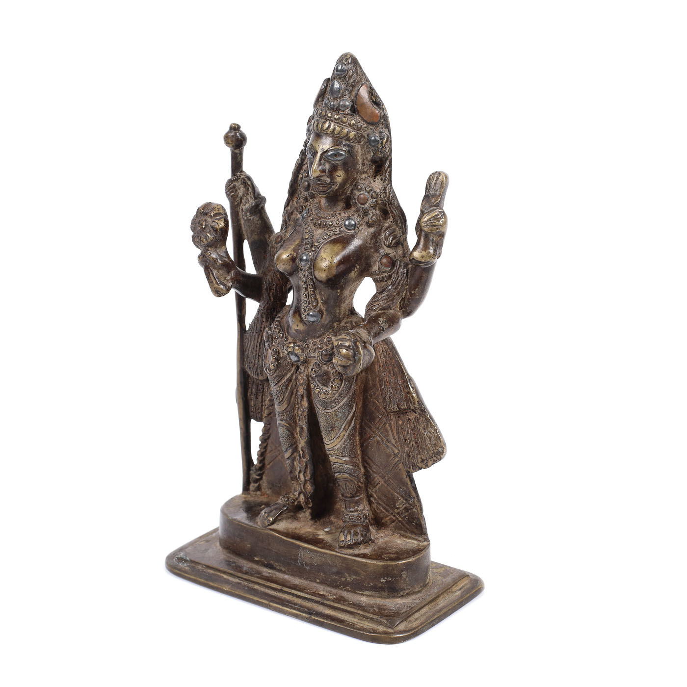 119. Statuetă din bronz, colorat cu alamă și plumb, reprezentând-o pe zeiţa Baglamukhi, una dintre ”Cele zece zeițe Tantra ale hinduismului”, India, sec. XVIII
