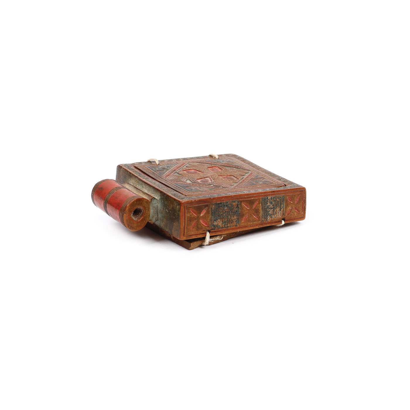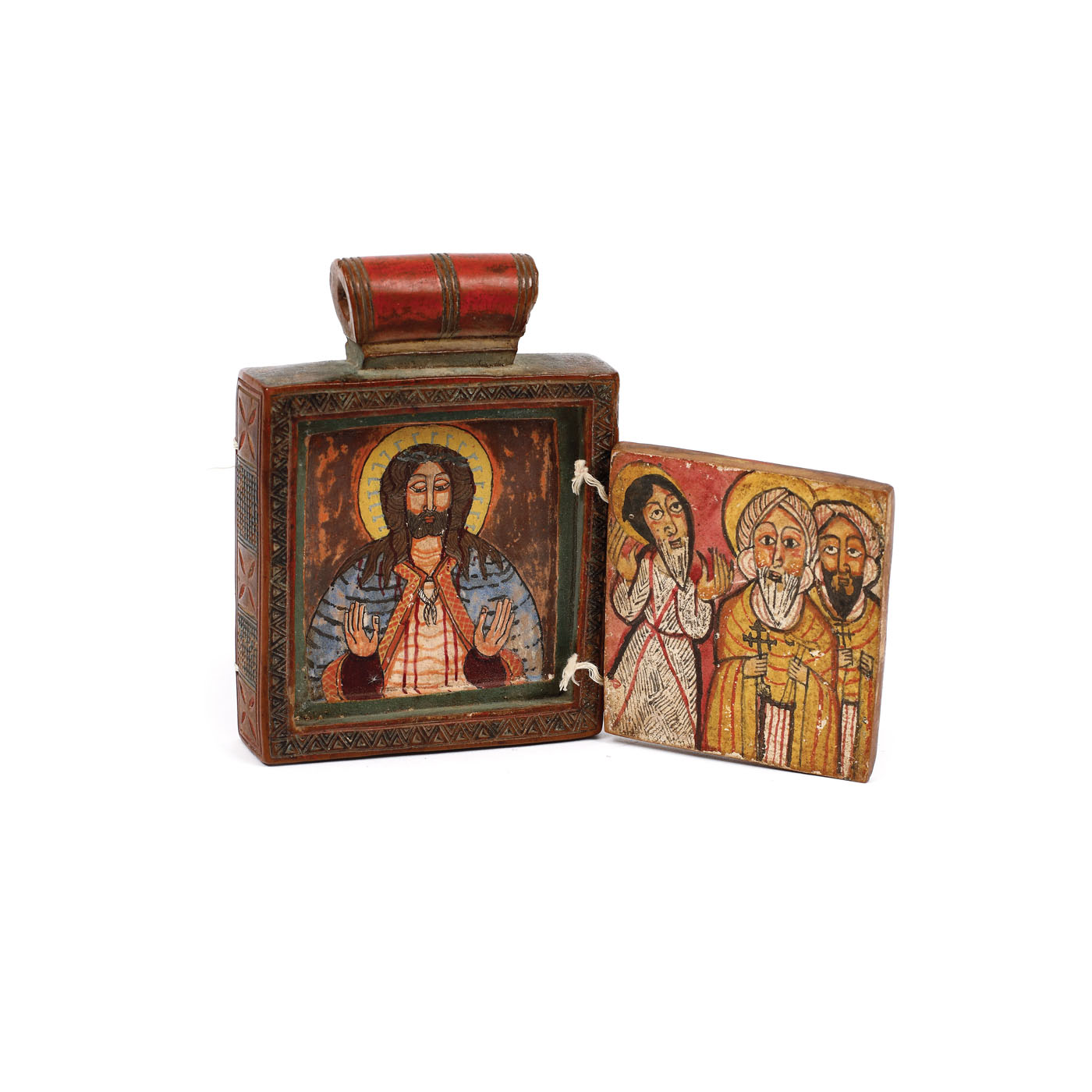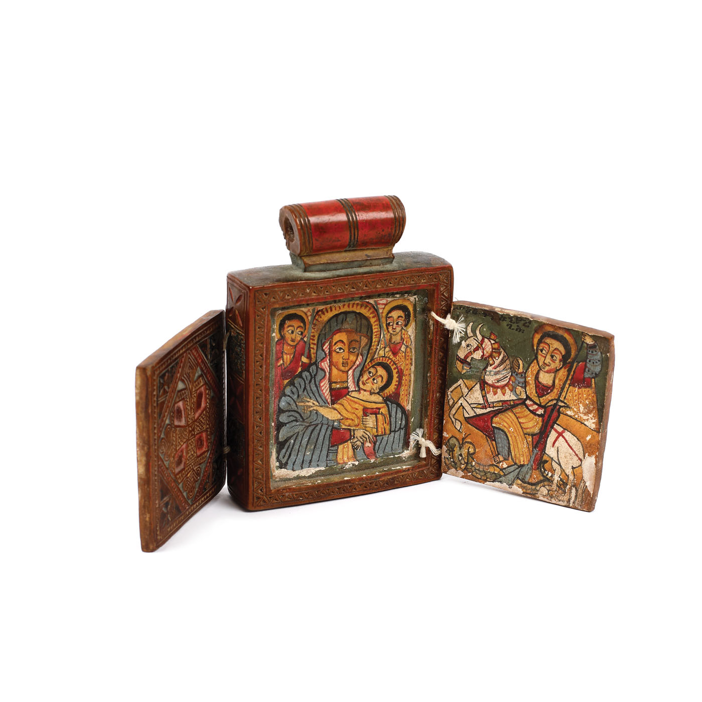 149. Triptic de călătorie din lemn exotic, ”Iisus Pantocrator, Maica Domnului cu Pruncul și Arhanghelii Mihail și Gavriil, Sfântul Gheorghe omorând balaurul etc.”, Etiopia, sec. XVIII
