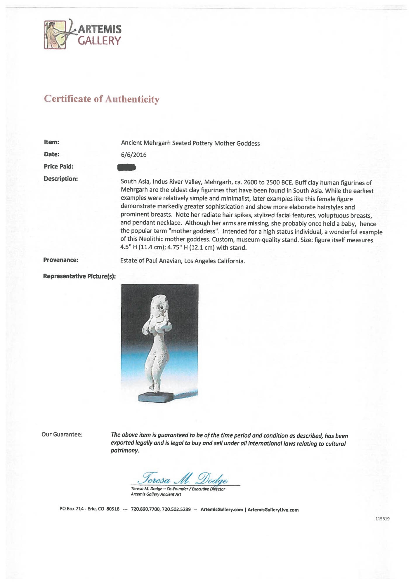 27IT. Figurină din teracotă, reprezentând o zeiță a fertilității, stil Mehrgarh, civilizația de pe Valea Indului, cca. 4000 ani vechime, sec. XX î.e.n. (însoțită de raport de expertiză)
