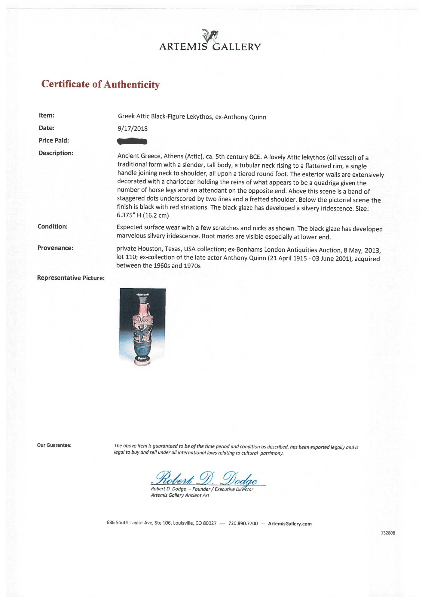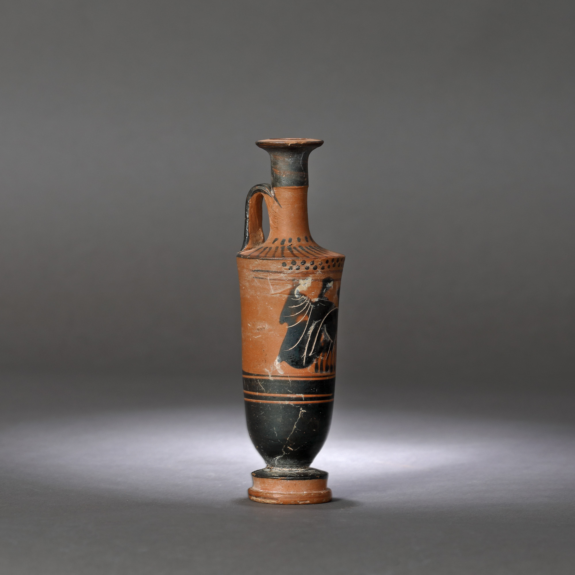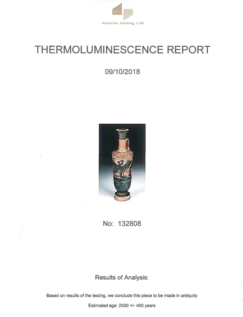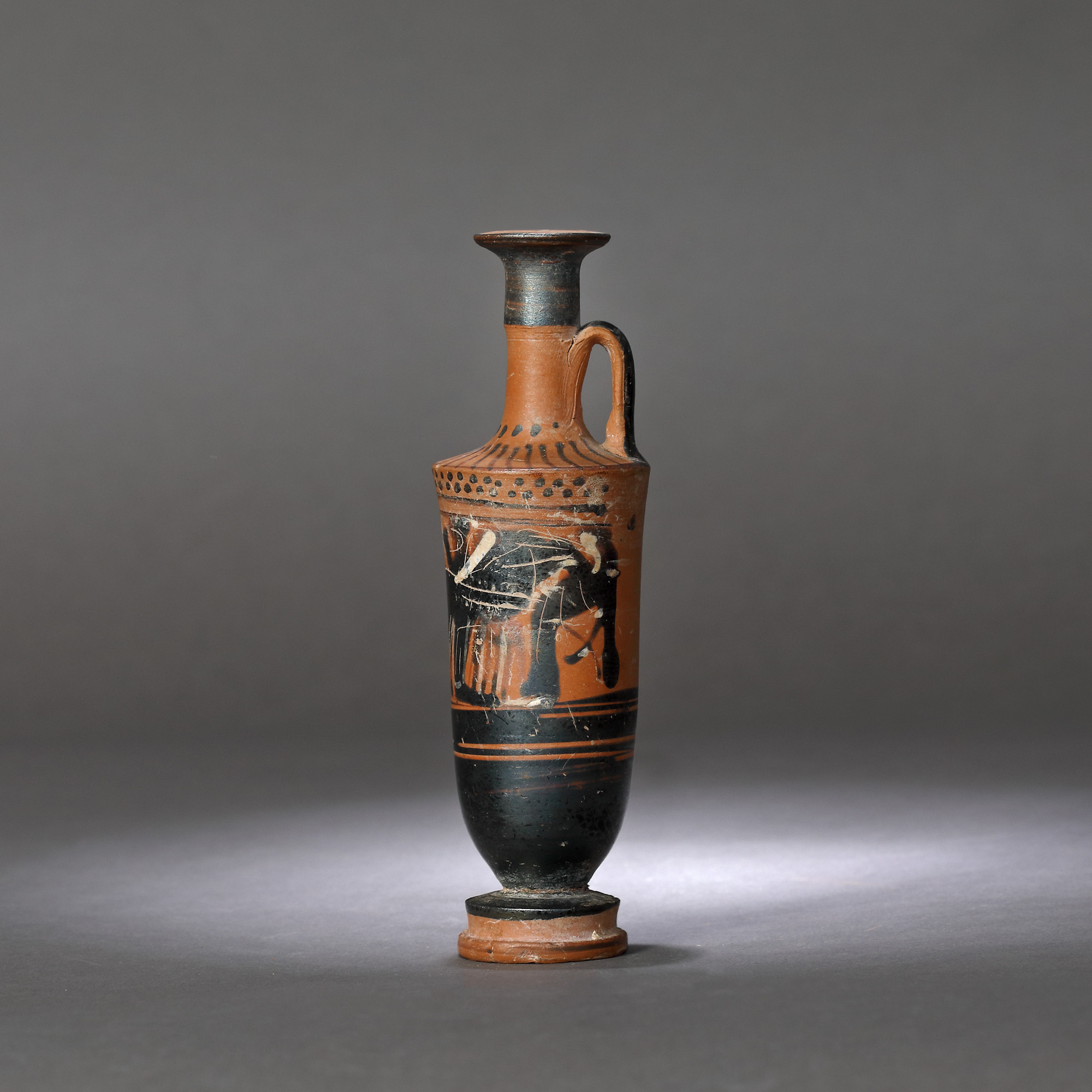 9IT. Lekythos - vas din ceramică pentru ulei parfumat, posibil folosit în ritualul nupțial, ilustrând pe Apollo într-un car tras de lei, lupi și mistreți, Grecia clasică, cca. 2500 ani vechime, sec. V î.e.n. (însoțit de raport de expertiză)