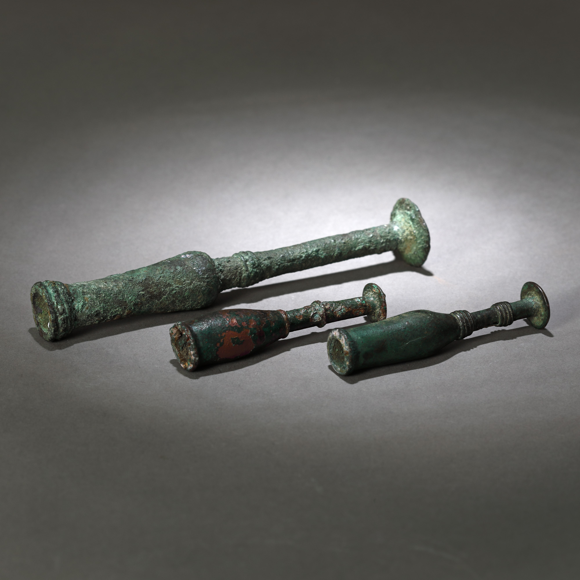 18C. Lot format din trei sfeșnice din bronz, posibil Luristan, Persia, prima parte a mileniului I î.e.n