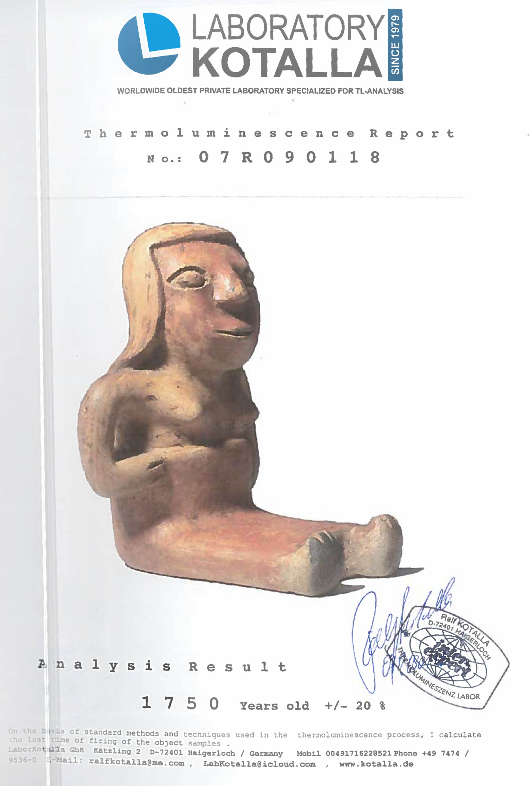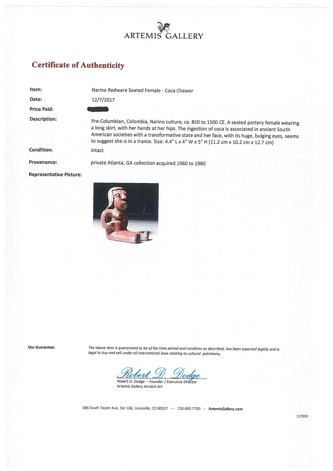 40IT. Statuetă din ceramică, ilustrând o figură feminină, aparținând culturii Narino, Columbia, cca. 1750 vechime, sec. III (însoțită de raport de expertiză)