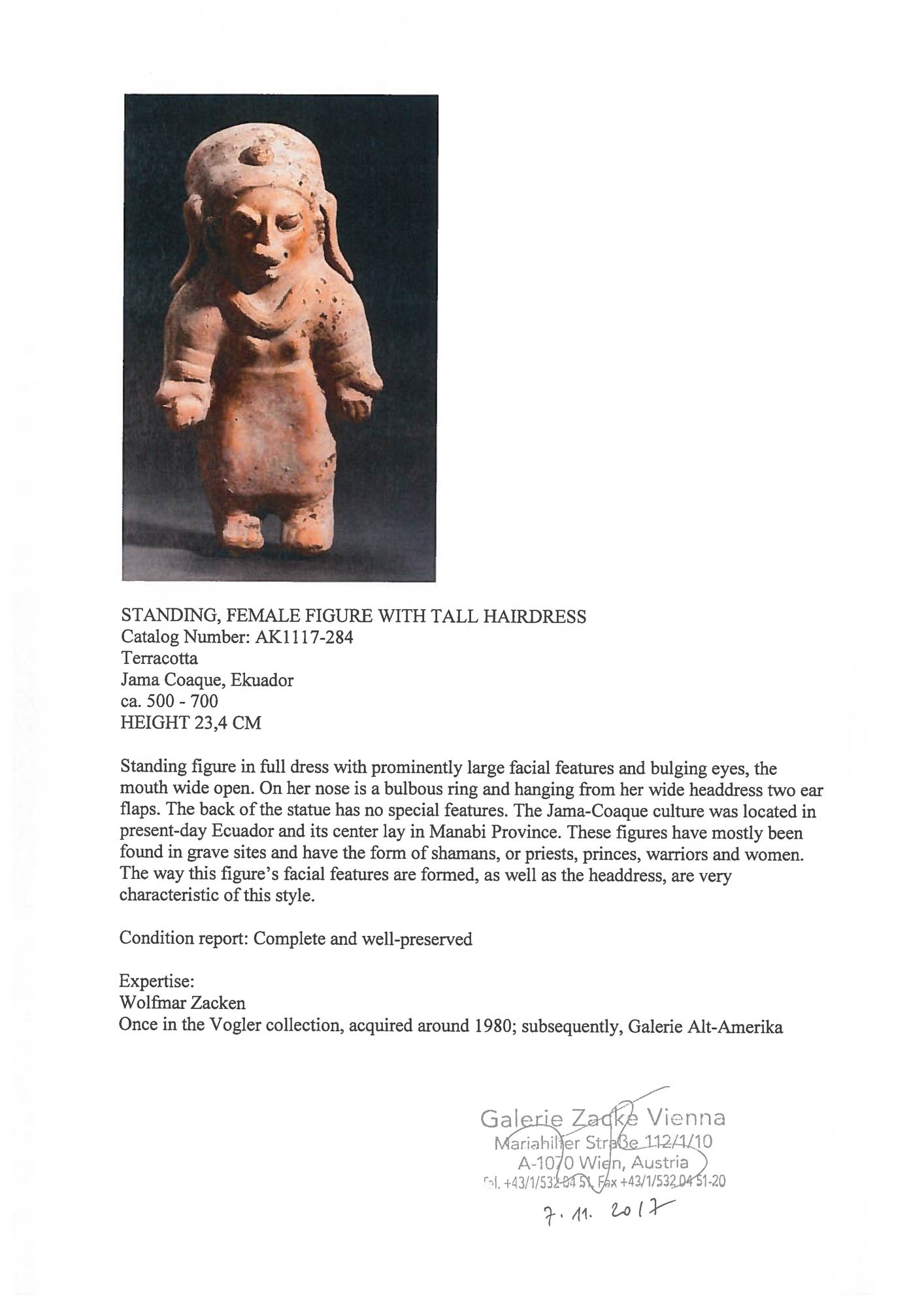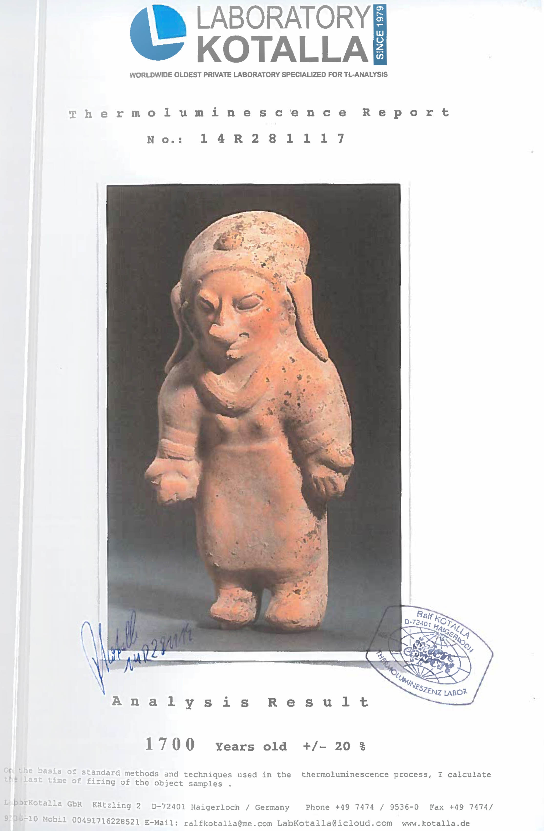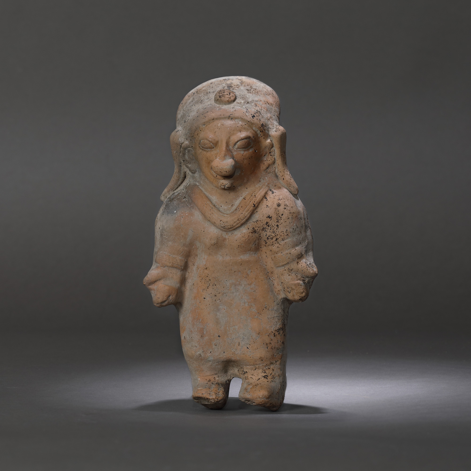 41. Statuetă din teracotă, ilustrând o figură feminină, aparținând culturii Jama Coaque, Ecuador, cca. 1700 ani vechime (însoțită de raport de expertiză)