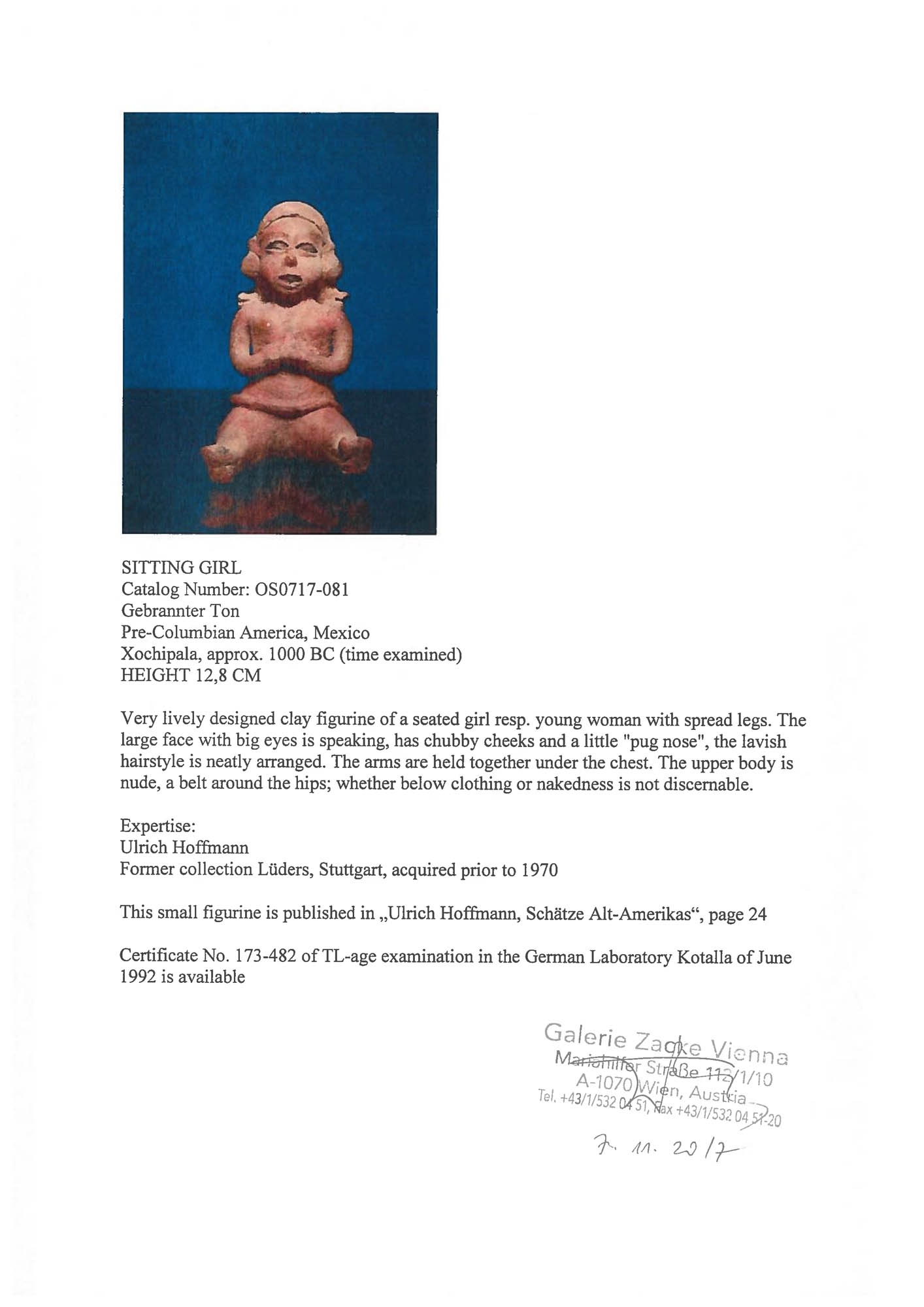 32IT. Statuetă din teracotă, reprezentând o figură feminină, aparținând culturii Xochipala Olmec, Mexic, cca. 3000 vechime, sec. X î.e.n. (însoțită de raport de expertiză)