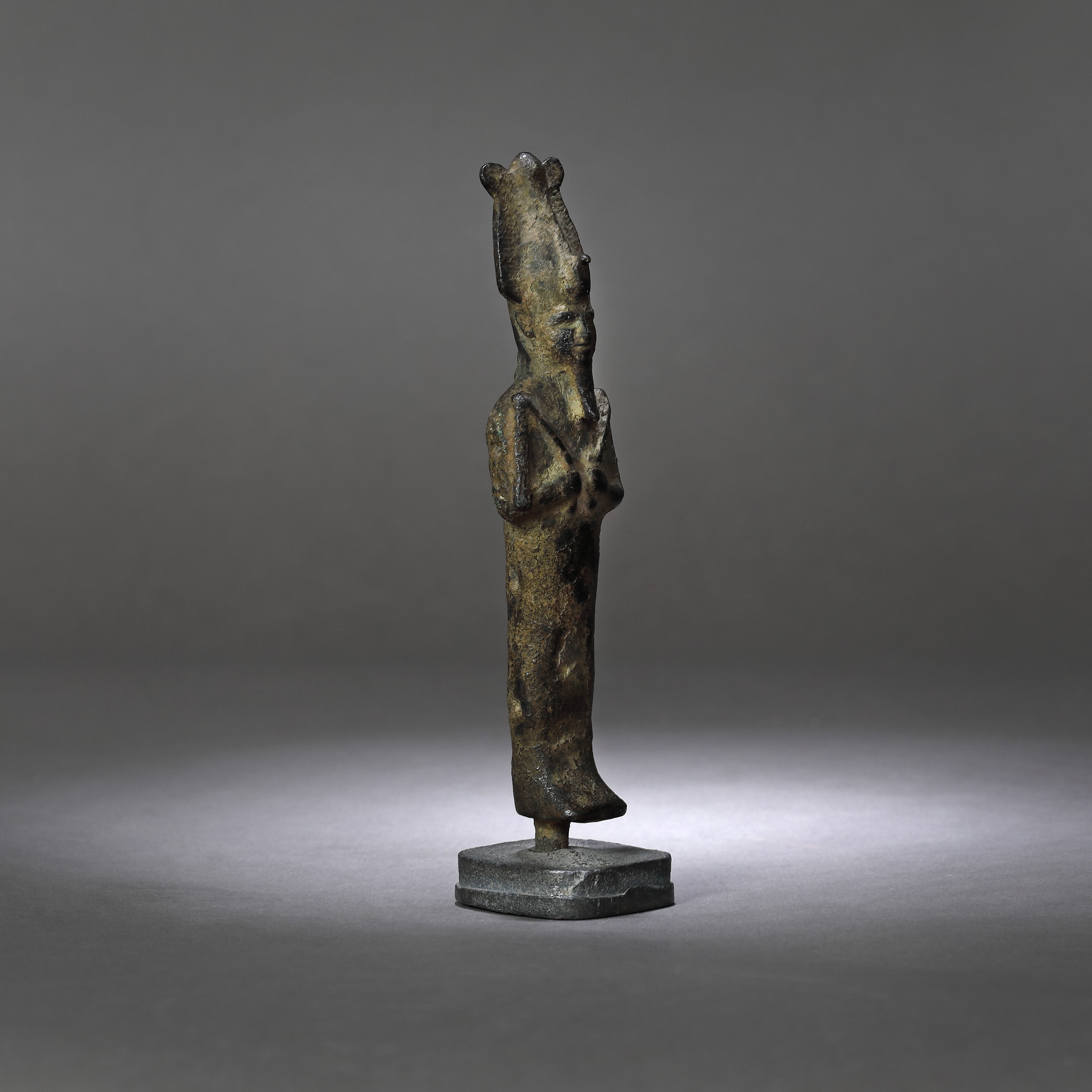 19C. Statuetă egipteană din bronz, reprezentând pe Osiris (zeul vieții, al vieții de apoi și al învierii), probabil Perioada a 3-a Intermediară, sec. VIII-V î.e.n.