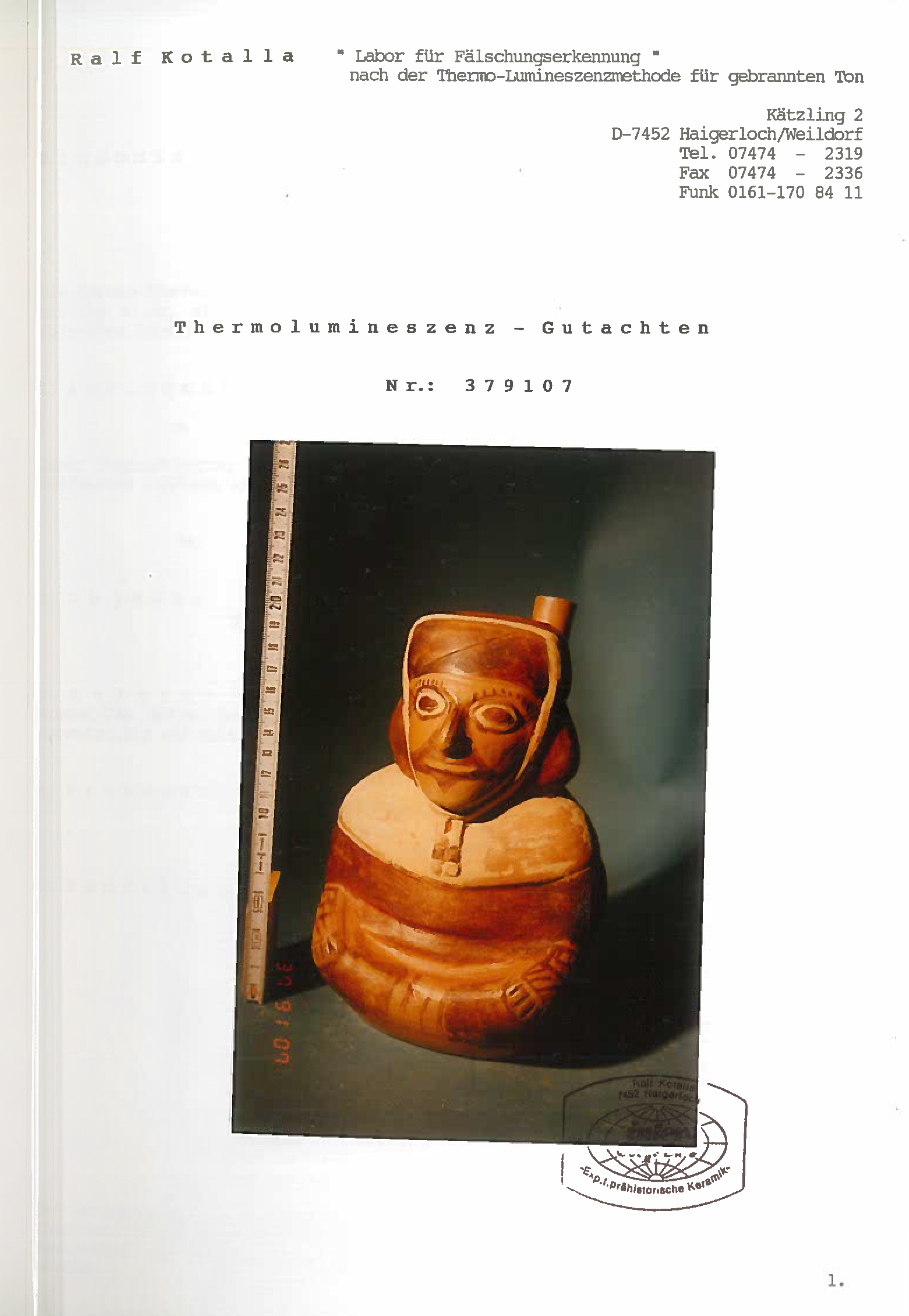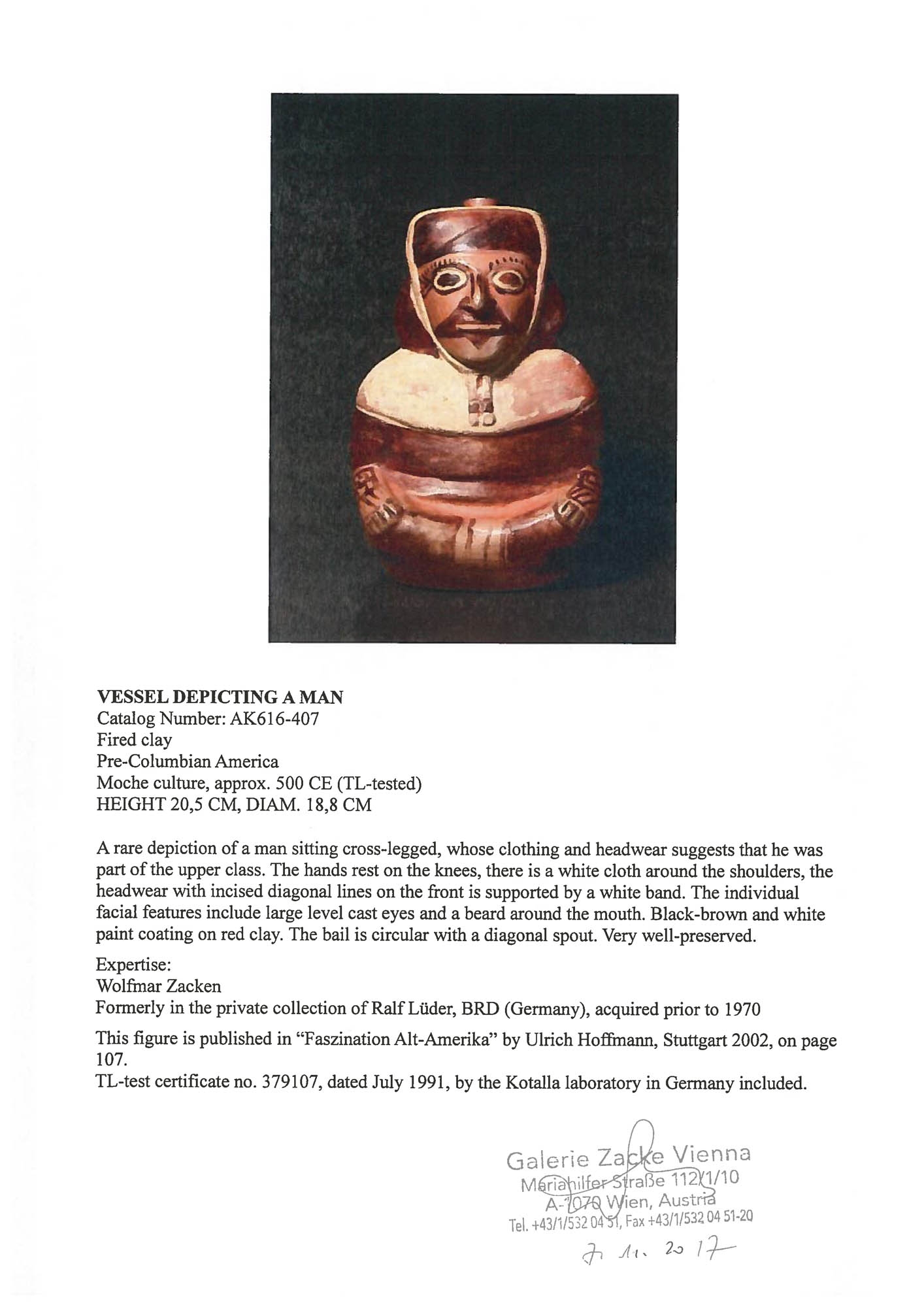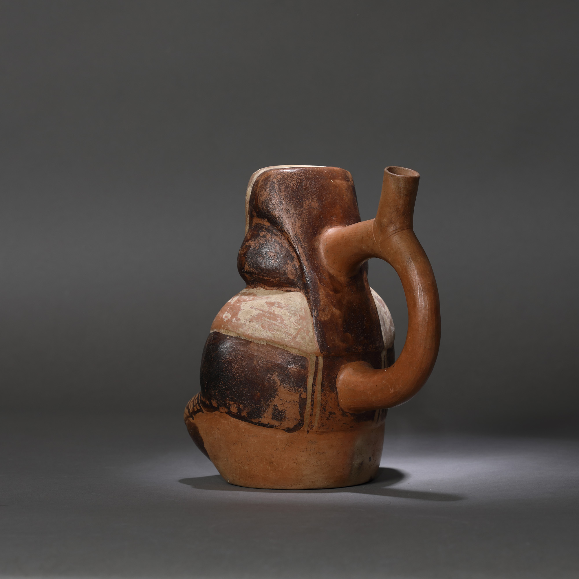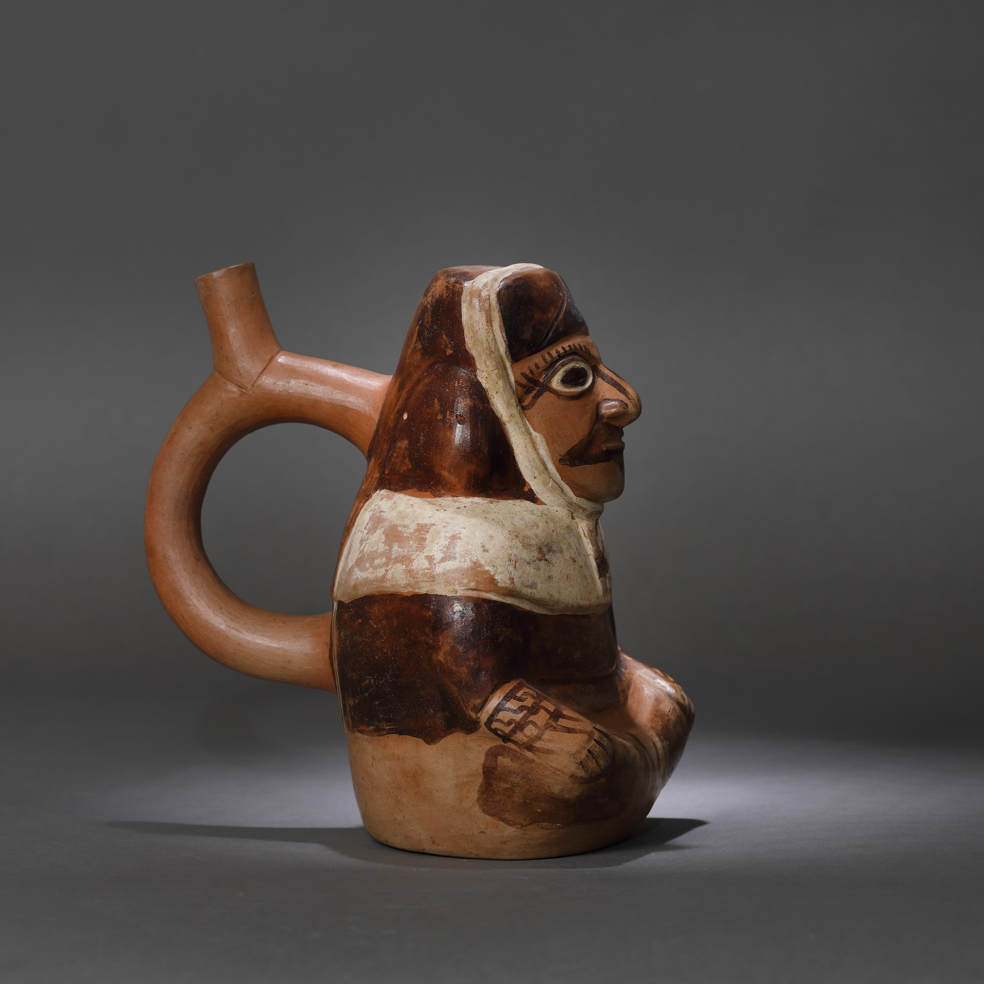 33IT. Vas din ceramică, ilustrând o figură masculină, aparținând culturii Moche, Peru, cca. 1500 ani vechime, sec. VI (însoțit de raport de expertiză)