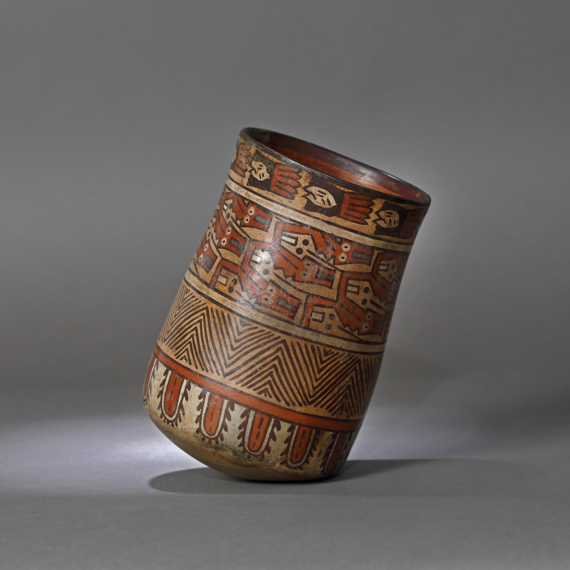 Influențate de motivele specifice culturii Paracas, vasele de ceramică Nazca au fost pictate înainte de ardere pentru a produce o gamă largă de nuanțe vii. Vasele sunt decorate cu o varietate nesfârșită de reprezentări ale zeilor dar și ale oamenilor (reprezentări abstracte, deseori femei, doar fețe), șamani în diferite stadii de transfigurare, crustacee, balene ucigașe, condori și alte păsări prădătoare, maimuțe, șopârle, insecte, capete de trofee, victime decapitate și creaturi mitice, în special feline stilizate. În cazul de față avem reprezentate o serie de capete decapitate, probabil ale unor șamani sau conducători de trib, posibil reprezentând în ansamblu un sacrificiu adus zeilor.
