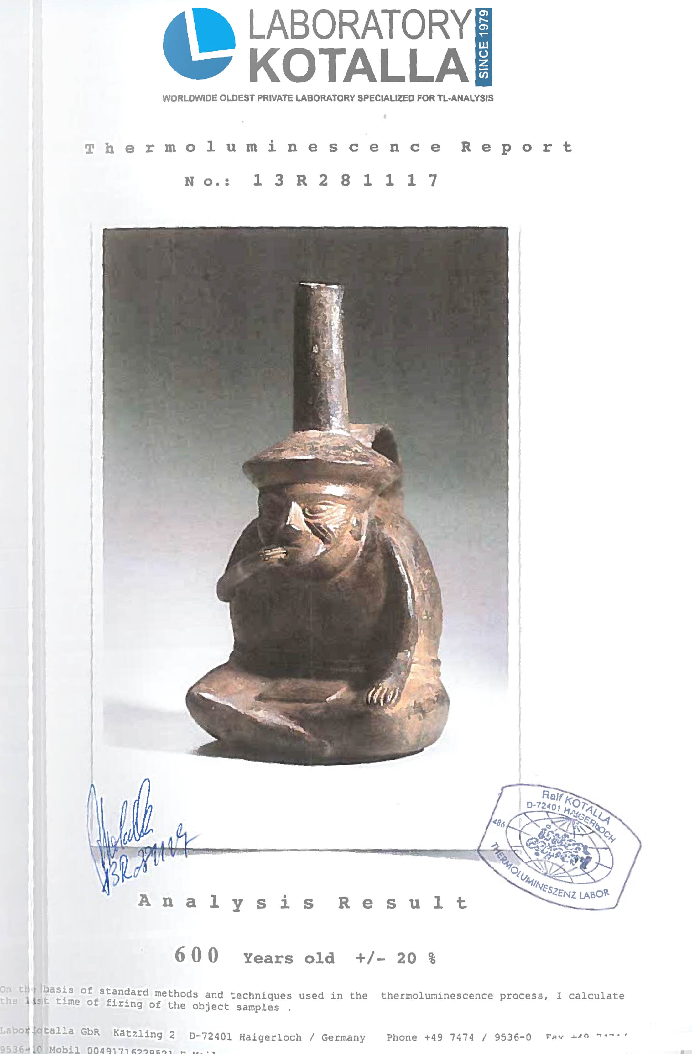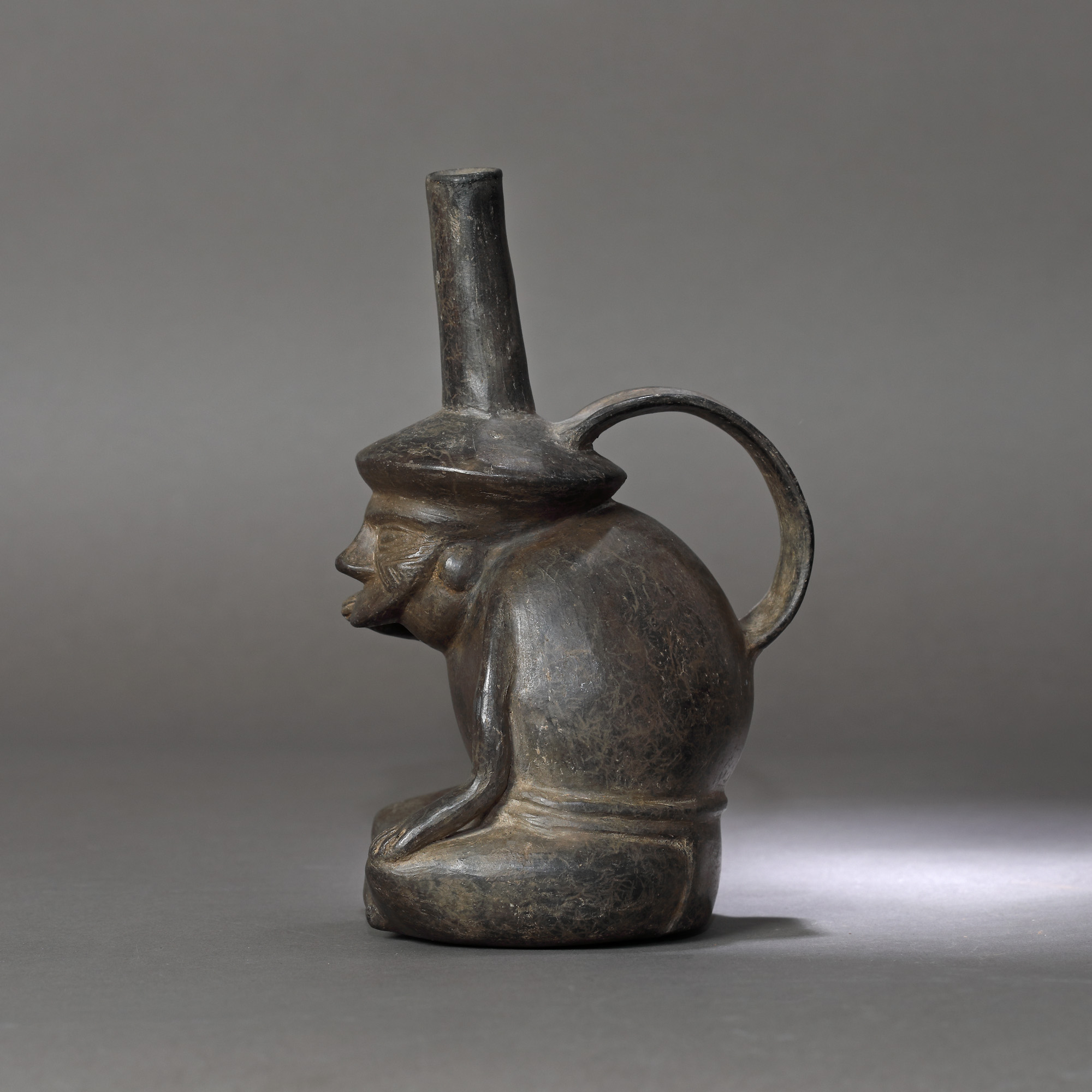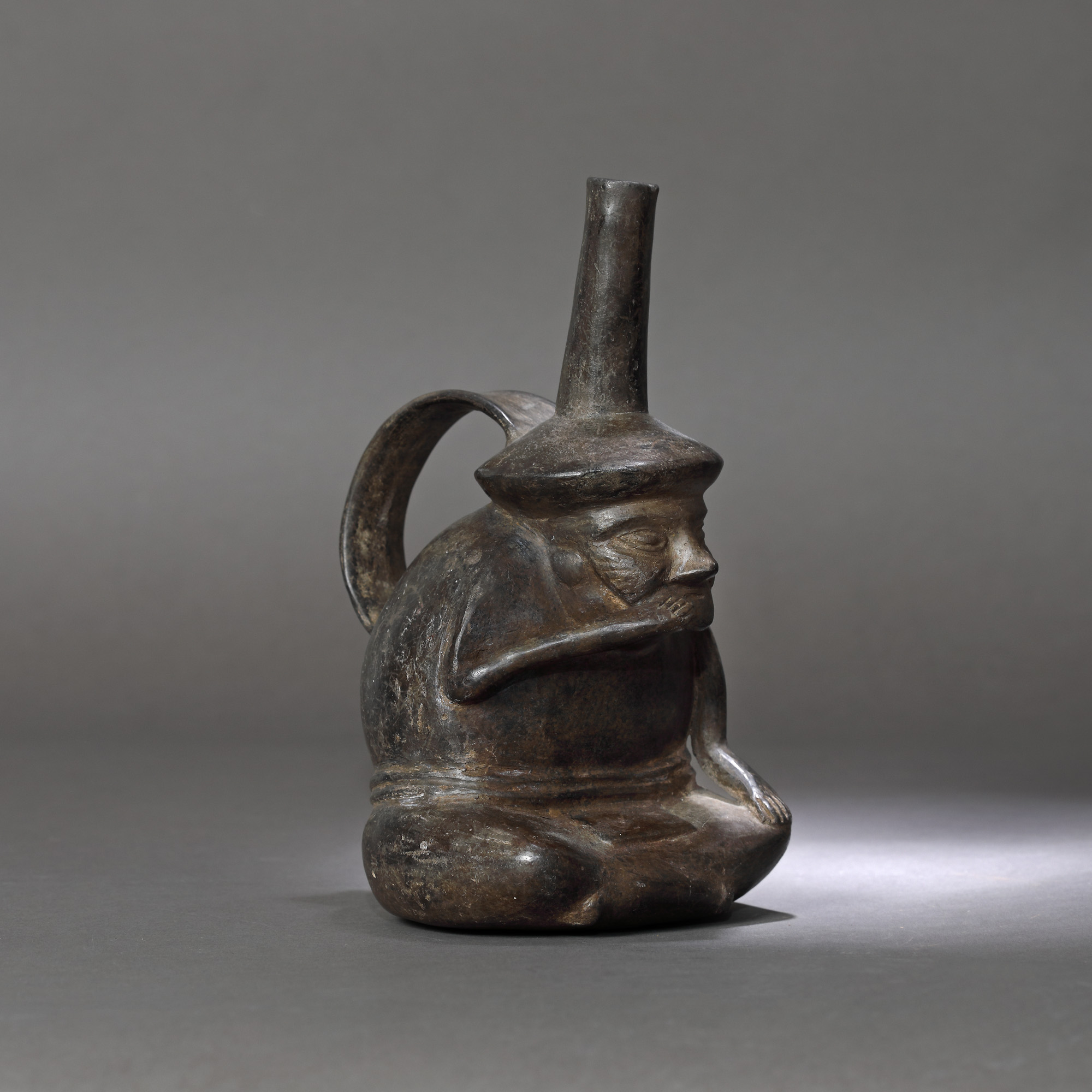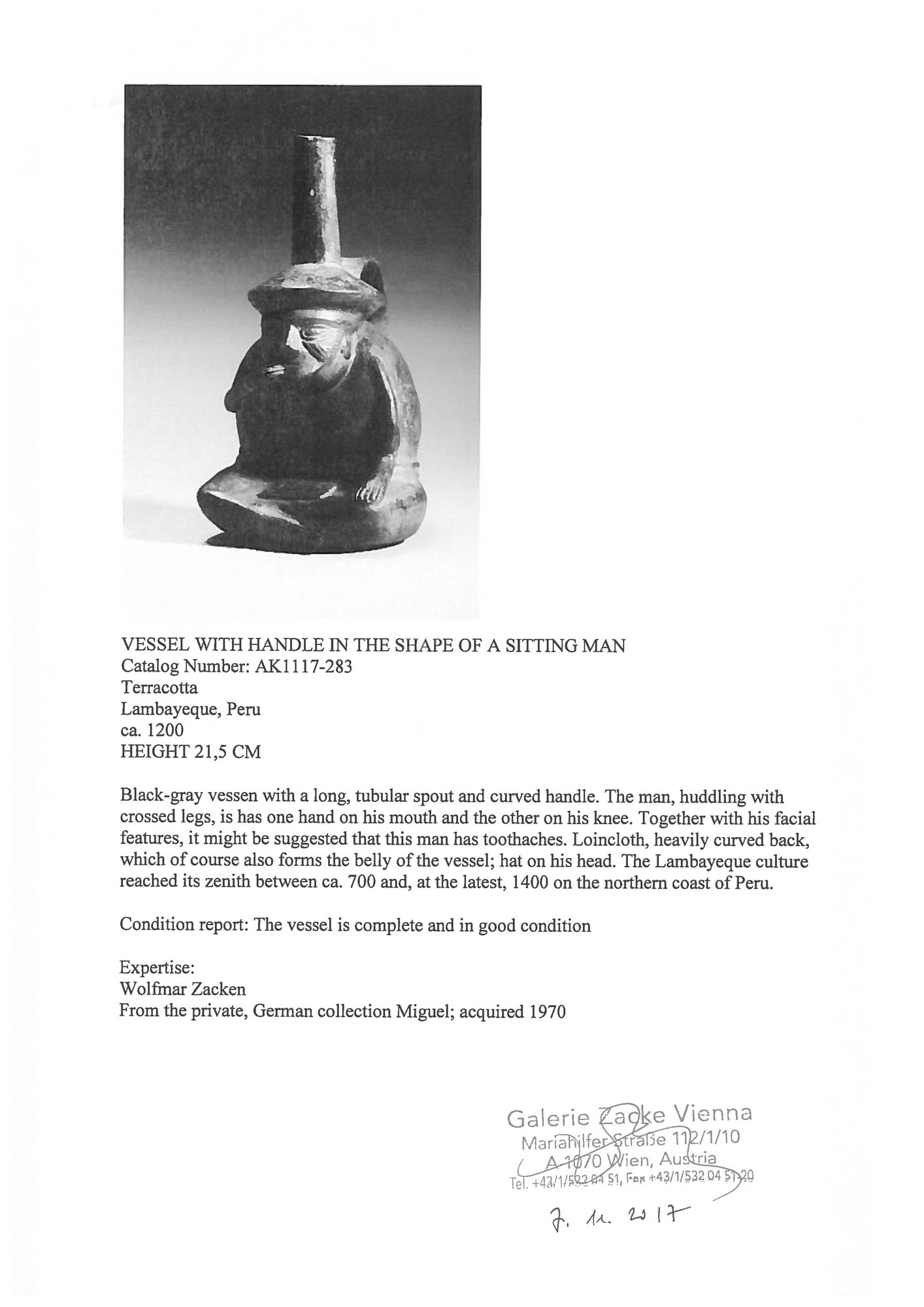 26IT. Vas din ceramică, reprezentând o figură masculină șezând, aparținând culturii Lambayeque-Sicán, Peru, cca. 600 ani vechime, sec. XV (însoțit de raport de expertiză)