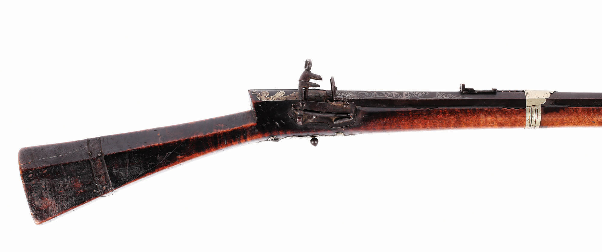 Pușcă otomană, cu cremene, cu țeava ghintuită, datând de la sfârșitul sec. XVIII, din perioada războaielor ruso-turce, multe purtate pe teritoriile românești. Arma prezintă o inscripție în limba arabă pe partea superioară a mecanismului.
