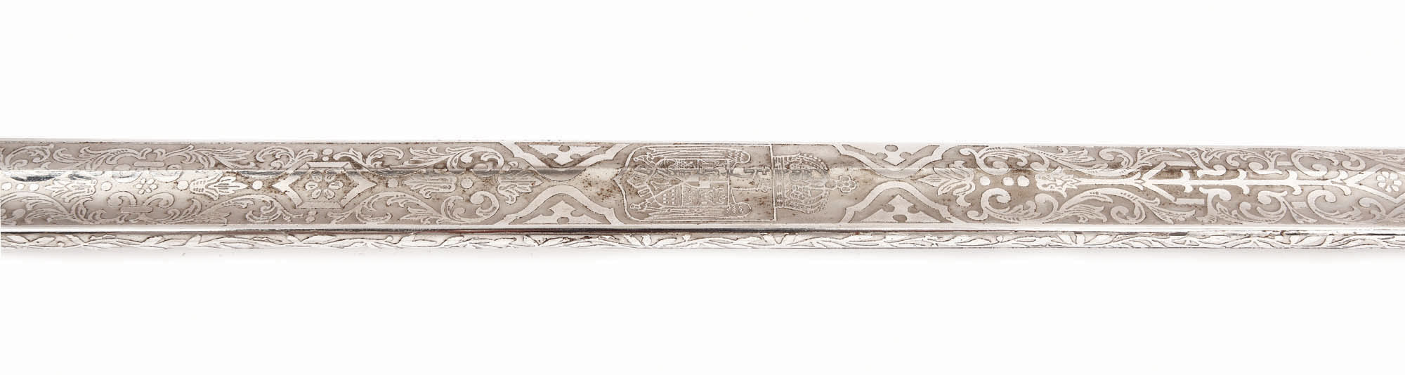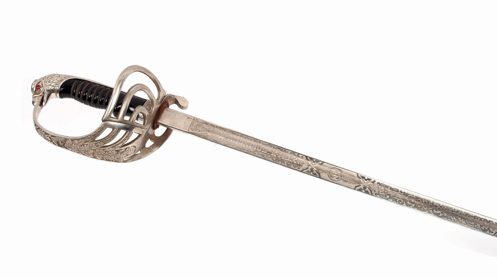 140. Sabie de paradă, fără teacă, purtând cifrul Regelui Carol al II-lea, marcată pe gardă "Premiul I ARMA, 1938"