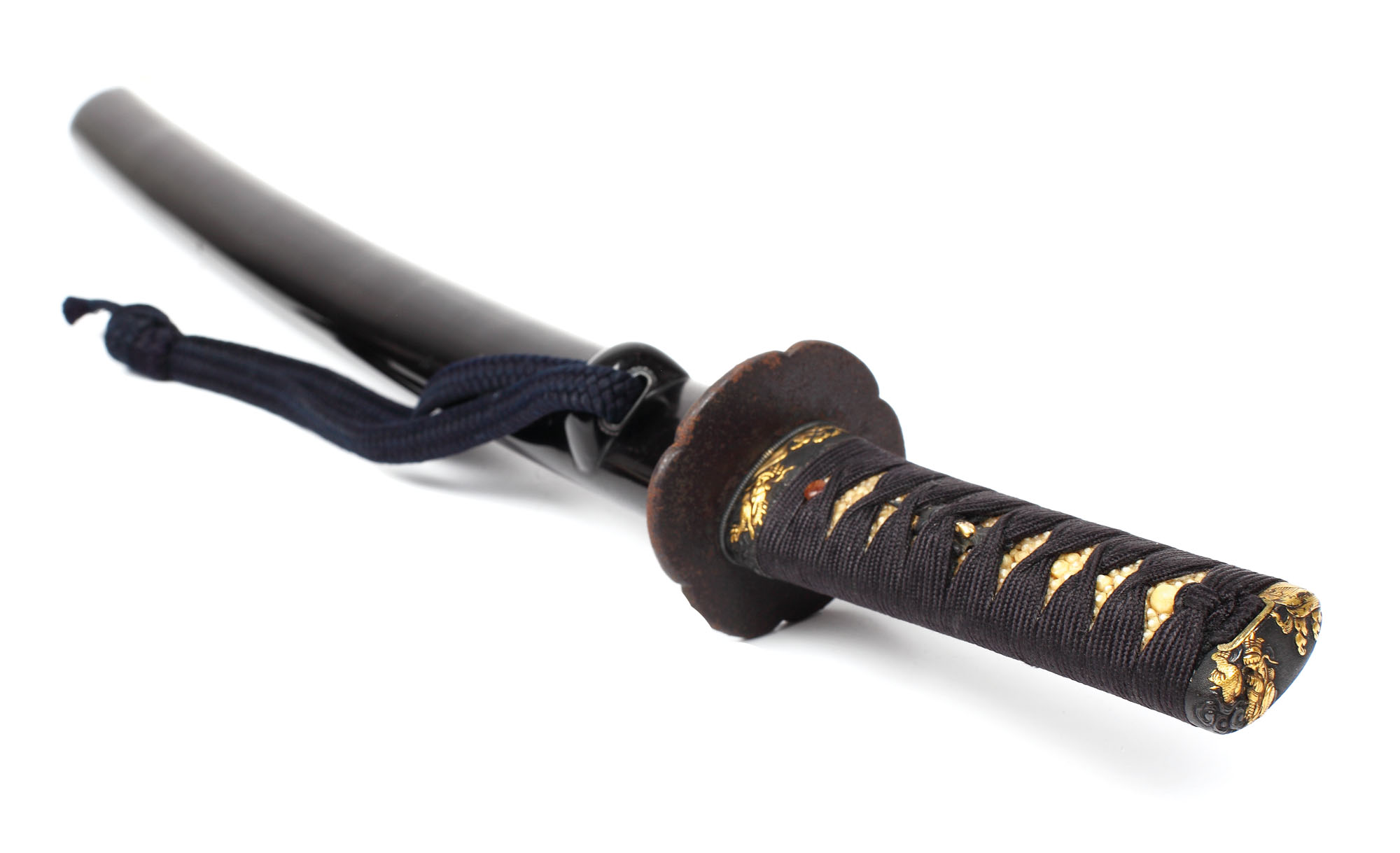 Wakizashi autentic japonez de tip shinogi-zukuri datând de la 1661, începutul perioadei Kanbun (1661-1673), semnată Bungo Kami Fujiwara Kanetaka. Fiind folosite ca săbii secundare în Japonia feudală, lamele Wakizashi completau împreună cu o Katana echipamentul de război al unui samurai (daishō). Săbiile Wakizashi erau folosite în luptele corp-la-corp într-un stil de luptă specific japonez numit Niten Ichi-ryū ce presupunea folosirea ambelor săbii, atât a Katanei cât și a Wakizashiului. După terminarea luptei, săbiile Wakizashi erau folosite la decapitarea inamicilor decedați. Totodată aceste săbii se mai foloseau de către samurai în ritualurile seppuku, urmărind codul de onoare al acestora, bushido. Partea activă a lamei prezintă un hamon rafinat de tip nie deki, rezultat al procesului de călire diferenţiată. Vârful lamei, kissaki, prezintă de asemenea un boshi impresionant, prelungire a hamonului lamei. Partea inactivă a lamei prezintă un mune lucrat aproape la perfecţiune. Puțin curbată, cu curvătura de tip tori-sori mai amplă spre centru şi fiind destul de lungă de tip shinogi-zukuri, lama este montată între două folii de argint, numite habaki. Lama este păstrată în shirasaya, suportul de lemn în care era depozitată atâta vreme cât nu era folosită de nobilul samurai în luptă. În momentul în care samuraiul pleca la război, lama era mutată în koshirae, ce includea un mâner (tsuka) și o teacă (saya). Lama de față este complementată de un koshirae autentic de perioadă Edo. Ca orice koshirae, cel de față conține anumite elemente distinctive: mânerul este acoperit cu șagrin iar apoi înfășurat cu o bandă de mătase neagră (tsuka-ito), legând la mijloc două piese ornamentale numite menuki, în formă de flori. Garda (tsuba) este simplă, din fier ajurat de tip mokko; teaca (saya) este din lemn negru și lăcuit, decorată cu un sageo.
