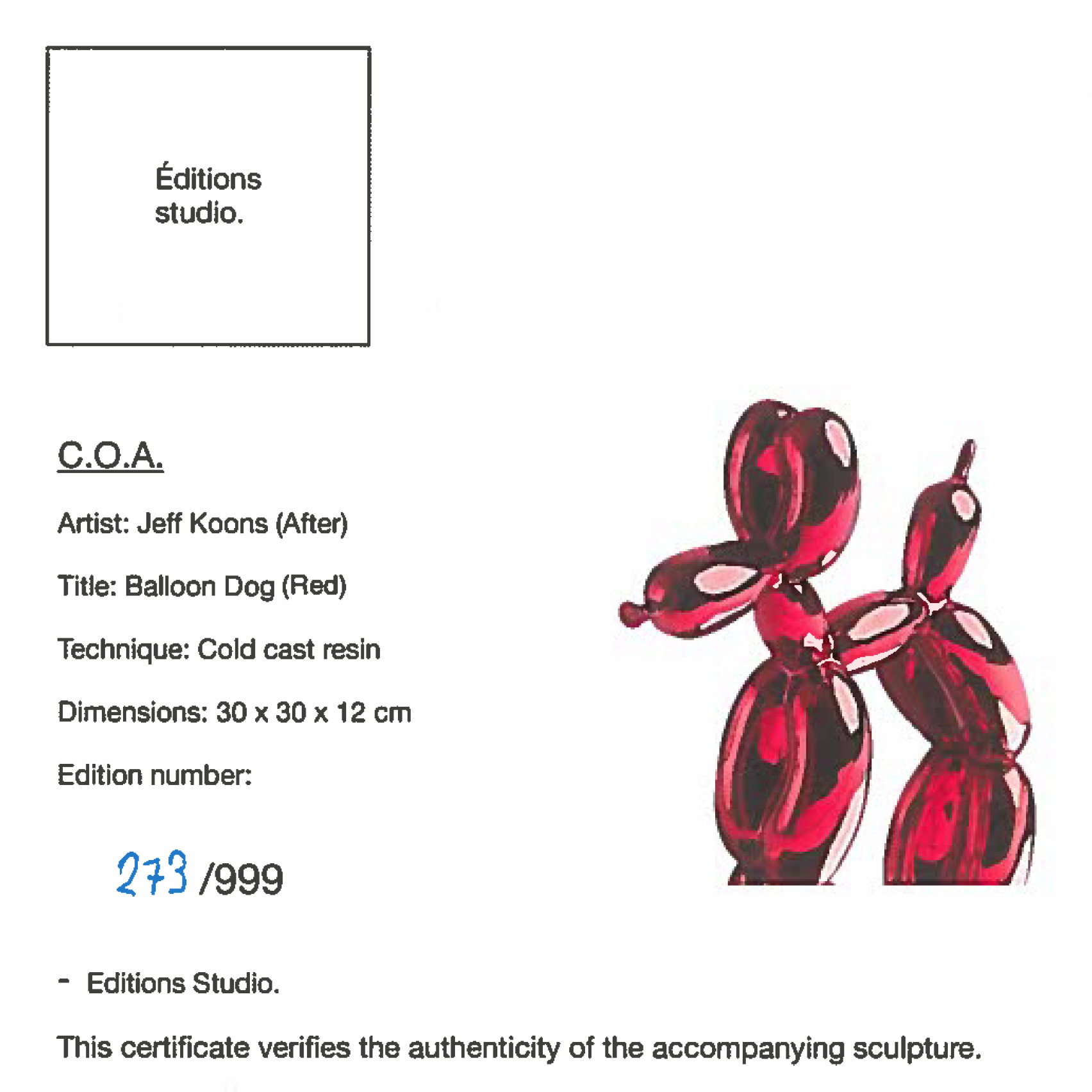 Editions Studio, ex. 273/999, însoțit de cutia originală și certificat de autenticitate emis de Editions Studio; numărul 273 inscripționat la baza lucrării