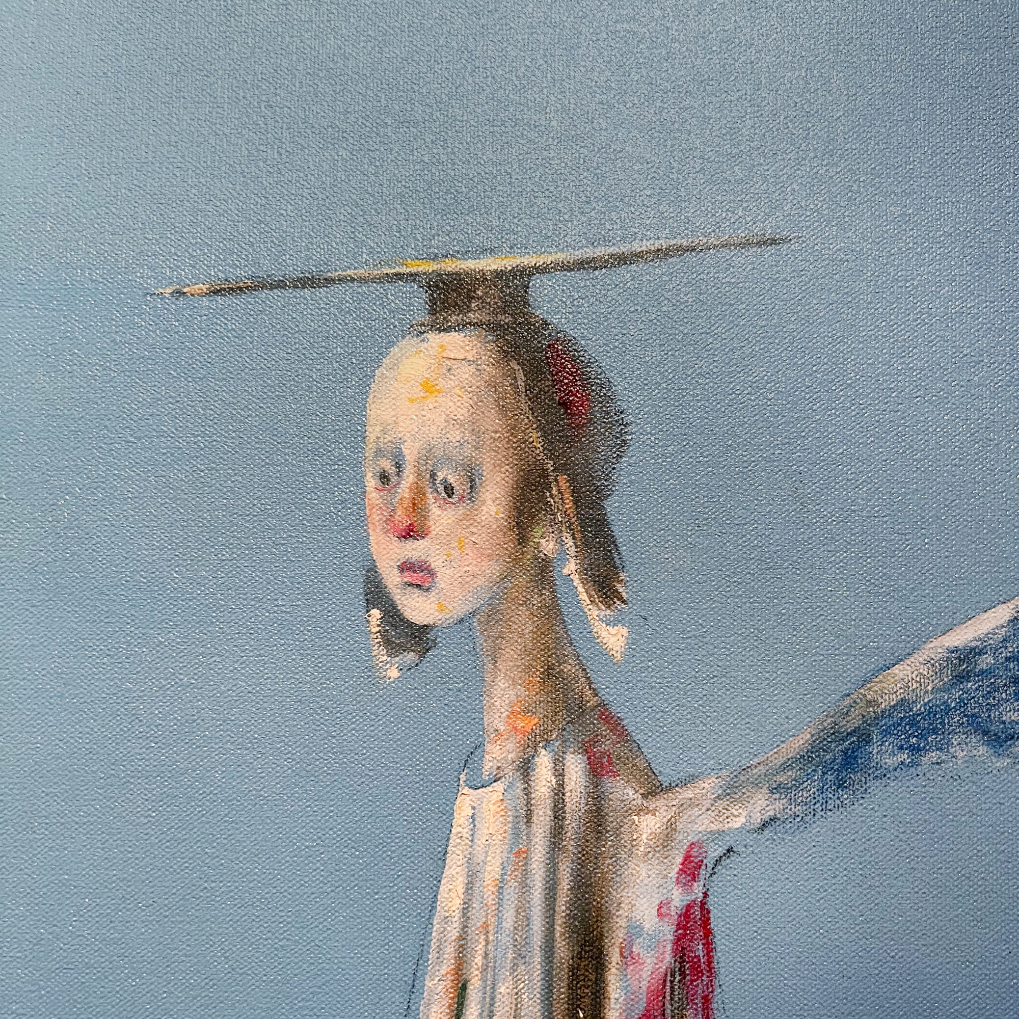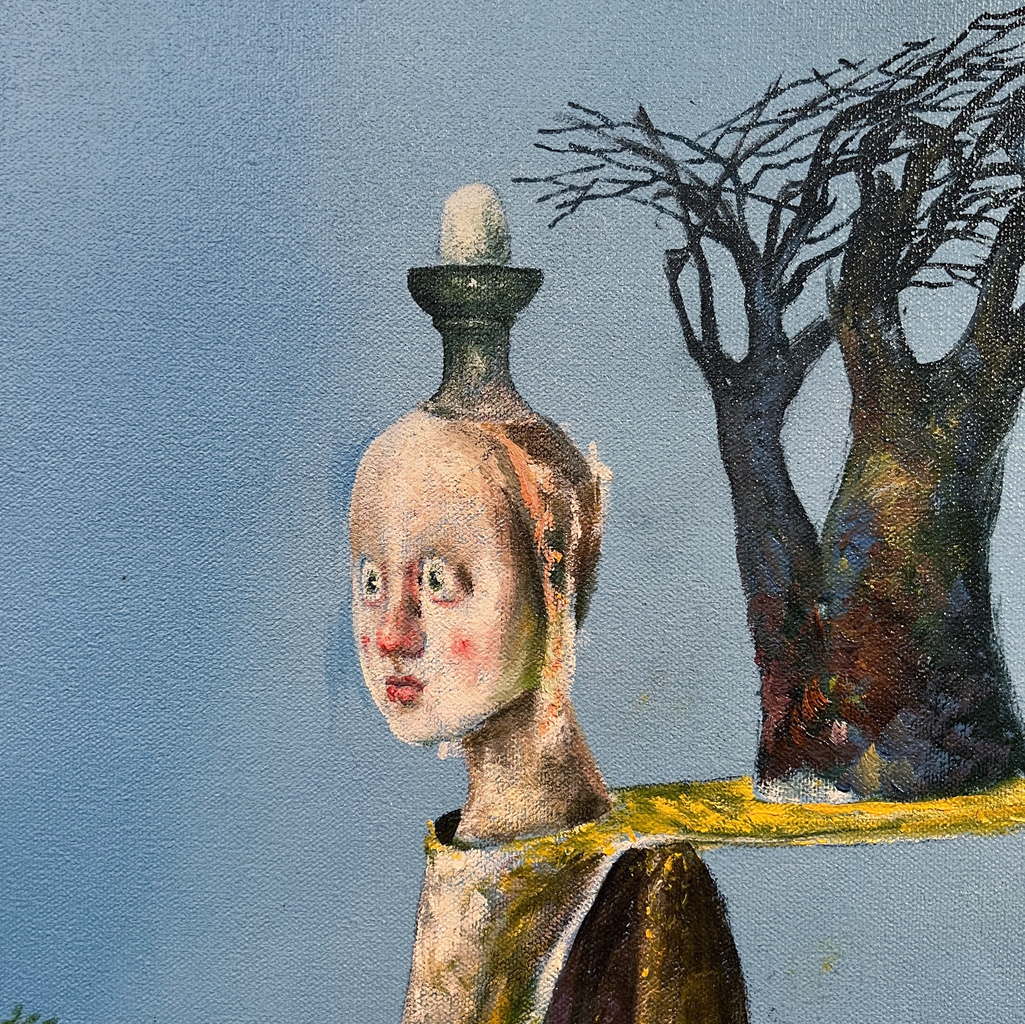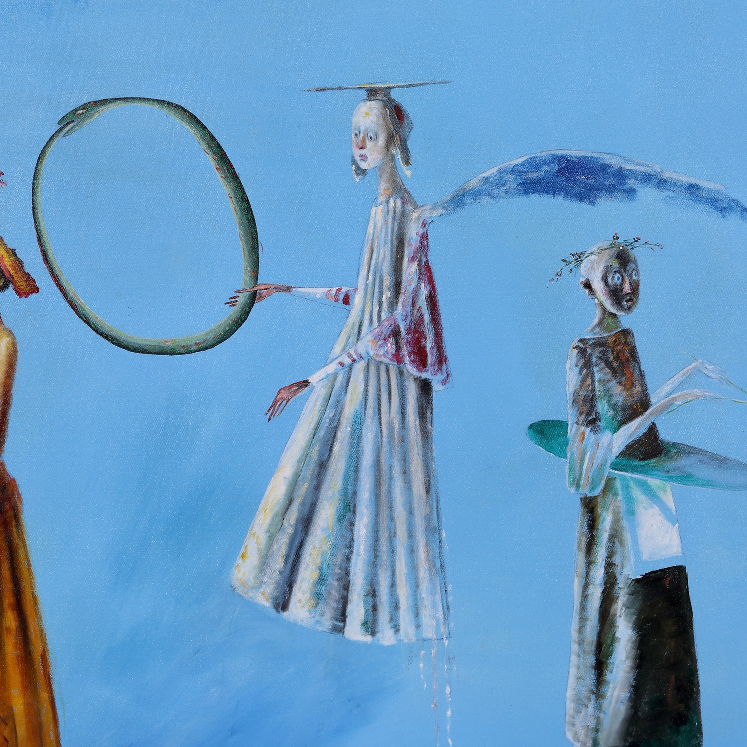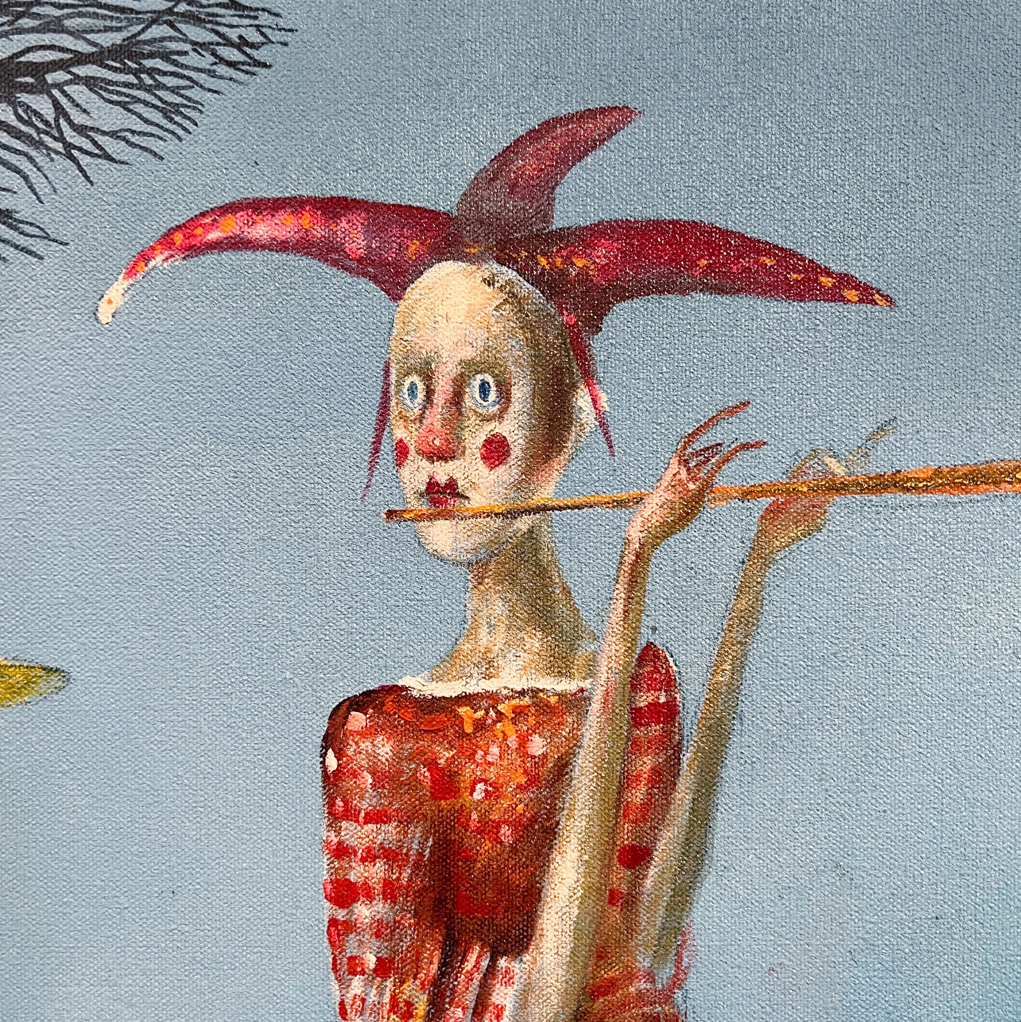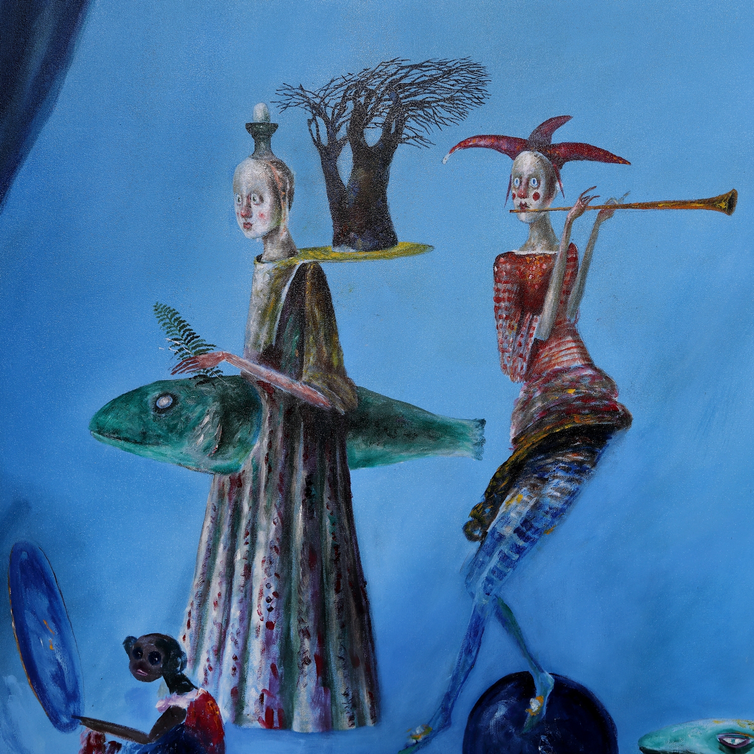 Viziunea artistului Ștefan Câlția asupra lumii pornește de la multiple ramificații culturale, care se întrepătrund și dau naștere acestor lucrări specifice, care marchează privitorul prin atmosferă și tonalitate afectivă. Avem, pe de o parte, lumea arhaică a basmelor populare românești, a personajelor fantastice; avem urme ale unor spectacole străvechi, tradiționale, cu măști și cortegii. Pe de altă parte, privitorul observă amprenta lăsată de valorile de viață din satul transilvan, în care s-a născut și crescut artistul ( reprezentat plastic în satul răsturnat din planul superior al lucrării), respectiv influențele lăsate de anii de studiu sub Julius Podlipny. Ca în majoritatea lucrărilor lui Ștefan Câlția, soarele nu apare reprezentat, lumina vine de niciunde, ca o boare catifelată, care potențează cromatica tabloului. Linia orizontului este plasată în planul de jos al lucrării, întrucât suveran pe pagină este cerul. Sub spațiul celest, cu vastitatea sa atotcuprinzătoare, se desfășoară scena. Artistul dezvăluie un mic “teatru al lumii” în lucrarea curentă, un teatru încărcat de simboluri, un univers de viață filtrat prin rațiune și cultură, cu personaje surprinse în interpretarea rolului asignat de Creator. Ramificațiile culturale care dau viață acestui cadru sunt multiple: valorile de viață din satul transilvănean, memoria colectivă a basmelor populare românești, lumea teatrului de marionete, jocurile populare cu alai etc. În opera lui Ștefan Câlția, funcția personajului este crucială. Personajele concentrează principalele semnificații ale imaginii plastice, potențând sensul său de fabulă. Costumația personajelor amintește de cortegiile carnavalești, accentul picând pe caracterul ludic și oniric al scenei. Există două tipuri iconografice: pe de o parte, personajele umane, cu figurile lor hieratice asemenea unor îngeri pământeni, respectiv personajul animal, întruchipat prin motivul peștelui. Motivul peștelui nu este doar unul din cele mai frecvente din creația maestrului, ci și unul din primele simboluri ale umanității, folosit în cele mai diverse combinații. “În compozițiile lui Ștefan Câlția, simbolismul peștelui se apropie mai mult de interpretările date acestui motiv de câțiva artiști moderni, în special din aria expresionismului german: Max Beckmann, Paul Klee, Marc Chagall. În opera acestora, imaginea carnavalului, a jocului păpușăresc a avut loc de frunte, iar peștele are semnificații magic-mistice, un punct de întâlnire între viață și moarte”(Amelia Pavel). Atmosfera imaginii sugerează simultan haz, mister, dar și o anumită melancolie, departe de bucuria unei atmosfere de sărbătoare.
