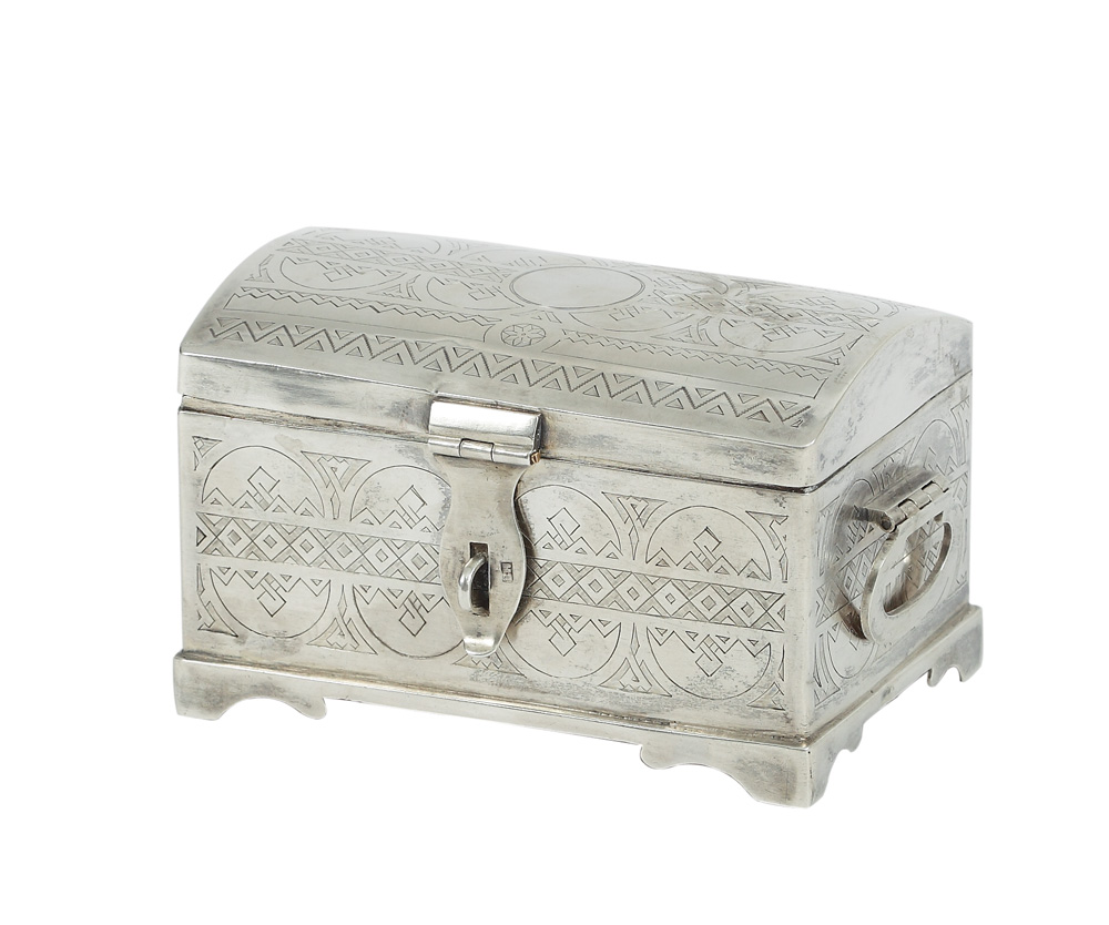 7. Casetă de bijuterii din argint gravat, reprezentând o ladă de zestre, 1888