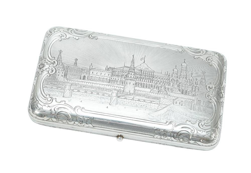 16. Tabacheră din argint, decorată cu a 3-a Romă (cetatea Kremlinului), cca 1865
