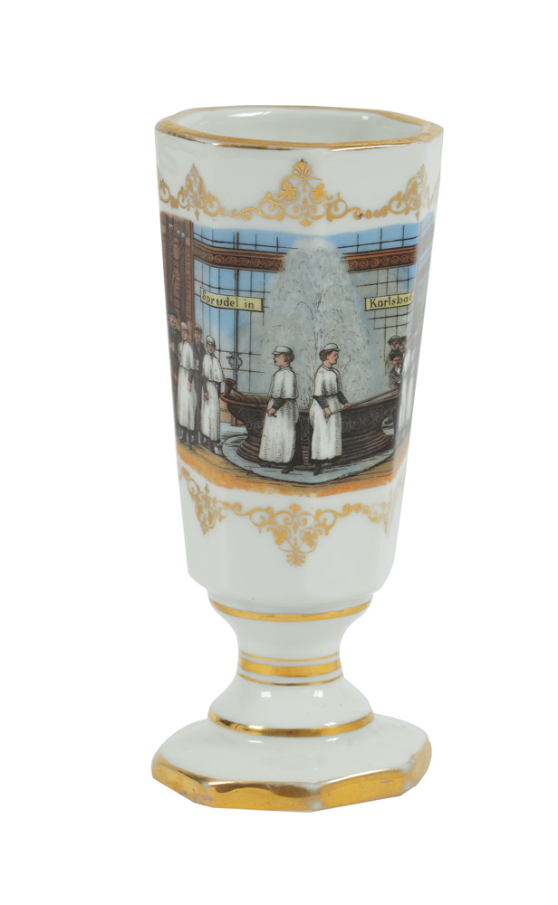 18. Pahar Karlsbad pentru cură de apă minerală, decorat cu scenă de băi, cca 1910