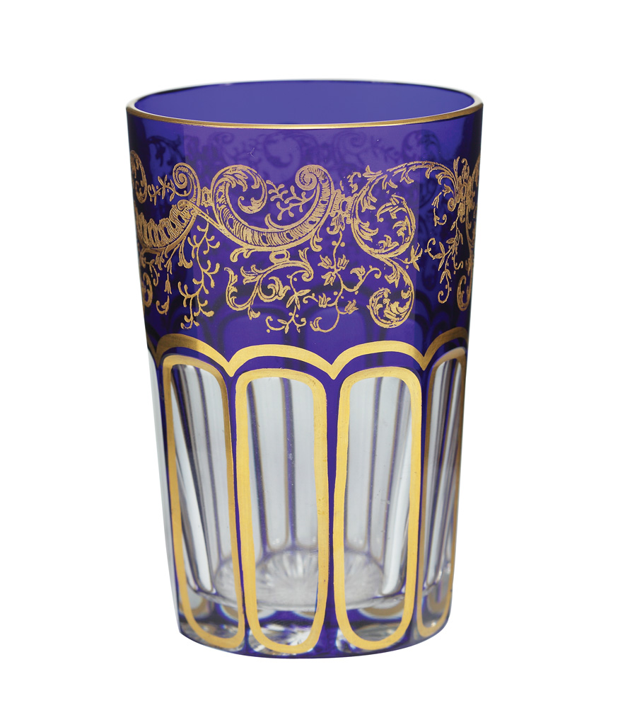 19. Pahar boemian din cristal aurit, decorat cu motive Rococo, pentru cură de apă minerală, cca 1900