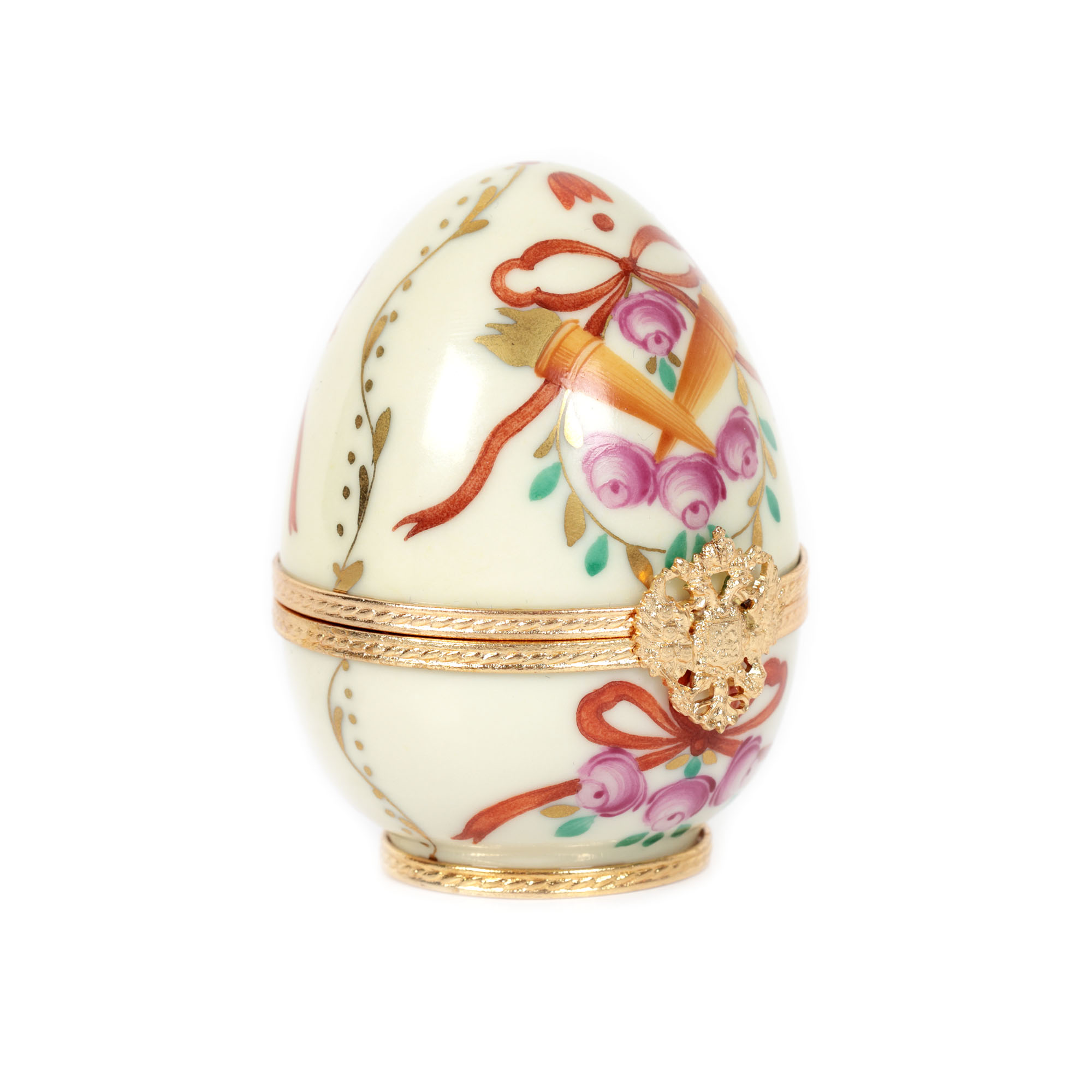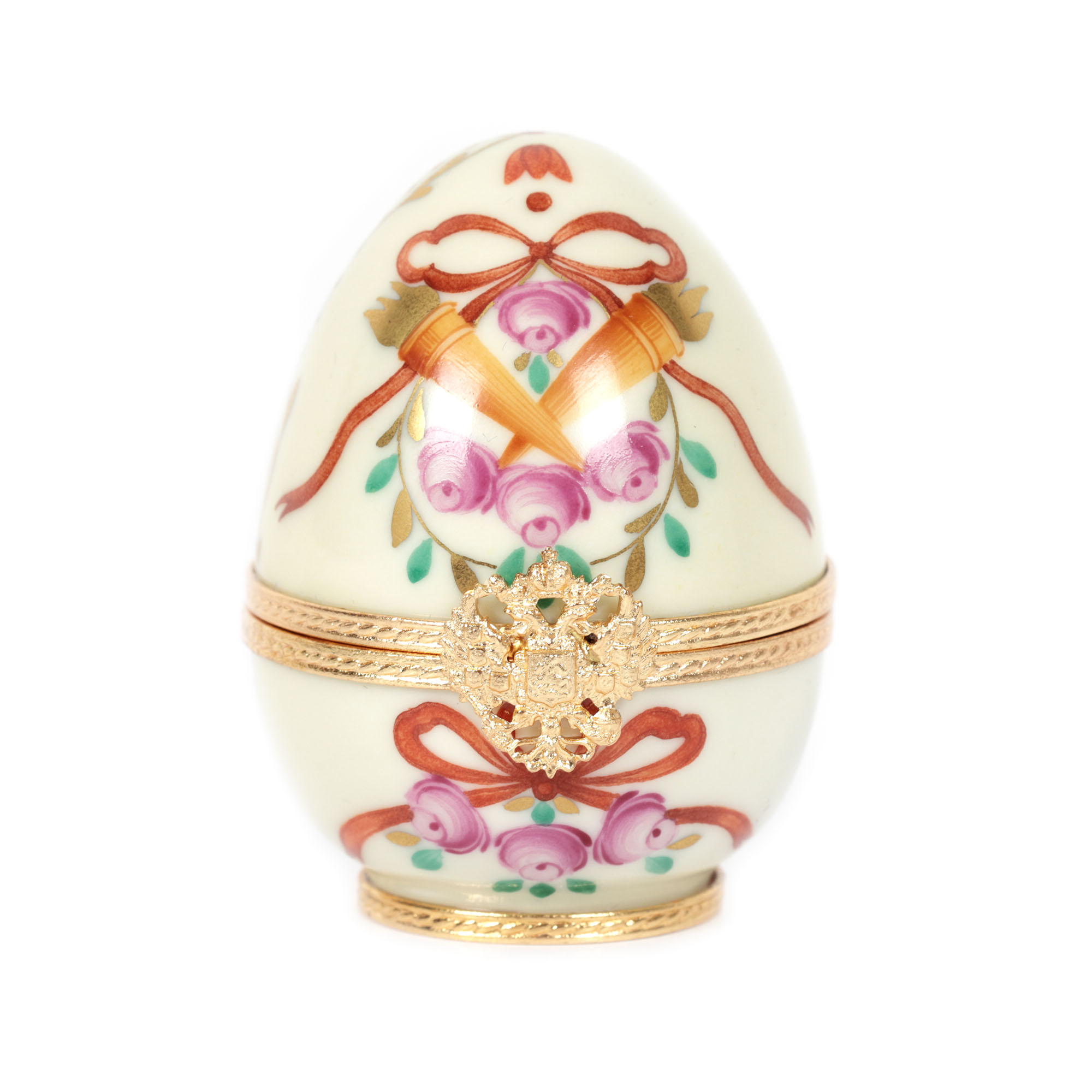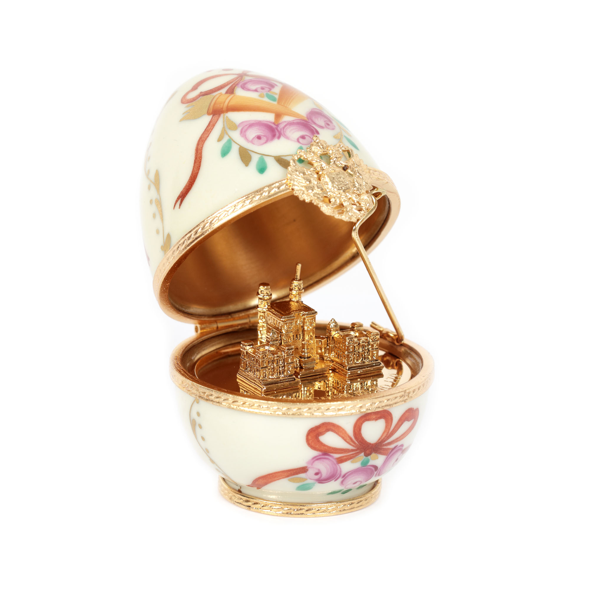 38. Ou în manieră Fabergé, din porțelan Limoges, pictat manual, decorat la interior cu macheta palatului Gatchina, însoțit de cutia originală și certificat de autenticitate