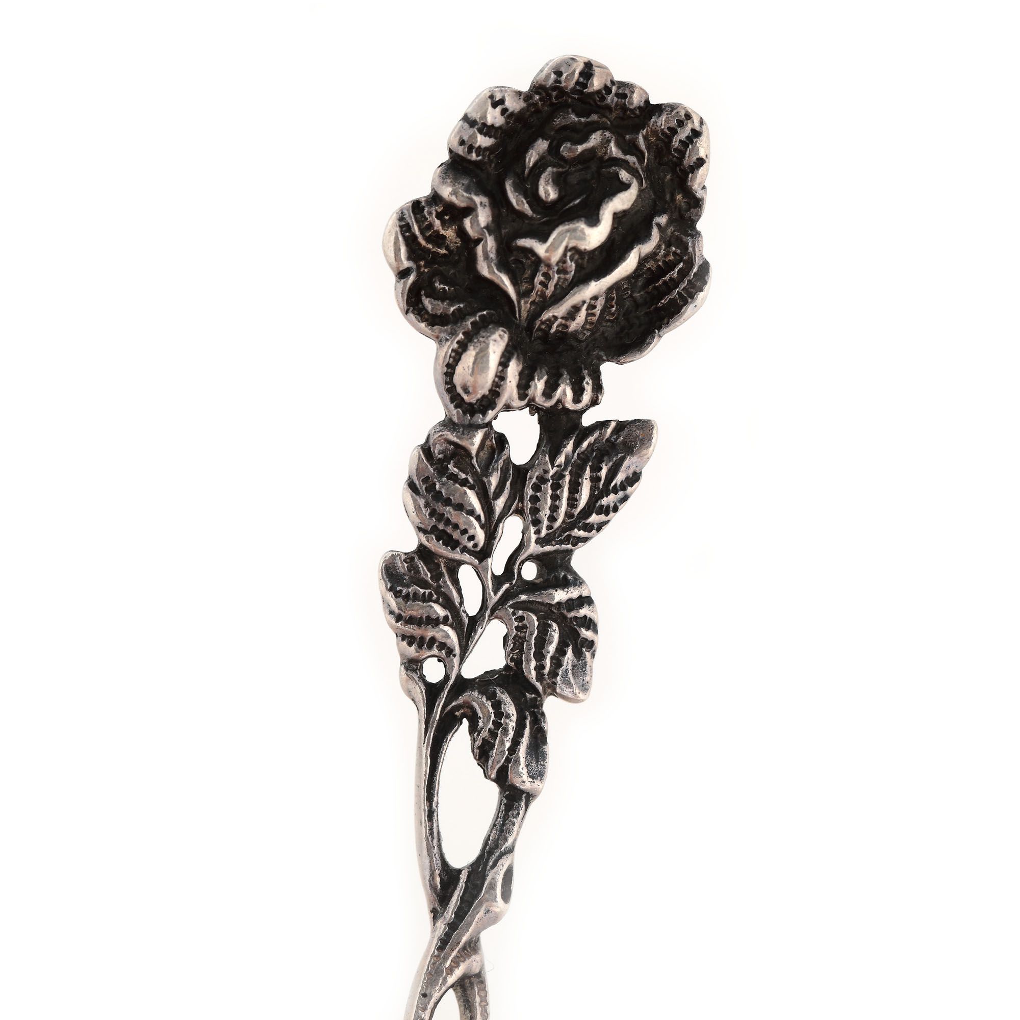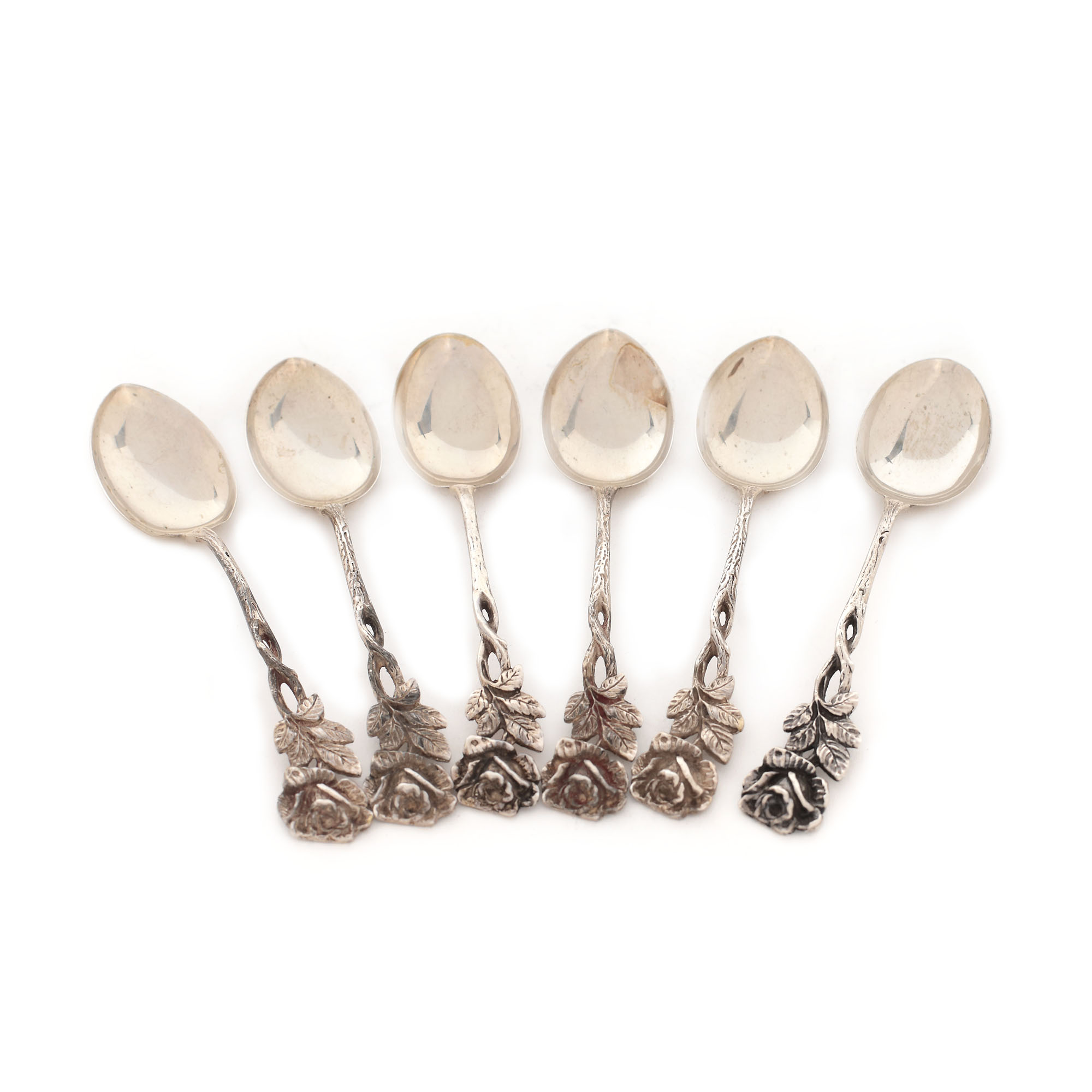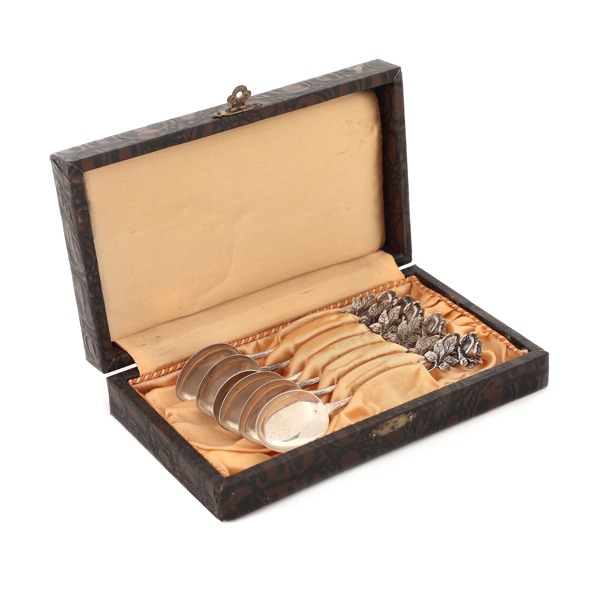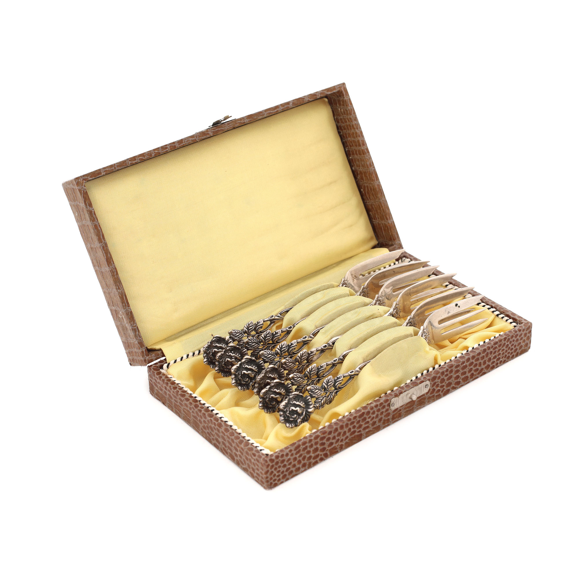 23. Set Albert Bodemer din argint, format din șase lingurițe și șase furculițe, cu mânerul în formă de trandafir, pentru desert, cca. 1945, însoțit de cutiile originale