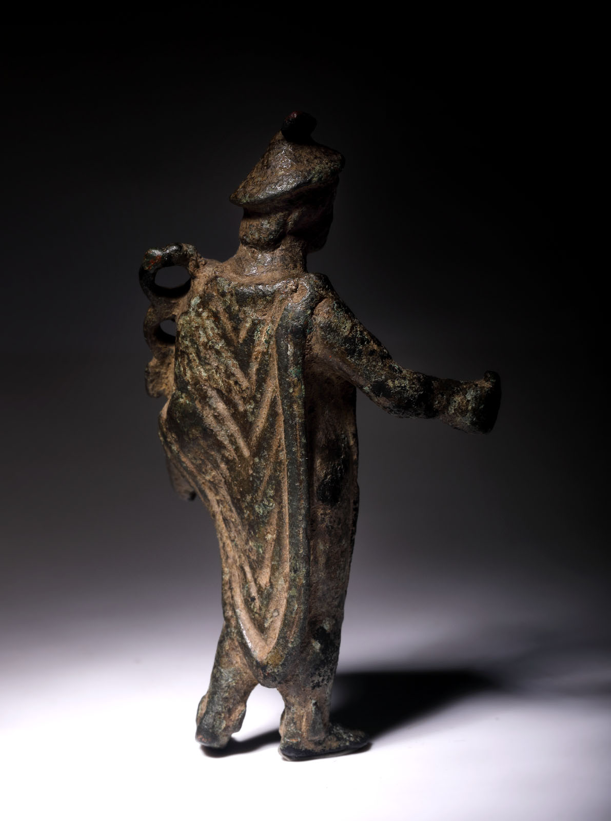 Mică figurină de bronz reprezentându-l pe Hermes ținând caduceul în mâna stângă. Caduceul este atributul zeului. El reprezinta la origine doi șerpi încolăciți în jurul unui baston. Pe cap poartă pălăria caracteristică cu două aripioare.