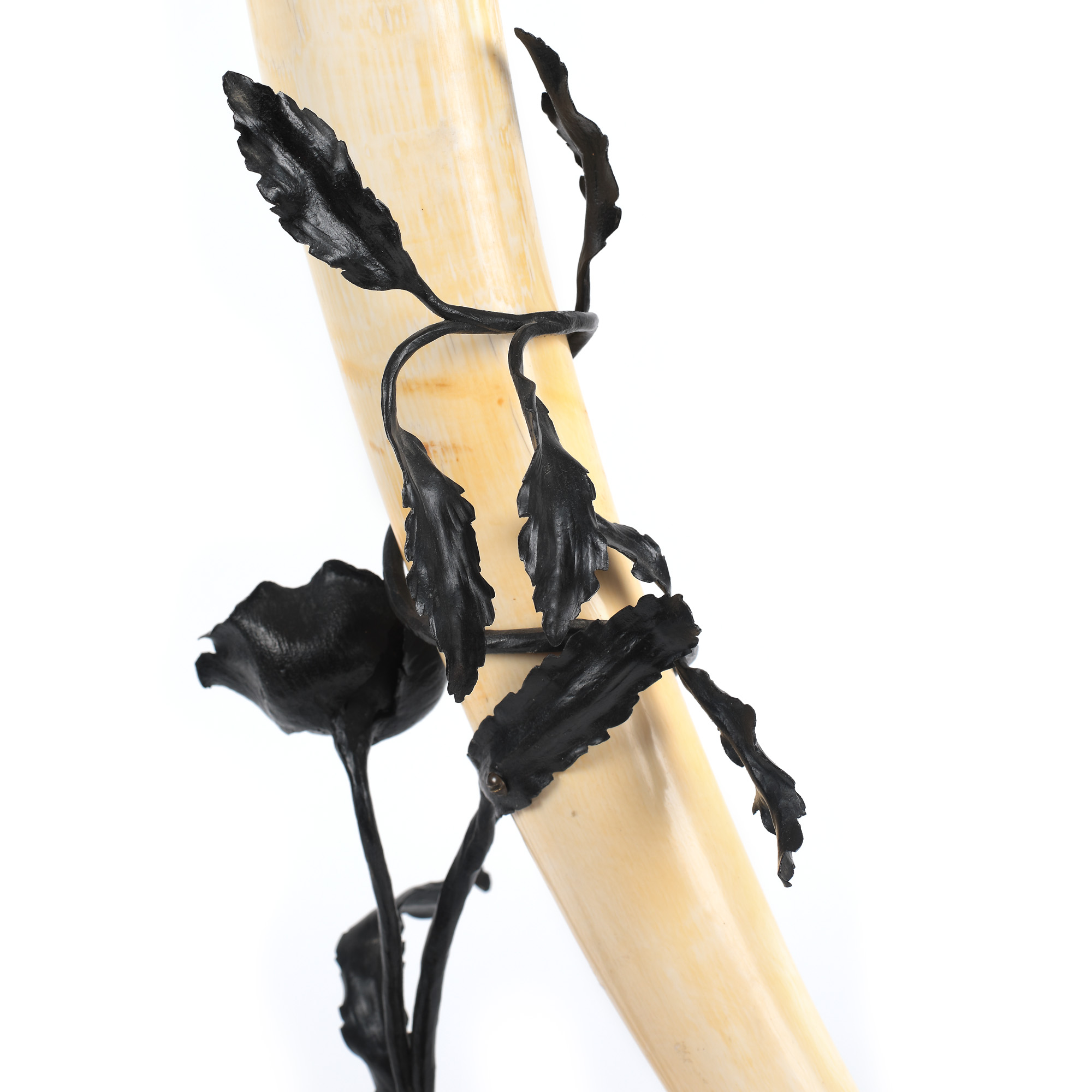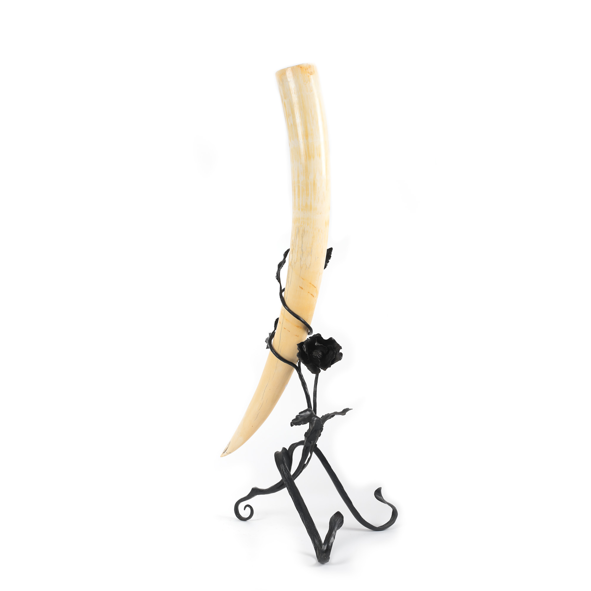 12. Corn din fildeș congolez, cu elegant suport Art Nouveau din fier forjat, reprezentând un fir de mac, probabil belgian, de perioadă, cca. 1900