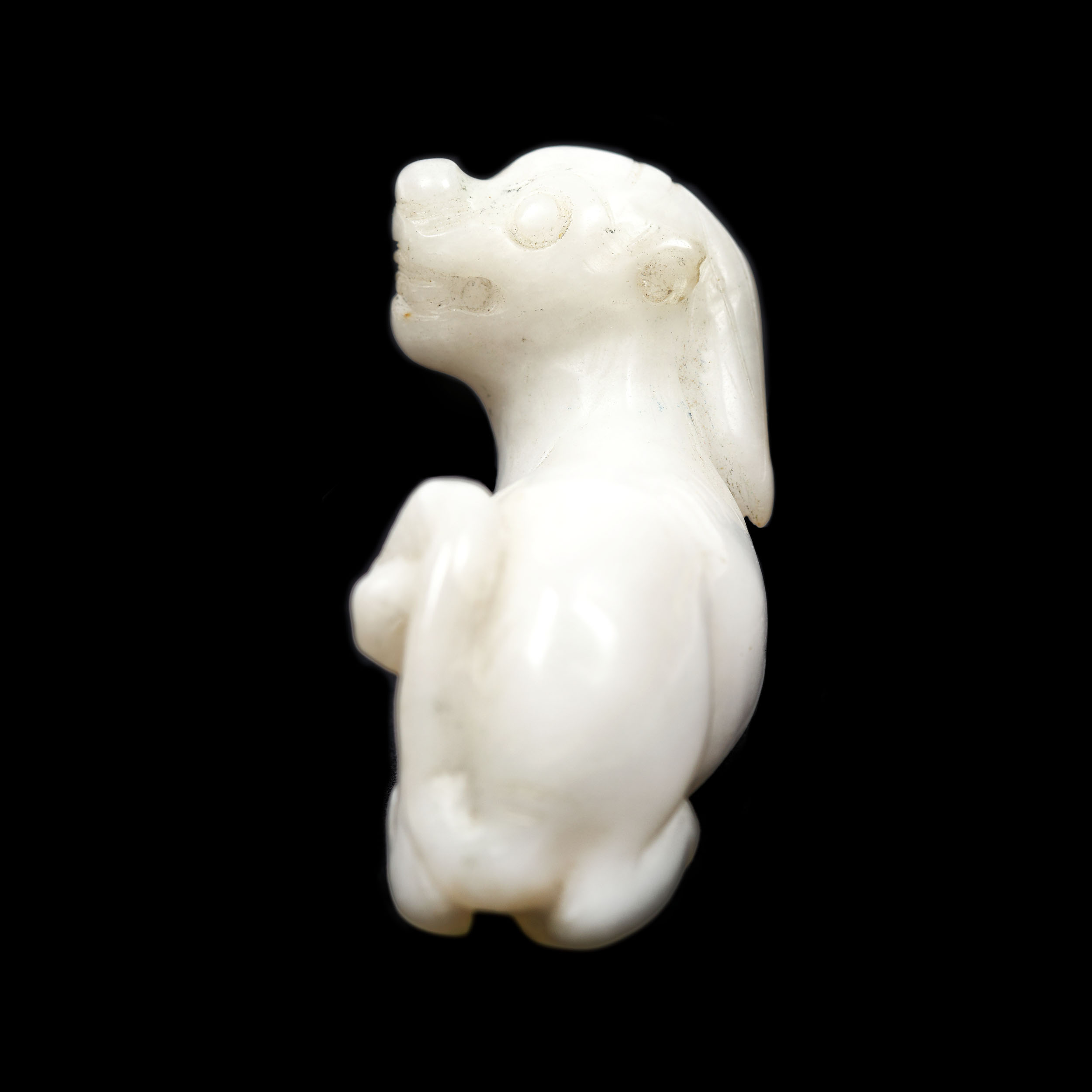 Prețioasa piesă din jad alb, datând din timpul dinastiei Ming (1368–1644), înfățișează un așa-numit dragon-fără-coarne (chilong). Dragonul deține în mitologia chineză o poziție centrală, fiind unul din cele patru animale venerate de-a lungul timpului. Străbunul dragonului în sens arhetipal poate fi întâlnit pe ceramica neolitică sau pe vasele ritualice din epoca bronzului. Forma distinctivă a dragonului, pe care o recunoaștem cu ușurință astăzi, s-a cristalizat în timpul perioadei Statelor Combatante și a dinastiei Han, când este asociat cu puterea imperială.