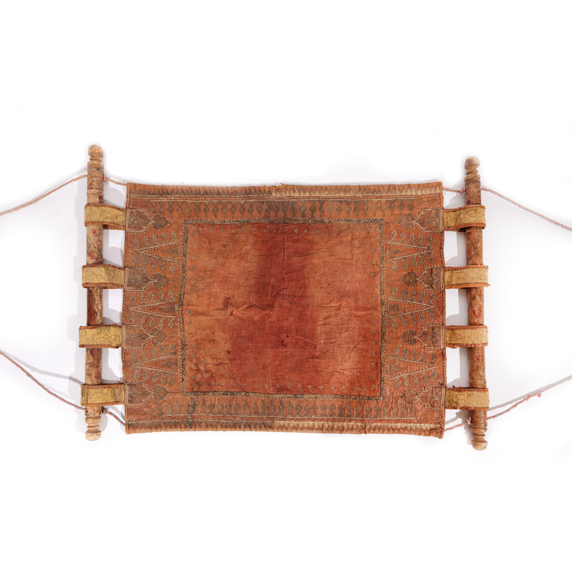 30. Inedit leagăn pentru copii (hamac), din piele brodată cu fir aurit și stofă fină, Persia, cca. 1900, piesă rară, de colecție