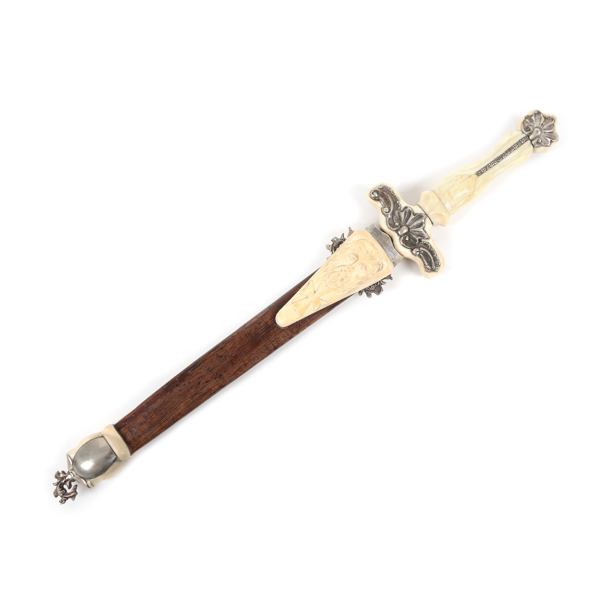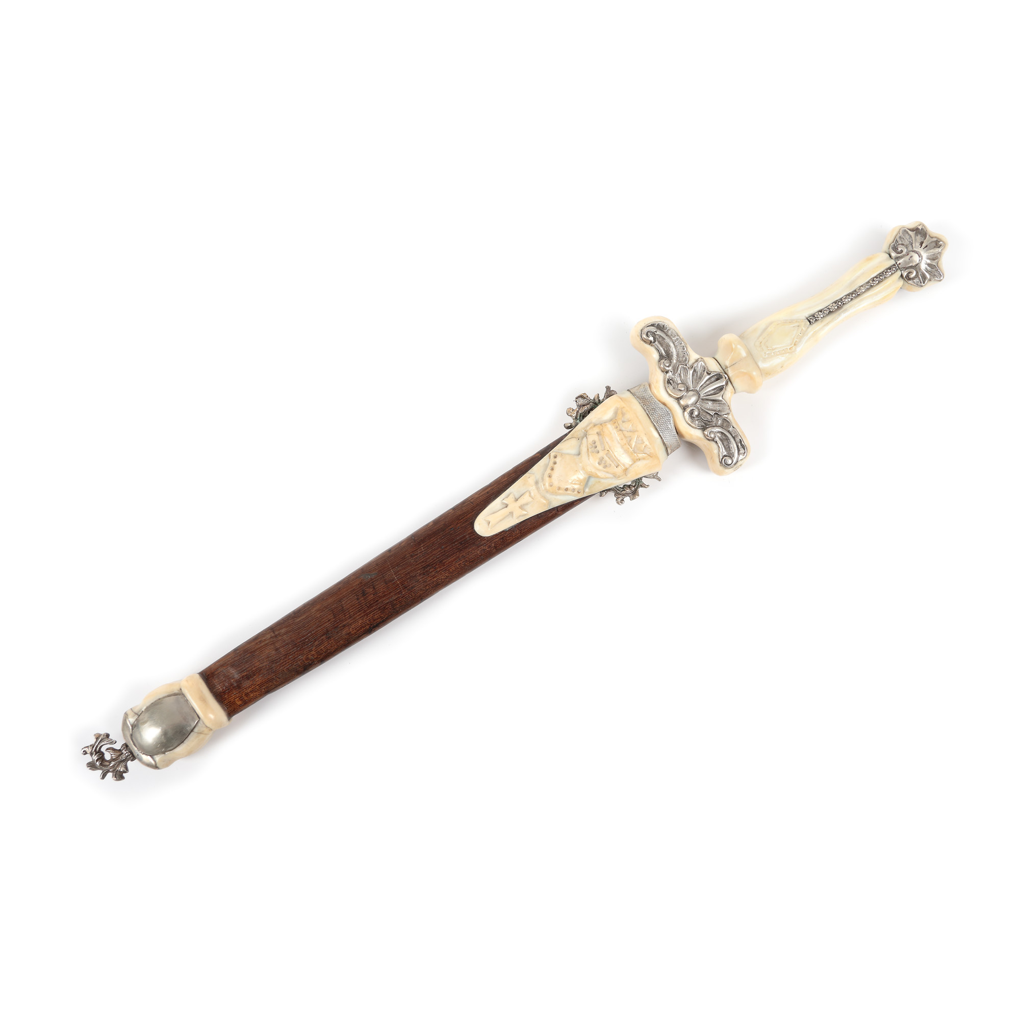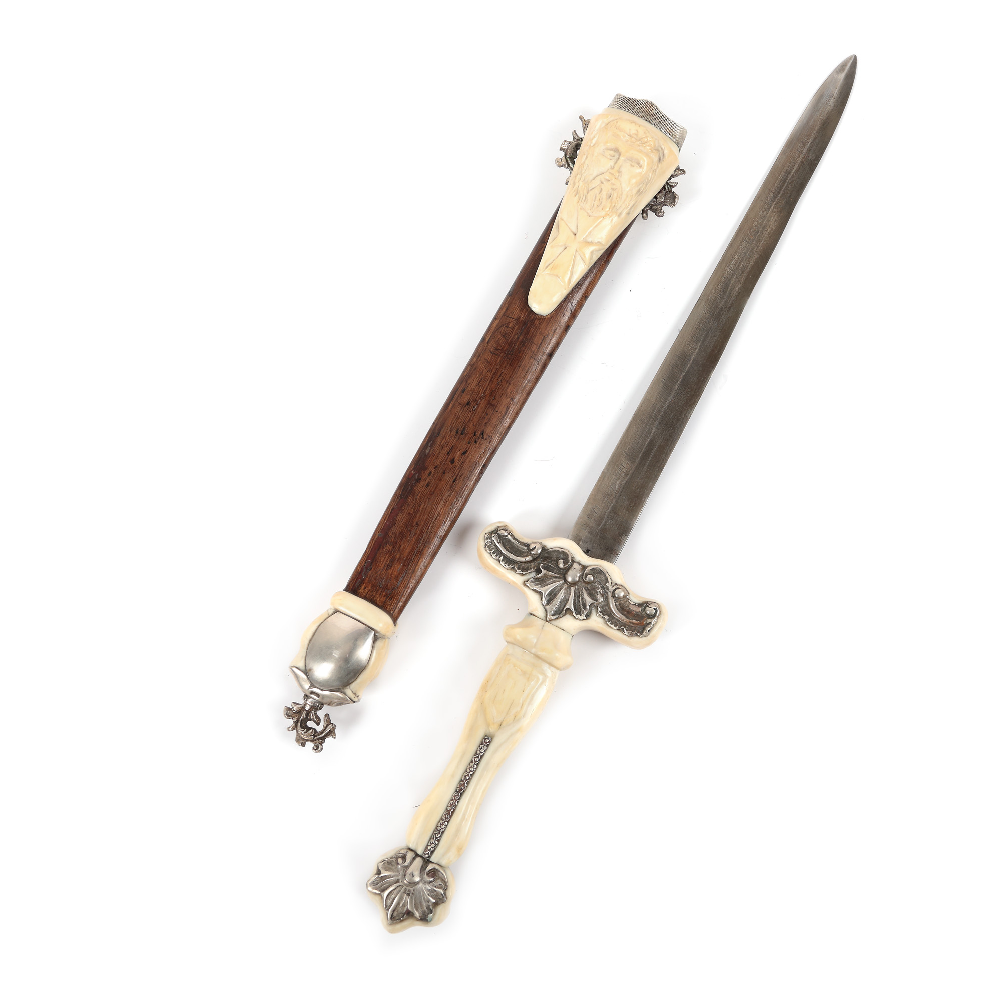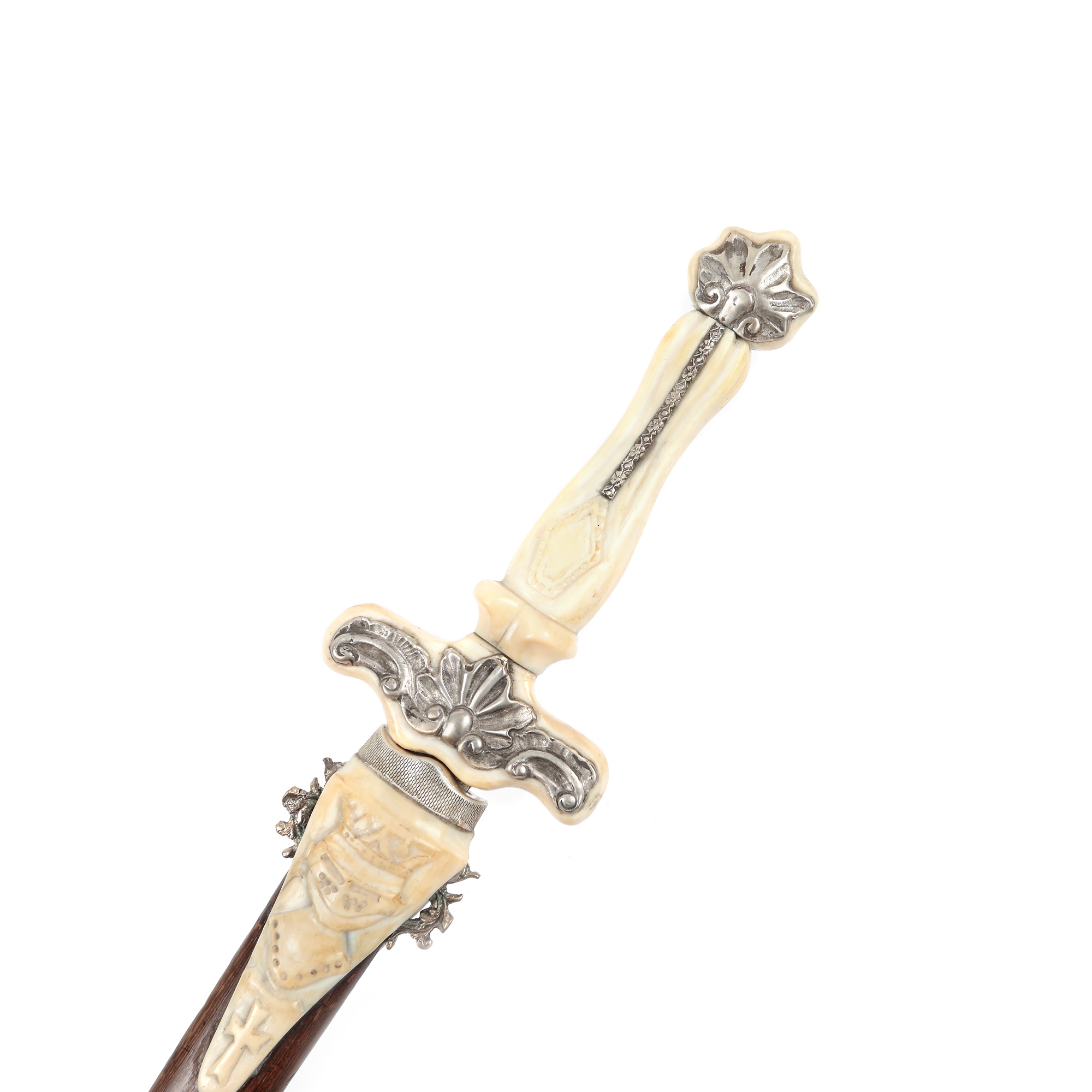 46. Pumnal de ceremonie, mâner și teacă decorate cu argint și fildeș, purtând Crucea de Malta și Crucea Cavalerilor Templieri, cca. 1930