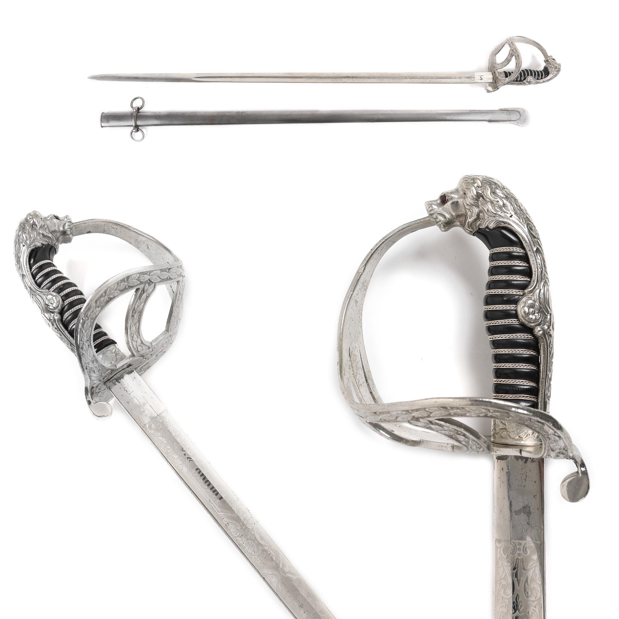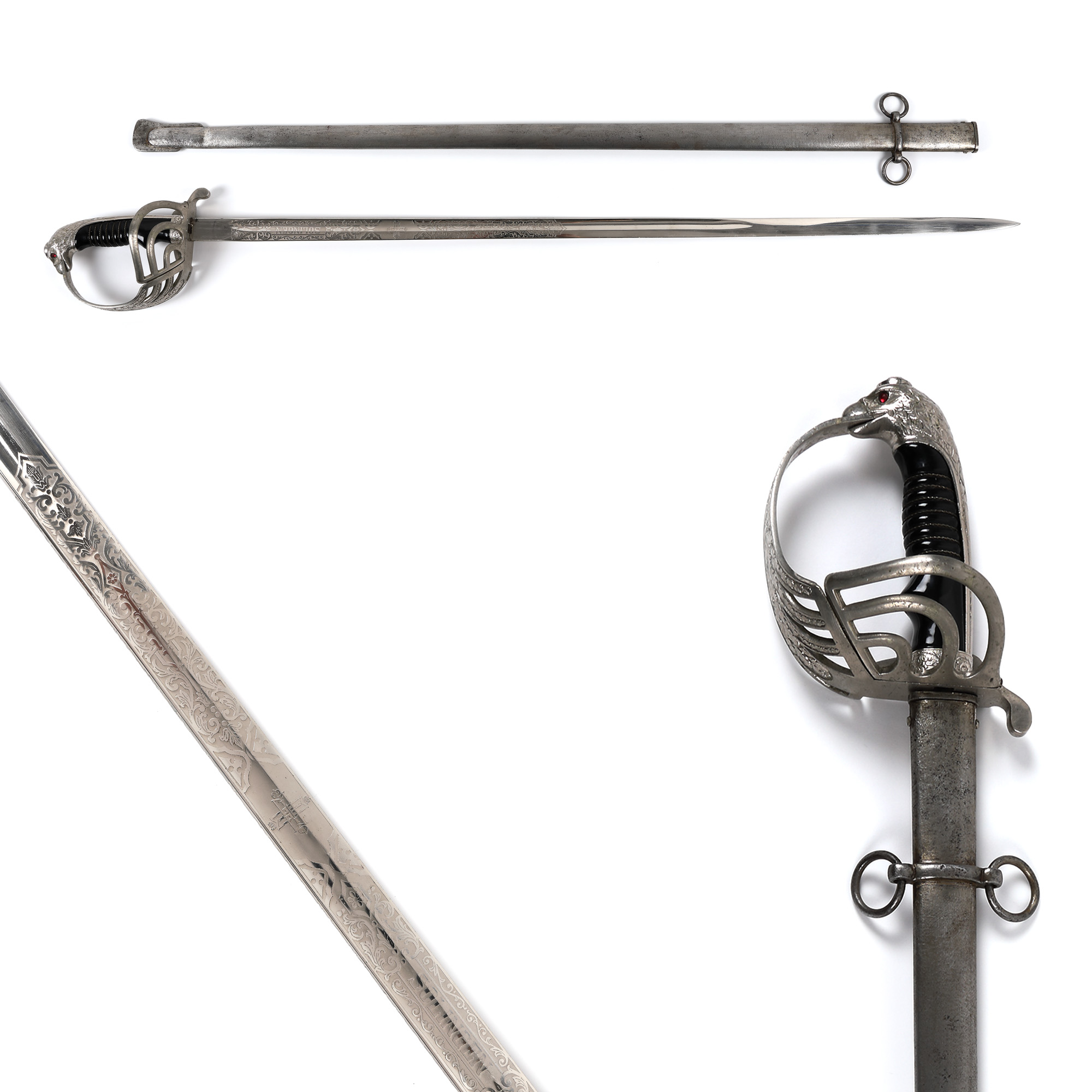 8. Sabie de ofițer de cavalerie, cu teacă, purtând cifrul Regelui Carol I