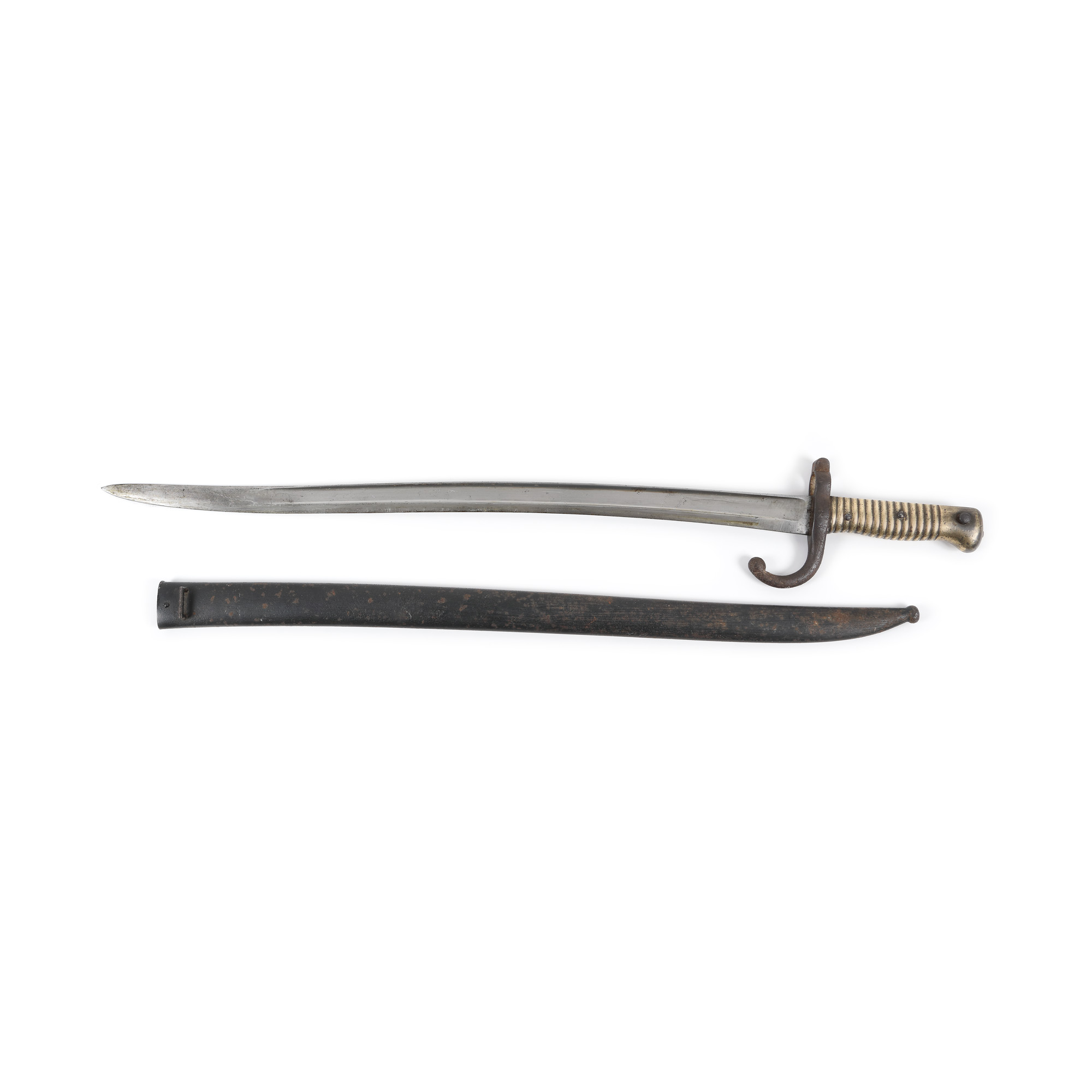 2. Baionetă franceză de tip iatagan, pentru pușca Chassepot, cu teacă, datată august 1874