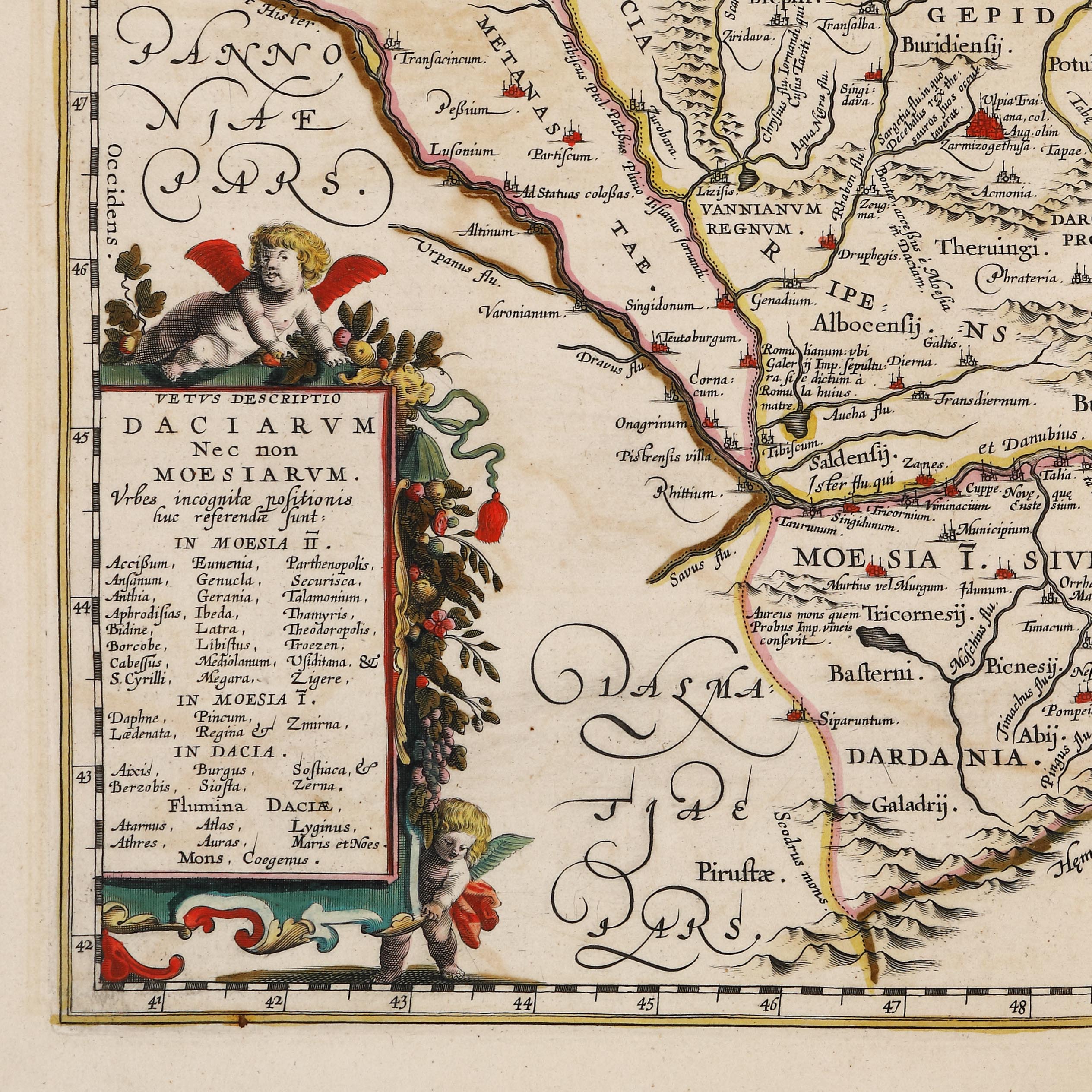 Impresionantă hartă care descrie zona Romaniei și Bulgariei, centrată pe fluviul Dunare. Această reprezentare se bazează pe o hartă realizate Ortelius, care, la rândul ei, a fost bazată pe surse clasice. Decorul a fost realizat de Petrus Kaerius pentru a evidenția orașele mari, munții și râurile și are un cartuș care conține titlu drapat cu ghirlande, doi putti și o navă pe zona Marii Neagre.