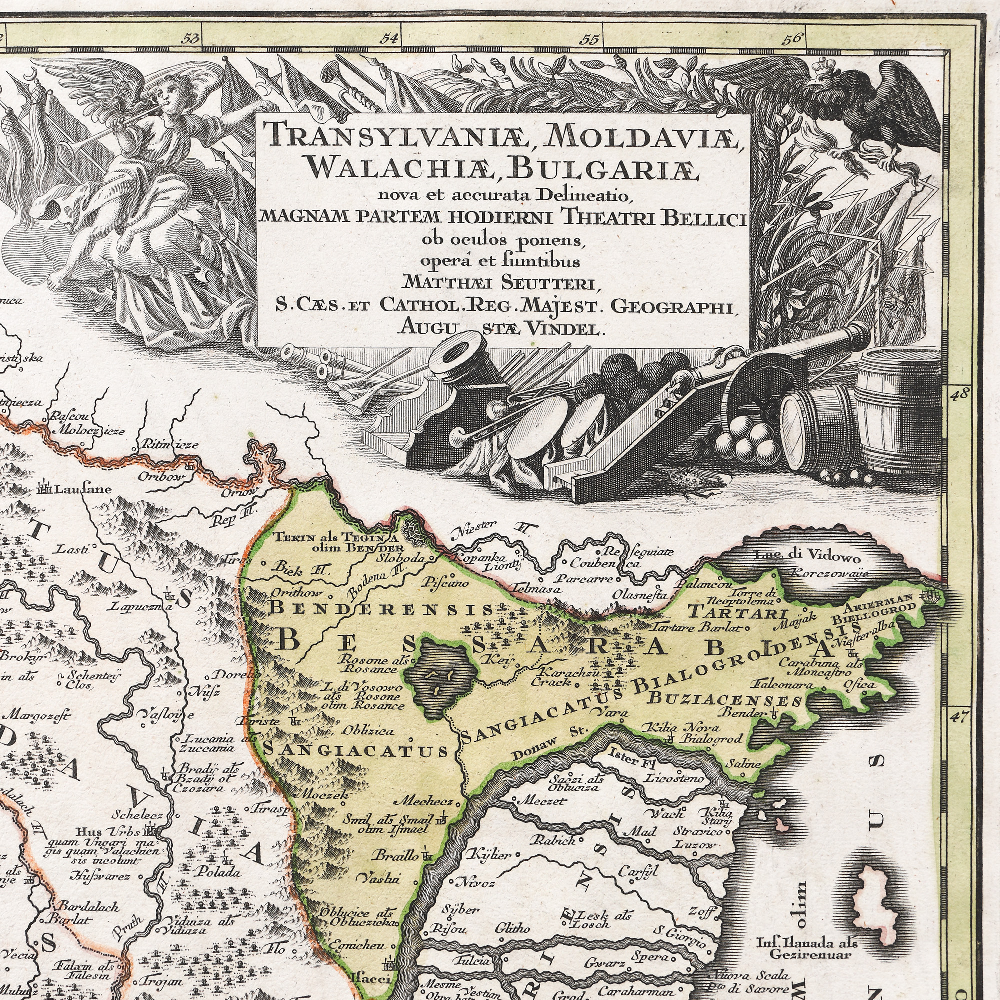 Planșa prezintă „Harta Transilvaniei, Moldovei, Valahiei, Bulgariei, cu o nouă și precisă delimitare...” cu reprezentarea teatrului de război și a operațiunilor militare din zona ilustrată. Matthäus Seutter cel Bătrân, a publicat primul său „Atlas Geographicus” în 1720 și a adăugat conținutul acestuia în edițiile ulterioare publicate sub titlul „Atlas Novus". El a fost succedat în afacerea sa de către fiul său Georg Matthaus Seutter. La un moment dat afacerea familiei a fost vândută către Tobias Conrad Lotter și Johann Michael Probst. Planșa conține două cartușe decorative, unul conținând titlul, poziționat în partea superioară-dreaptă, celălalt conținând legenda cu explicația simbolurilor din hartă precum și patru scuturi reprezentând simbolic Valahia, Transilvania, Moldova si Bulgaria.