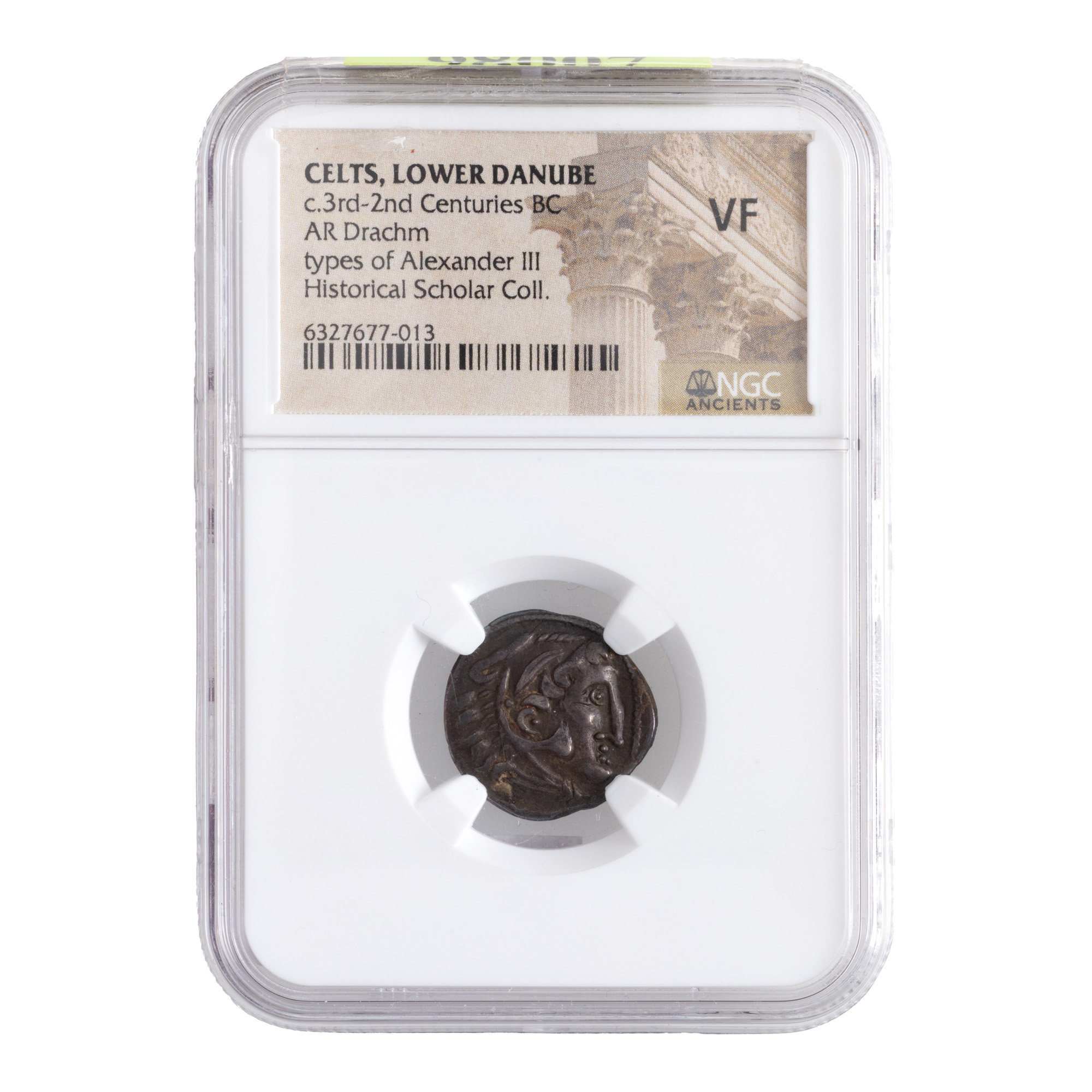 7F. Monedă Drahmă, imitație celtică din zona Dunării de Jos, sec. III-II î.e.n., argint