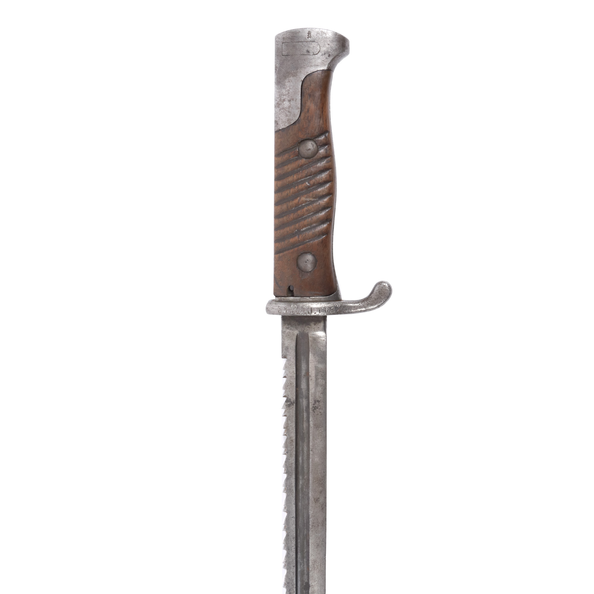46. Baionetă-sabie, model S98, cu teacă, pentru pușca Mauser, cu lama zimțată (sawback), perioada Primului Război Mondial, piesă rară