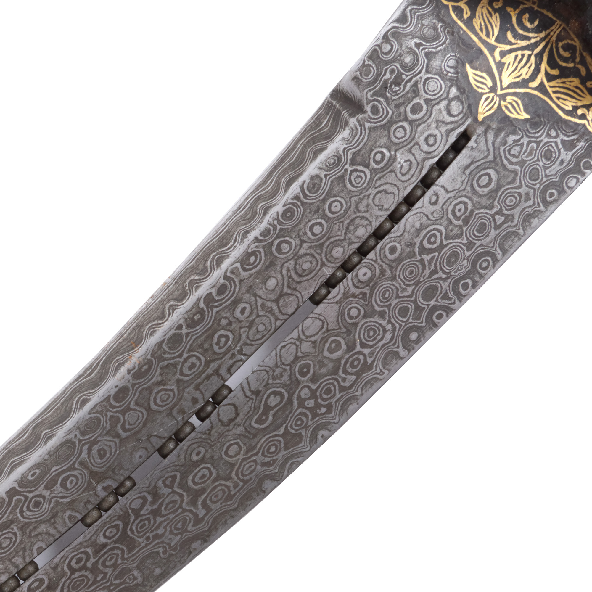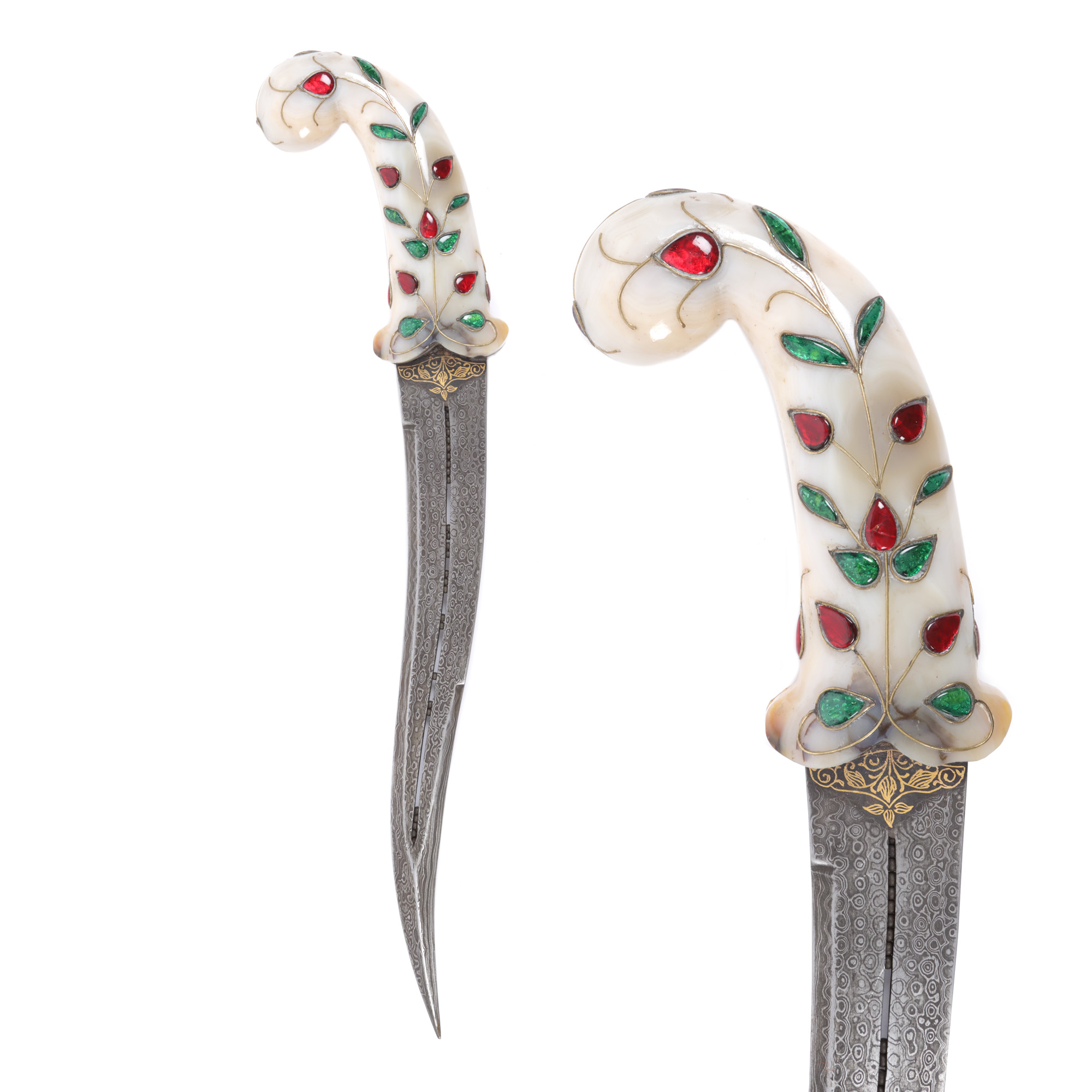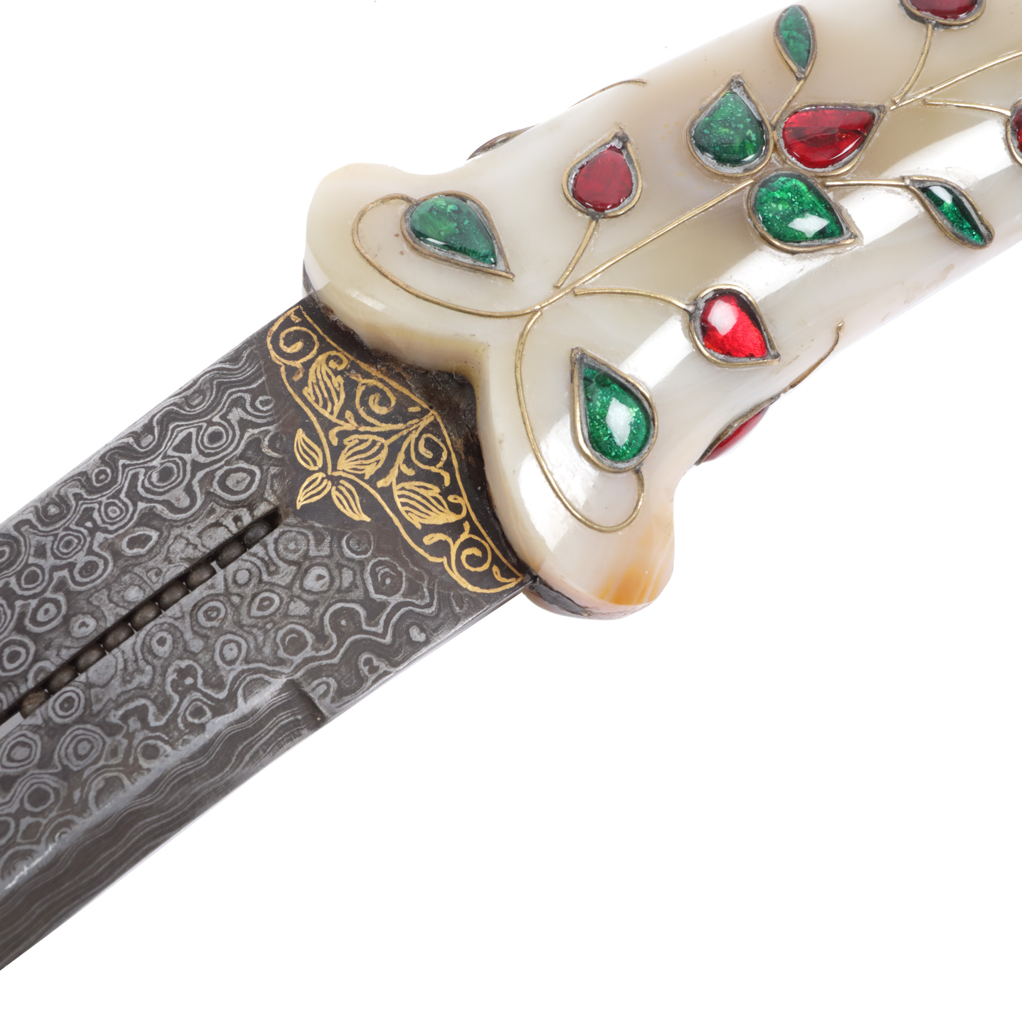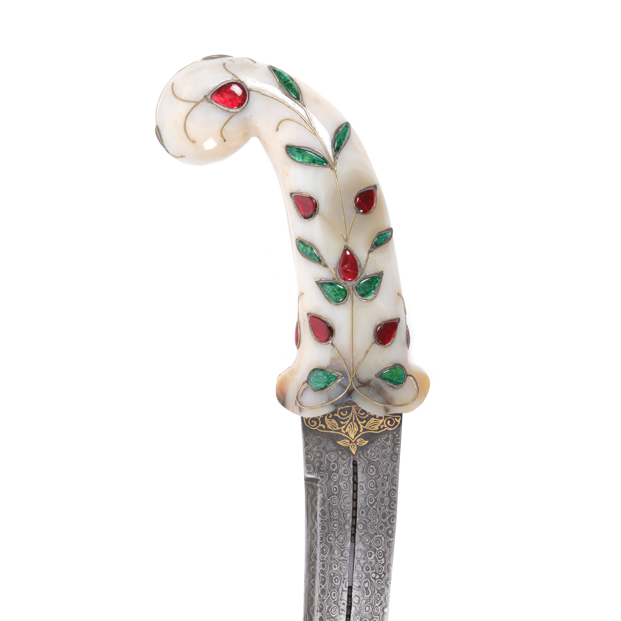 57. Pumnal Khanjar, cu mânerul din agat și lama damaschinată, intarsiată cu aur, India, începutul sec. XX