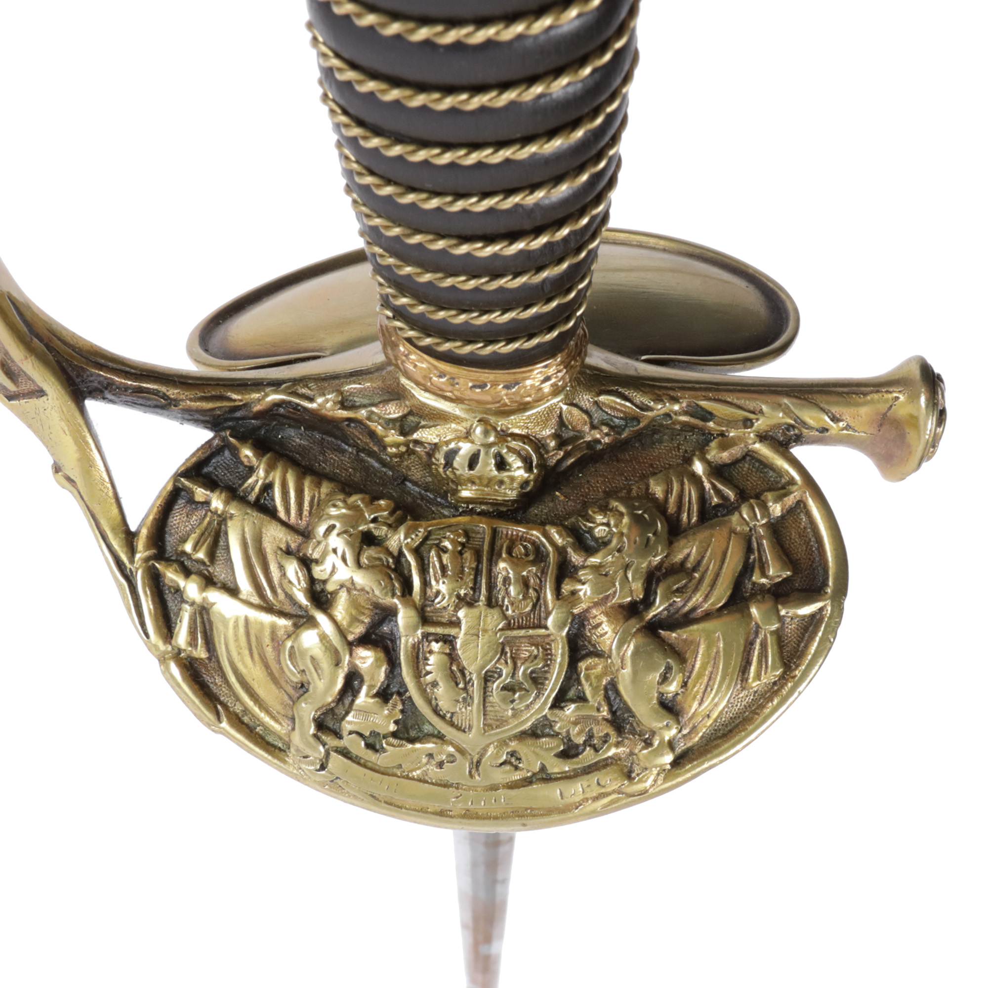13. Spadă de ceremonie cu teacă, ofițer de poliție, garda decorată cu stema Regatului României, perioada domniei Regelui Carol I