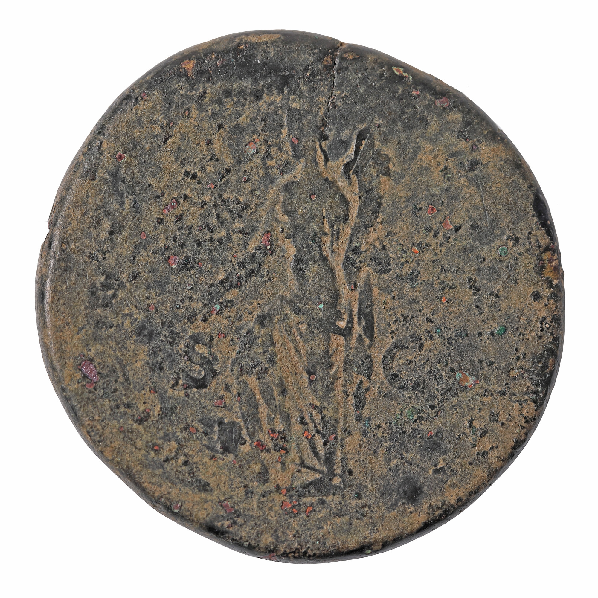 35F. Monedă Sestertius, Traian, tip Pacea cu piciorul pe dac, 107 e.n.