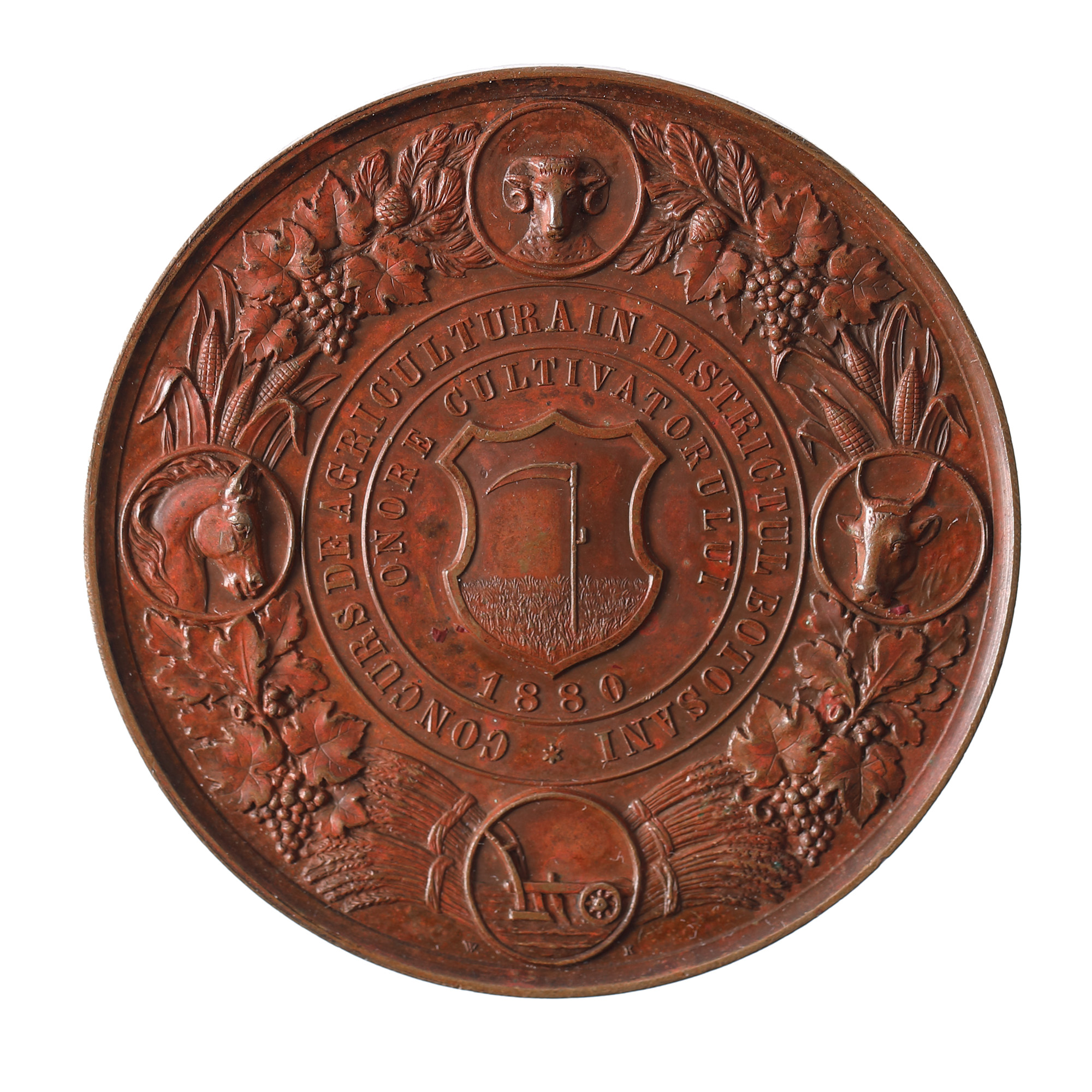 218. Medalia ”Concursul de agricultură în districtul Botoșani - Onoare cultivatorului”, gravor Wilhelm Kullrich, 1880