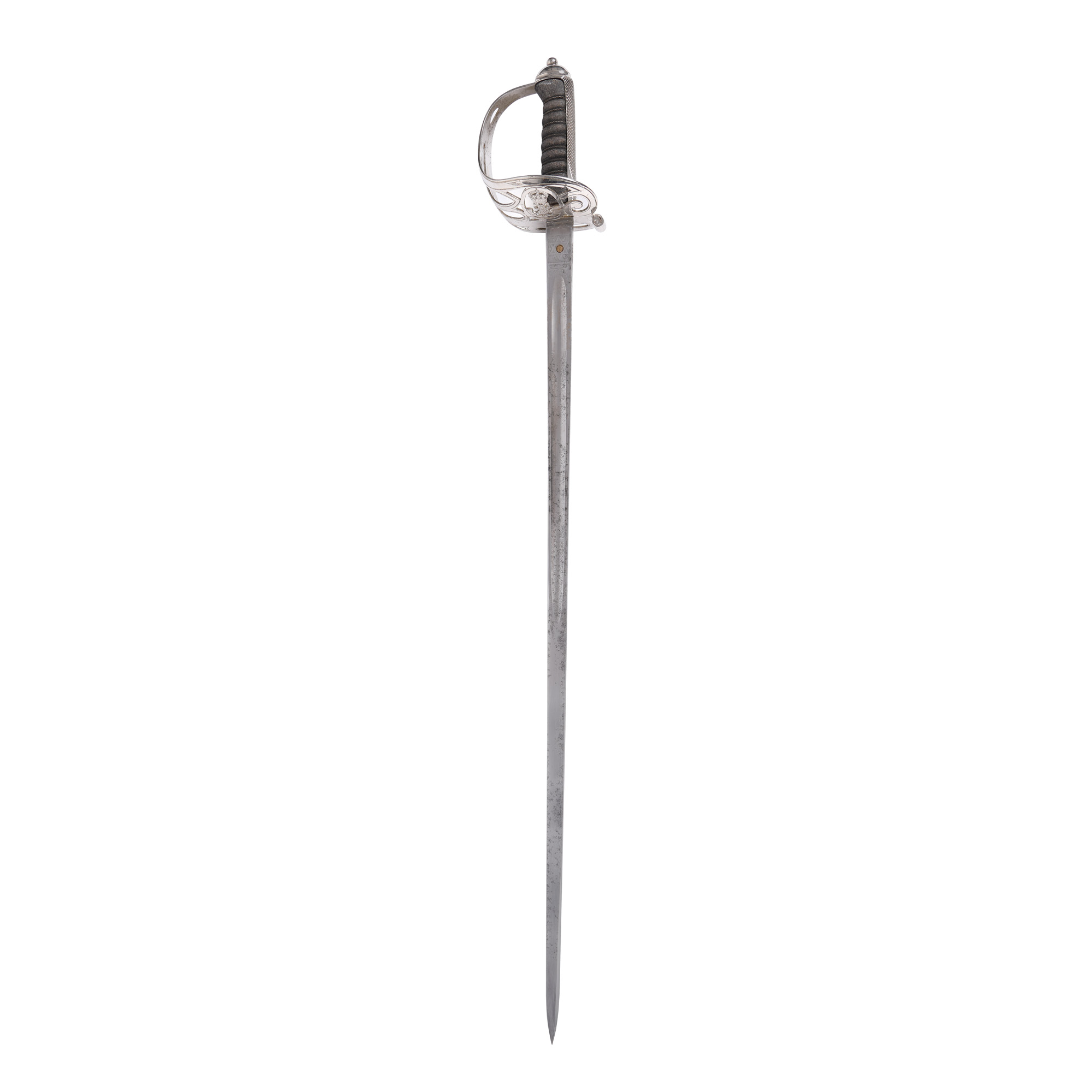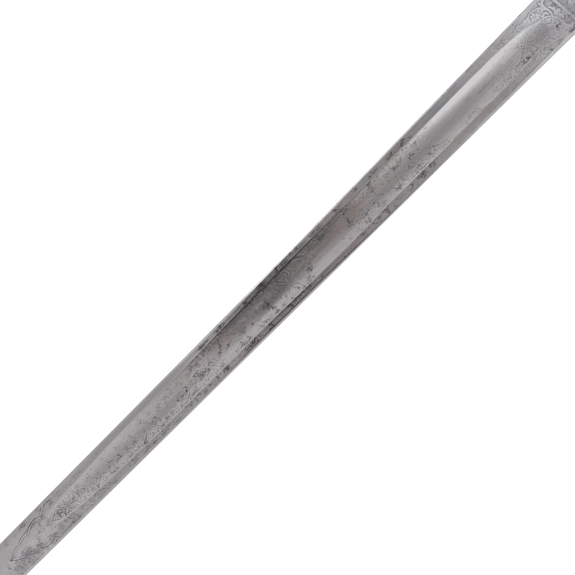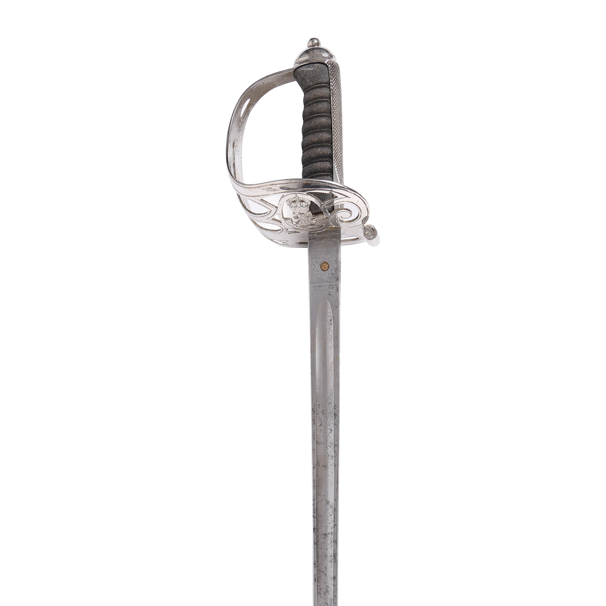 185. Sabie, ofițer britanic, Regimentul de pușcași, cu teacă, model 1822, lama gravată cu elemente vegetale și cifrul Regelui George V, perioada Primului Război Mondial
