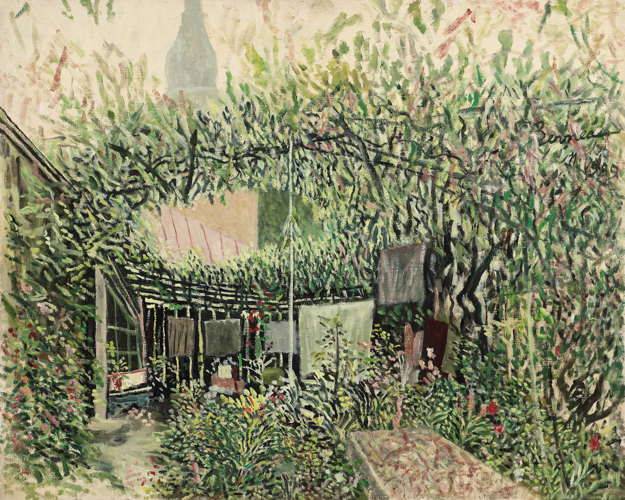 Numele lui Horia Bernea este profund legat de ”Școala de la Poiana Mărului”. Istoria sa se juxtapune cu istoria așezării rurale, iar anii petrecuți aici în copilărie îl vor convinge să revină la maturitate în satul care i-a servit drept leagăn. Artistul a fost personalitatea centrală a grupului care se reunea adesea să picteze în mica localitate din apropierea Brașovului. Preluând modelul internațional al Școlii de la Barbizon sau al celei de la Fontainebleau, Poiana Mărului s-a dovedit a fi prolifică pentru creația artiștilor care obișnuiau să își așeze șevaletul pe dealurile sale. ”Satul primordial”, așa cum este amintit de către critici, le oferea artiștilor liniște și un pretext de eschivare de la agitația urbană. Însă această agitație s-a transpus, în opera lui Bernea, într-o serie dedicată Grădinilor. Picturile înfățișând grădini sunt inconfundabile. Artistul lucrează în manieră divizionistă și își separă culorile într-o pleiadă de linii scurte, care alăturate creează acea armonie compozițională pe care Bernea a căutat să o redea în întreaga sa operă. În decorul exuberant, identificăm grădini brăzdate de ceruri senine sau de nori care anunță ploaia. Cu o abordare imprevizibilă, artistul schițează grădini în care distingem cu ușurință arhitectura spațiului de locuit. Natura apare uneori îmbrăcată în verde crud, iar alteori în nuanțe mai închise. Motivele casnice sunt și ele nelipsite. Fie că apar răzleț, fie că devin un punct focal, frânghiile încărcate cu rufe completează seria lui Bernea. Ghivece colorate și mese goale sau încărcate întregesc, armonios, compoziția finală.