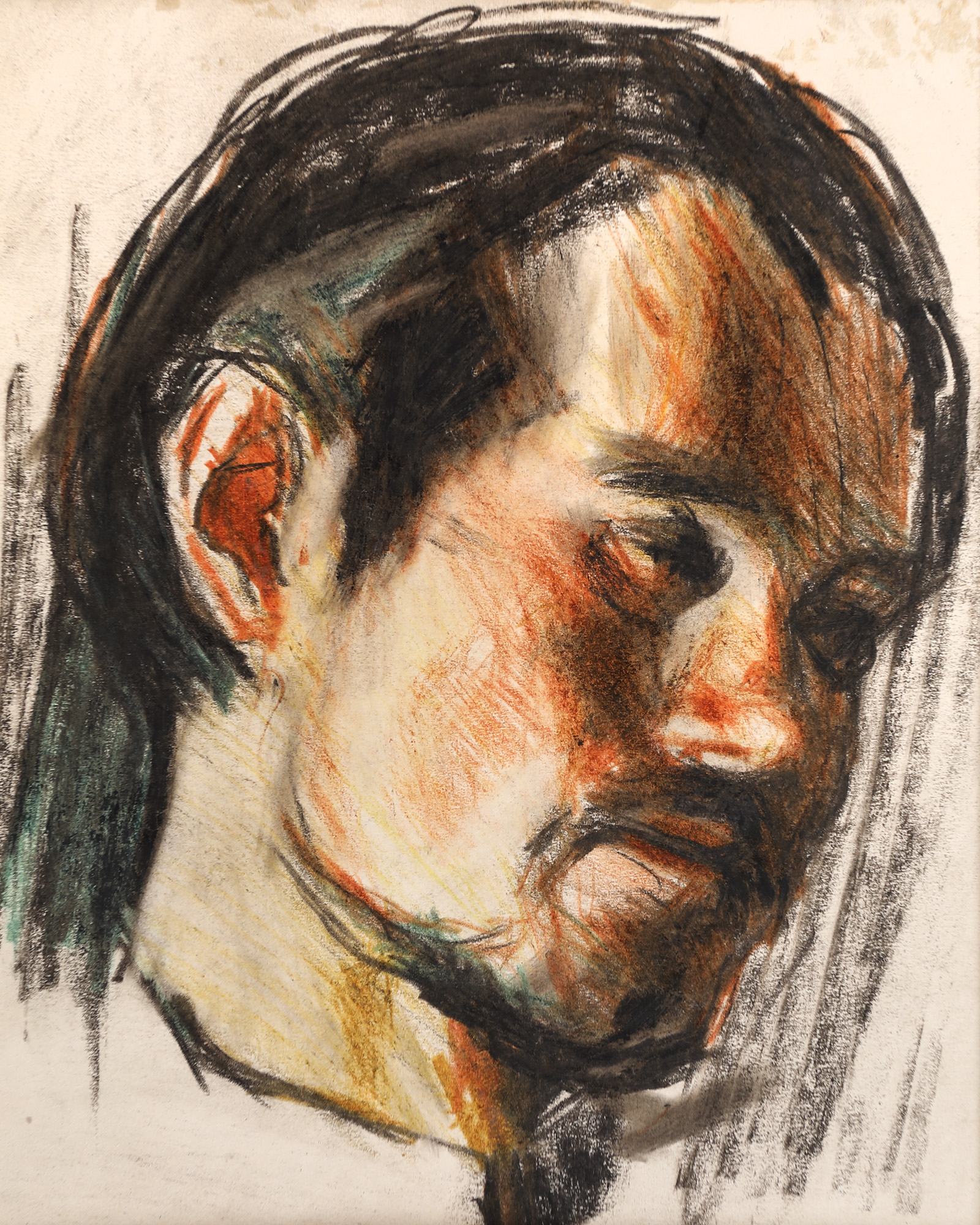 creioane colorate, cărbune și accente de acuarelă pe hârtie lipită pe carton