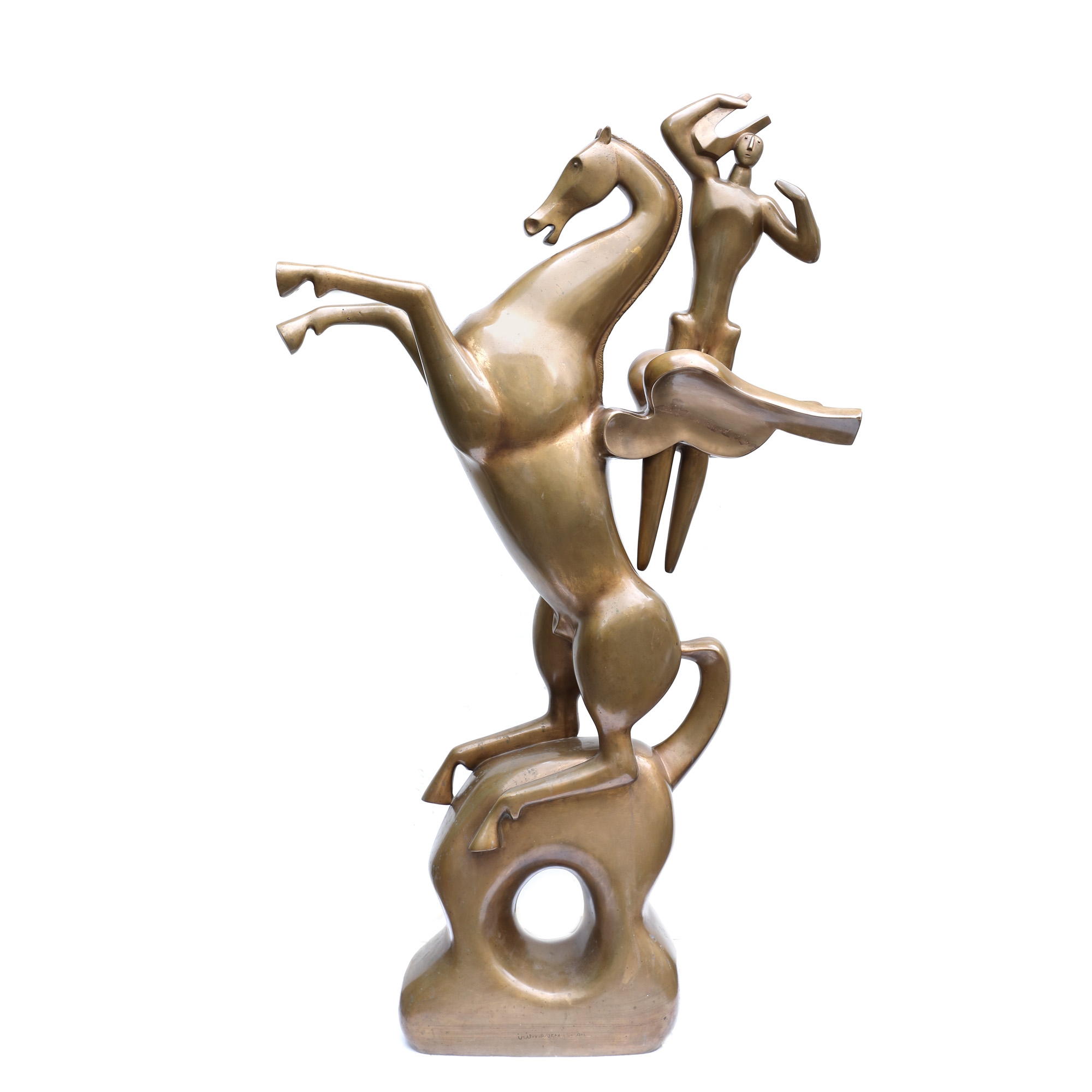 Adept al curentului realist, Ion Irimescu respinge categoric orice urmă de abstractizare în opera sa. Realizează cu precădere o sculptură de postament, adecvată interioarelor și preia atât din particularitățile profesorului său, Dimitrie Paciurea, cât și din cele ale sculptorului Oscar Han, pe-al cărui atelier îl frecventează adesea. Convins că secretul sculpturii stă în exerciții necontenite de desen, dedică o amplă secțiune a creației sale studiilor în creion a ceea ce avea să devină, mai târziu, material sculptural. În opera sa se remarcă predilecția către figura umană. Iirmescu excelează în realizarea unei vaste serii de portrete și autoportrete, pe care le prezintă atât în expozițiile din țară, cât și internațional, la manifestări precum Bienala de la Veneția. Prima perioadă a creației sale corespunde dorinței de a ilustra teme mitologice și legende, însă va relua aceste motive și mai târziu, după cum putem observa și în opera de față. Dacă în tinerețe această perioadă a corespuns unei etape de căutări, în 1973, când încheia lucrul la ”Pegas și Apollo”, avea deja răspunsuri. Alătură, cu priceperea unui virtuoz, două personaje importante ale mitologiei antice. Pegas, calul înaripat de origine divină a cărui asceză e amintită în miturile grecești, este încununat de prezența lui Apollo, zeitate multipotentă, aflată mai presus de legea clericală, care punea la dispoziția oamenilor, prin intermediul profeților și al Oraculului, cunoștințele sale despre viitor. Irimescu sculptează legende în bronz și reiterează pentru publicul său miturile care au stat la baza conturării unor întregi comunități.