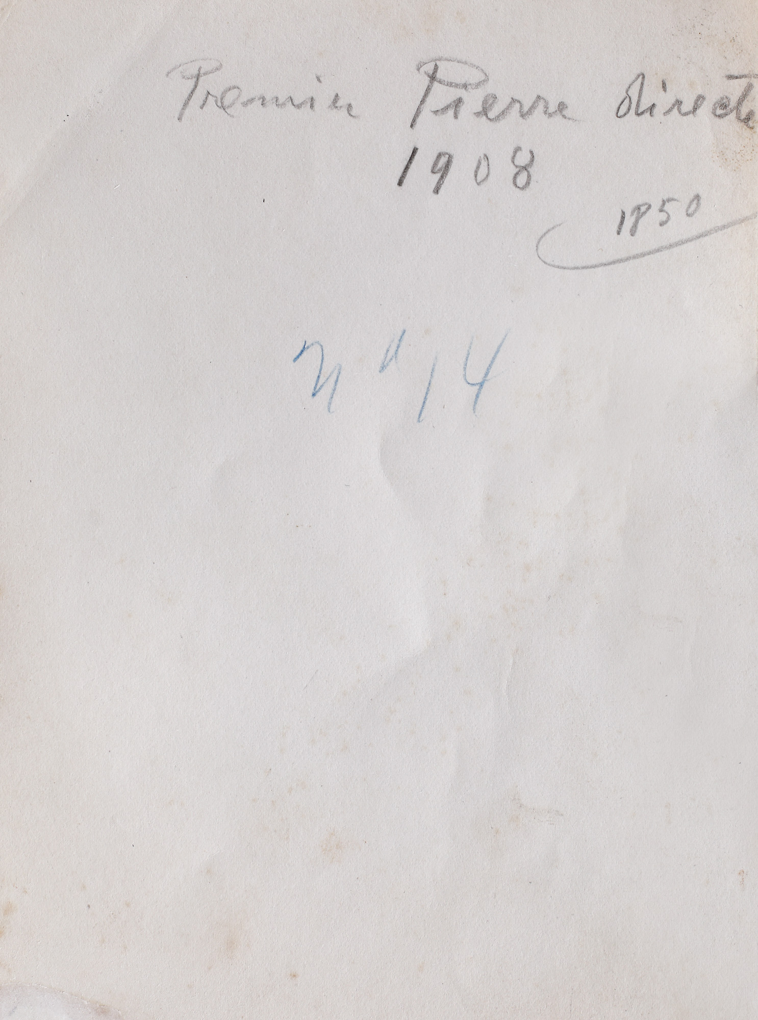 intitulat, datat și notat pe verso, olograf, în creion cu mină de plumb, "Premiere pierre directe, 1908, 1850"; notat pe verso, în creion albastru, "No. 14"