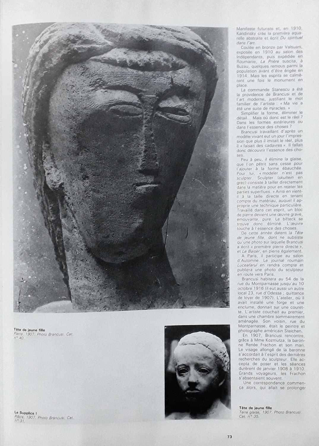 Odată cu părăsirea atelierului maestrului Rodin (27 aprilie 1907), sculptorul Brâncuși avea să pornească pe propriul drum, pe parcursul căruia arta sa avea să devină o artă liberă. Rupt de orice influență, Brâncuși începe să lucreze slobod, redescoperind dimensiunile umane și semnificațiile acestora printr-o nouă tehnică - „taille directe”. Adânca sa chibzuință pentru simplificarea formei, sensibilitatea pentru plasticitatea materiei îl vor conduce pe Brâncuși la o strânsă legătură cu legile creației și ale naturii. Primele lucrări realizate în noua tehnică aveau să fie „Sărutul”, „ Rugăciune”, „Cumințenia pământului”, „Muză dormind”, precum și „Cap de fată (Première pierre directe)”. Dorind să își conserve creația, Brâncuși începea acest demers încă din anul 1905, recurgând la fotografie. Întâlnirea din 1907 cu pictorul și fotograful american Edward Steichen (1879 -1973), care îi va rămâne prieten apropiat, precum și întâlnirea de mai târziu cu artistul vizual Man Ray (1890-1976) din 1921, aveau să reprezinte un rol important în ceea ce prevedea documentarea creației sale. Niciodată realizate la întâmplare, fotografiile lui Brâncuși sunt rezultatul unei cercetări conștiente și dirijate, constituind momente esențiale ale procesului său creativ, precum și un instrument privilegiat de viziune asupra operei și mediului său de lucru. Document de lucru dar și instrument de viziune, fotografiile lui Brâncuși ne încurajează să îi privim opera ca și prin ochiul său, făcându-ne cunoscut modul în care și-ar fi dorit să fie privită. În acest mod, Brâncuși ne invită la o percepție activă asupra operei sale, care poate fi răsfoită ca un jurnal prin intermediul instantaneelor sale, permițând astfel o reînoire a viziunii asupra creațiilor sale. (G.M.)