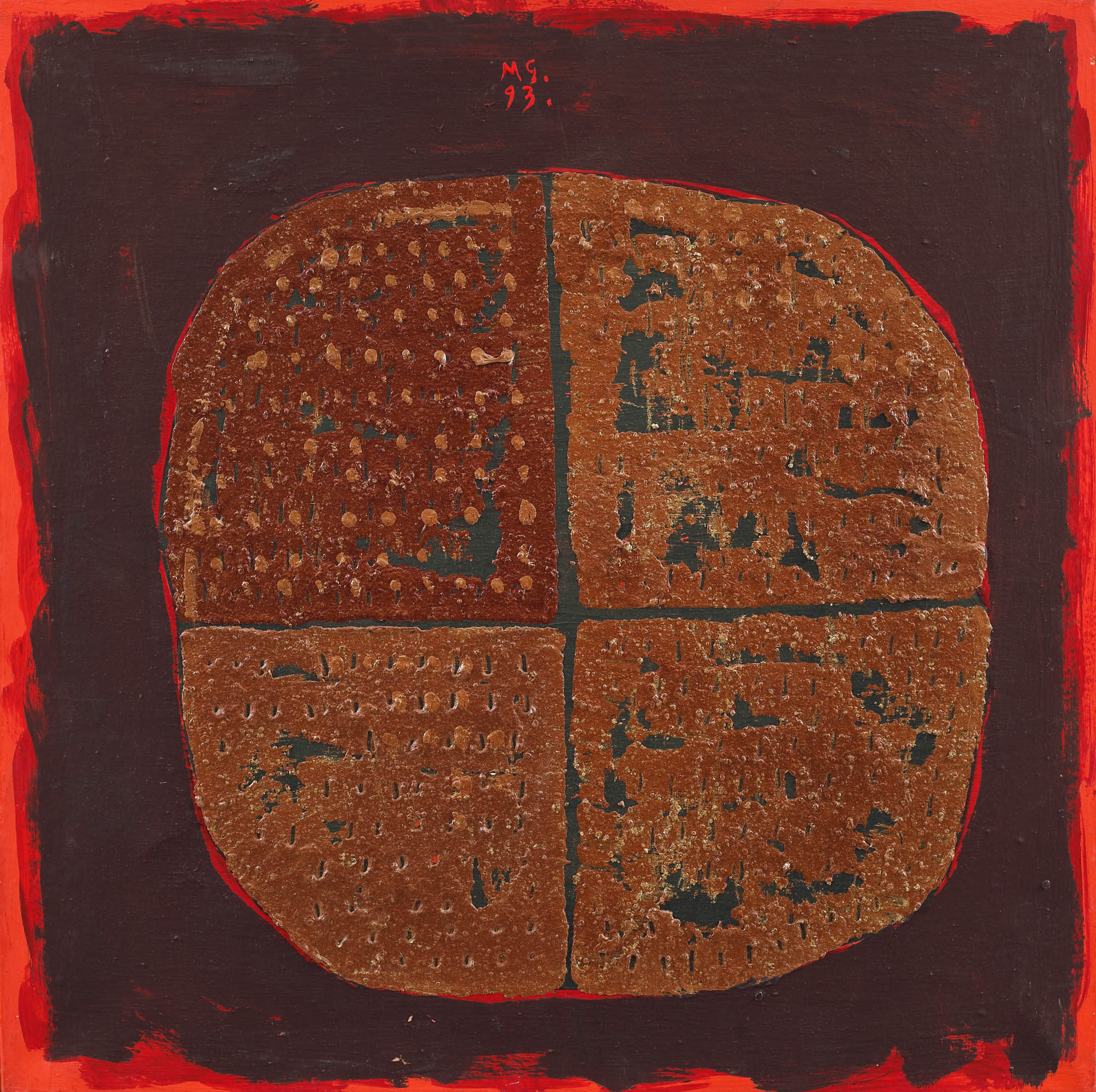 semnat și datat central sus, cu roșu, "MG, (19)93"; semnat, datat și intitulat pe verso, în creion, "Marin Gherasim, 1993, Scut"