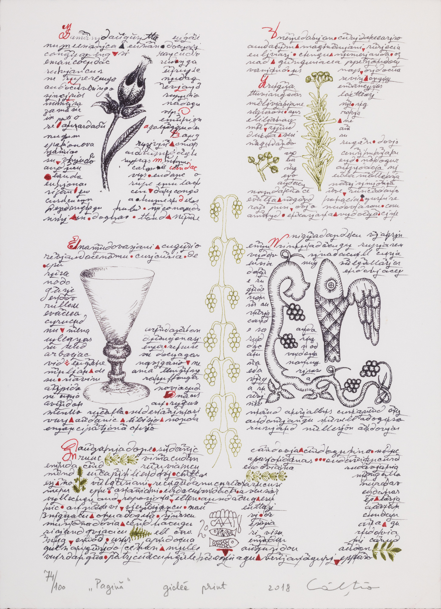semnat, datat, intitulat, numerotat și notat central jos, în creion, "Câlția, 2018, 74/100, Pagină"