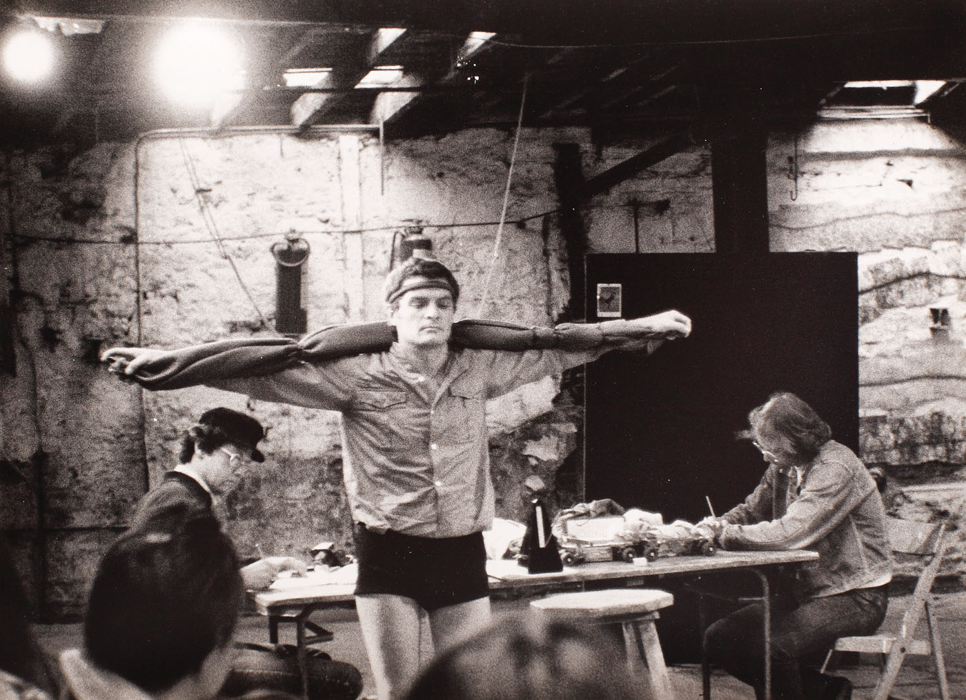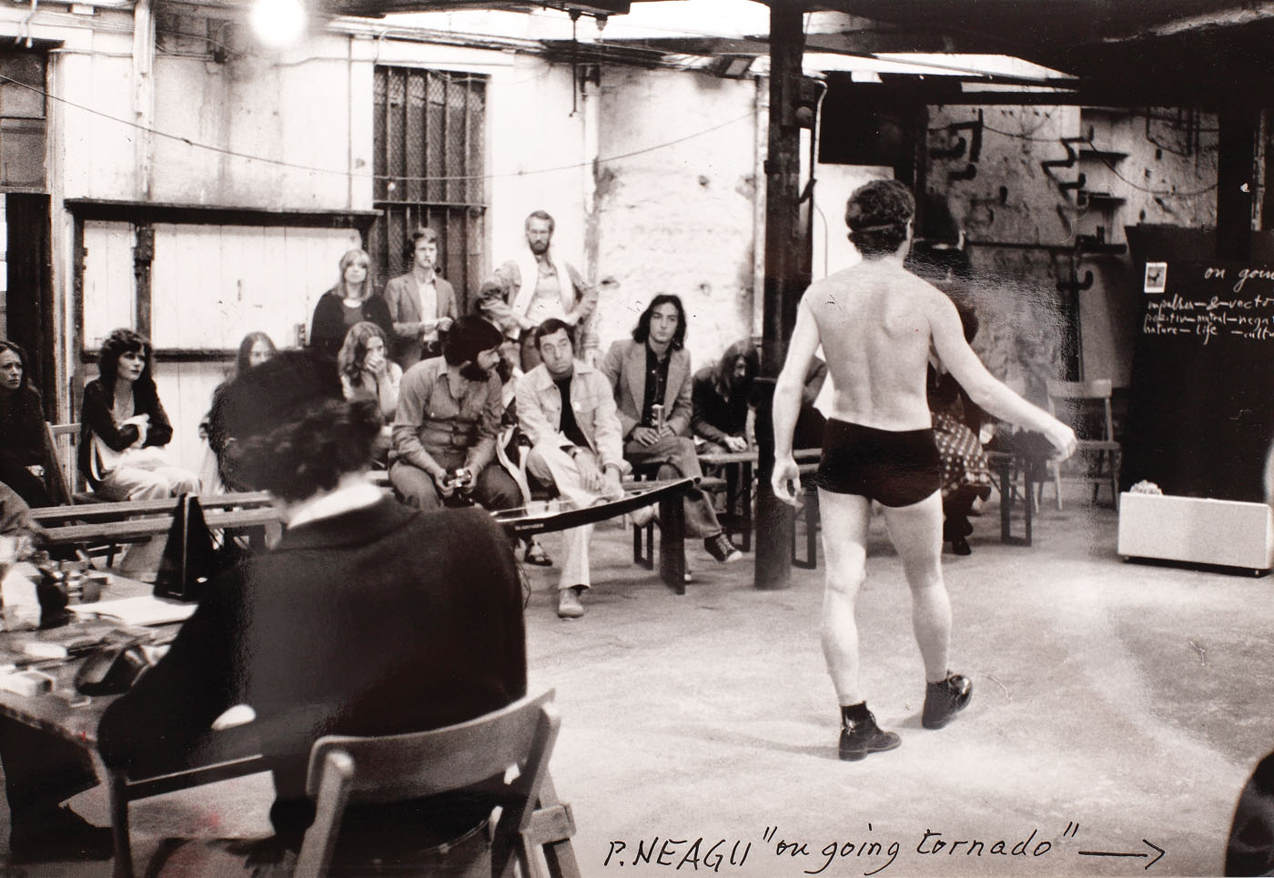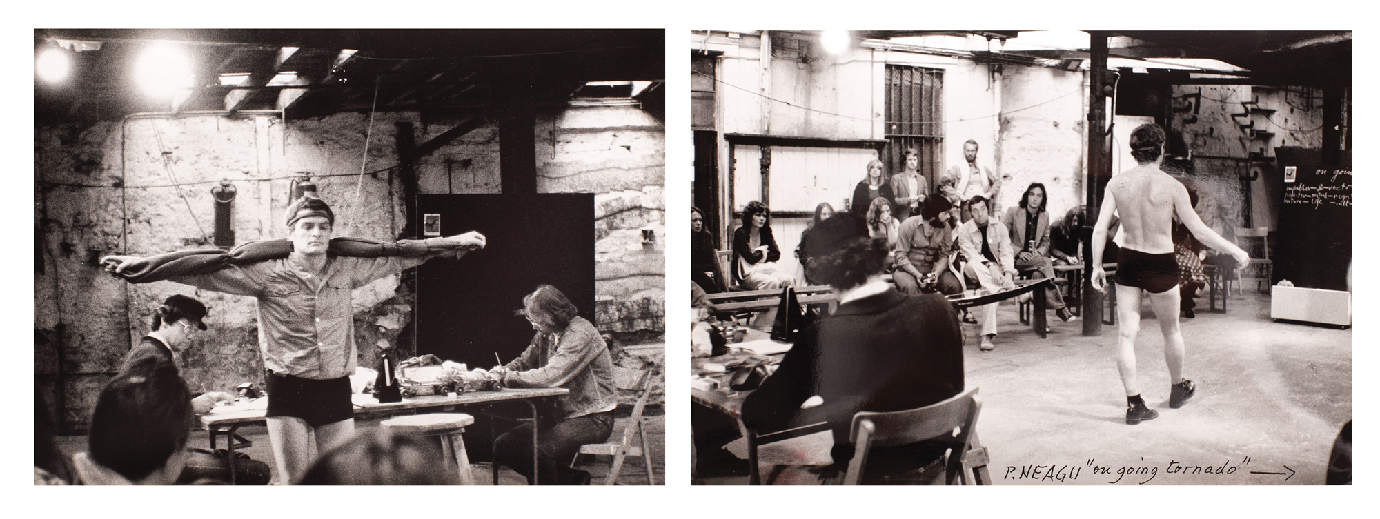 1. notat pe verso, cu negru, "Performance, P. Neagu at the begining of Going Tornado, 1974, Edinburgh, photo 2, Poor house"; ștampilat pe verso, Paul Neagu Estate Romania , respectiv Generative Art Trust; 2. notat dreapta jos, cu negru, "P. NEAGU, On going tornado"; pe verso, notat cu negru, "Paul Neagu, Performance, ED, UK, Scotland"; ștampilat pe verso, "Paul Neagu Estate Romania"