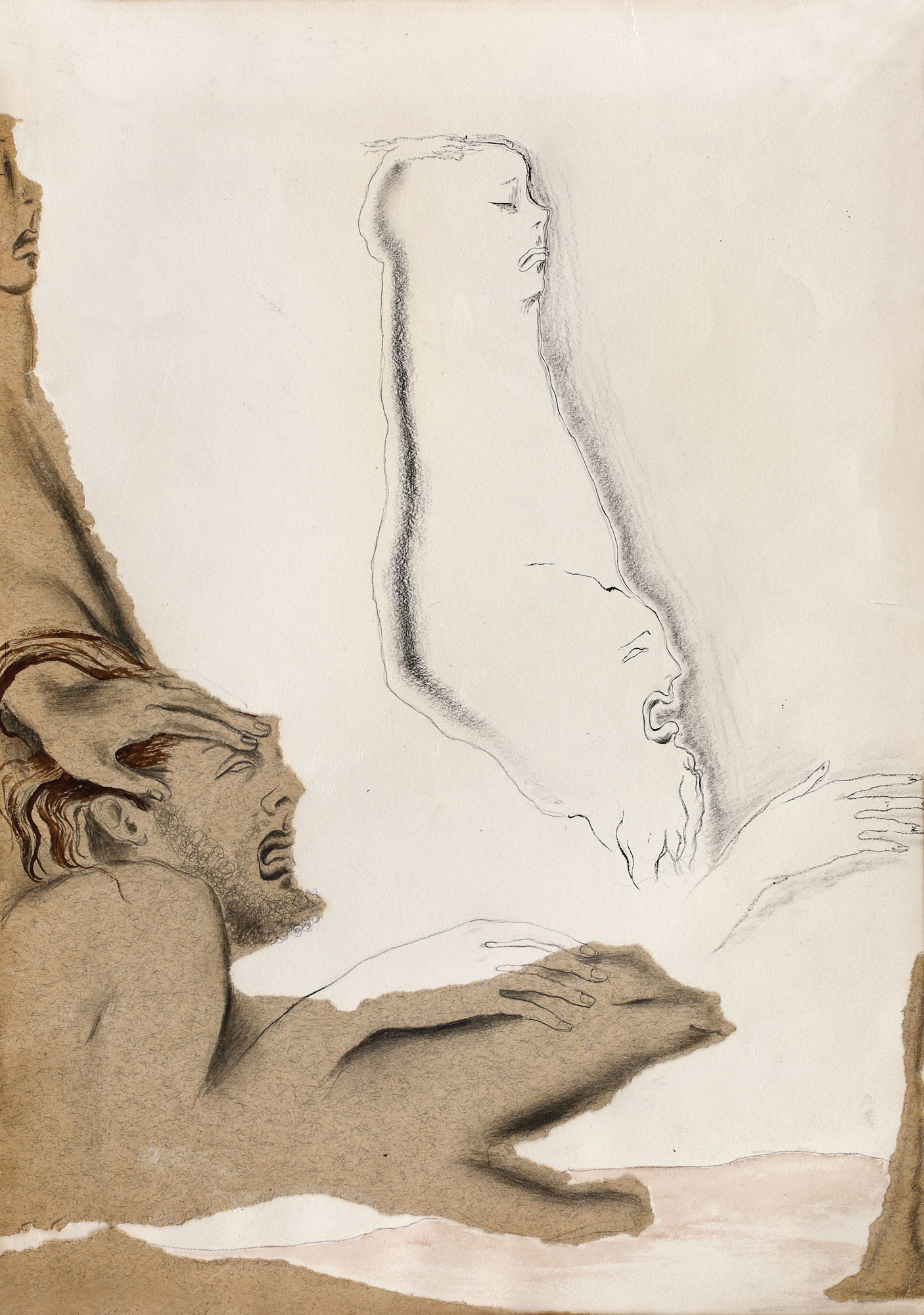 colaj, creion, tuș și acuarelă pe hârtie lipită pe carton