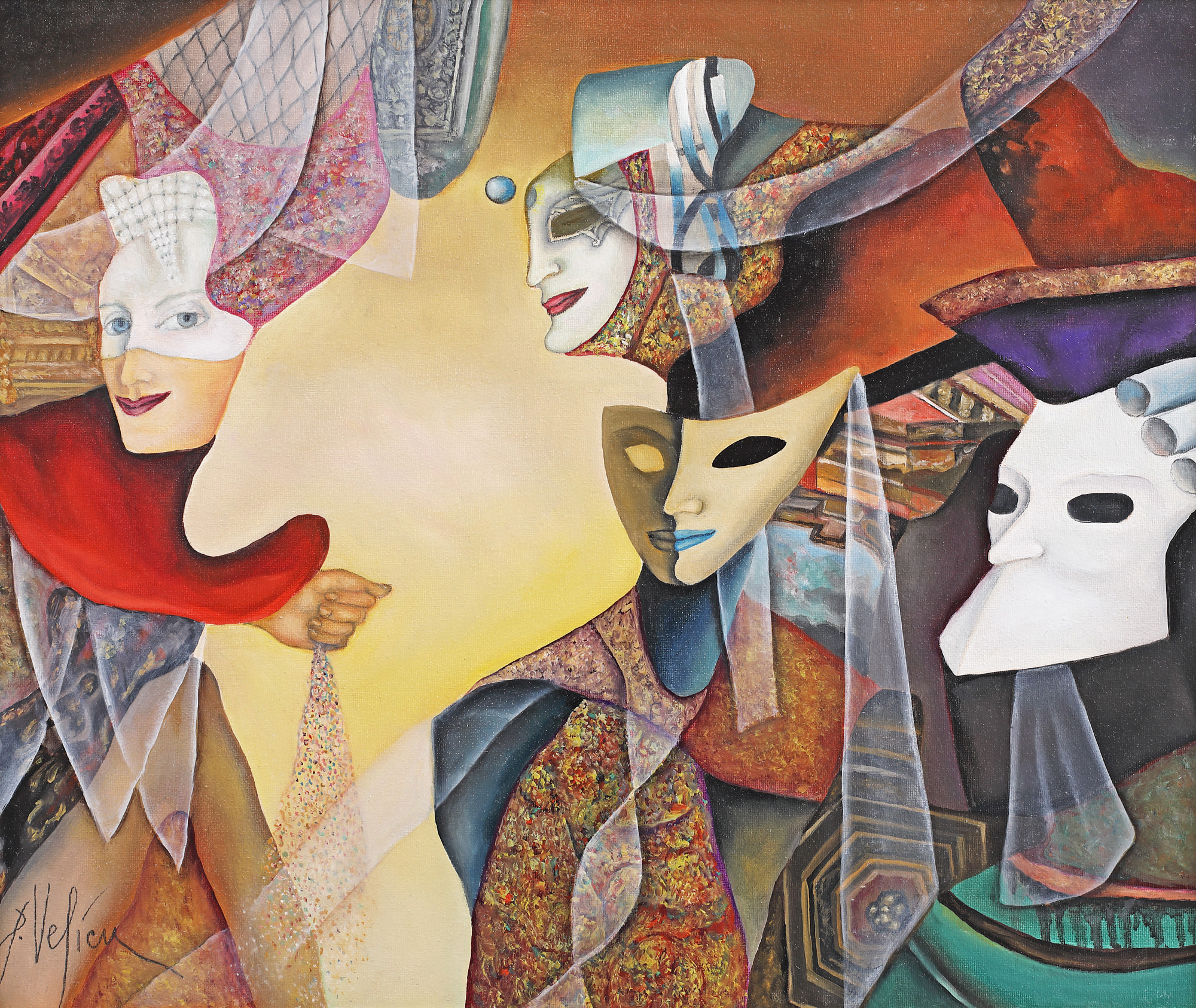 semnat stânga jos, cu negru, "P. Velicu"; semnat, datat, intitulat și localizat pe verso, cu negru, "P. Velicu, Carnaval, 2020, Paris"
